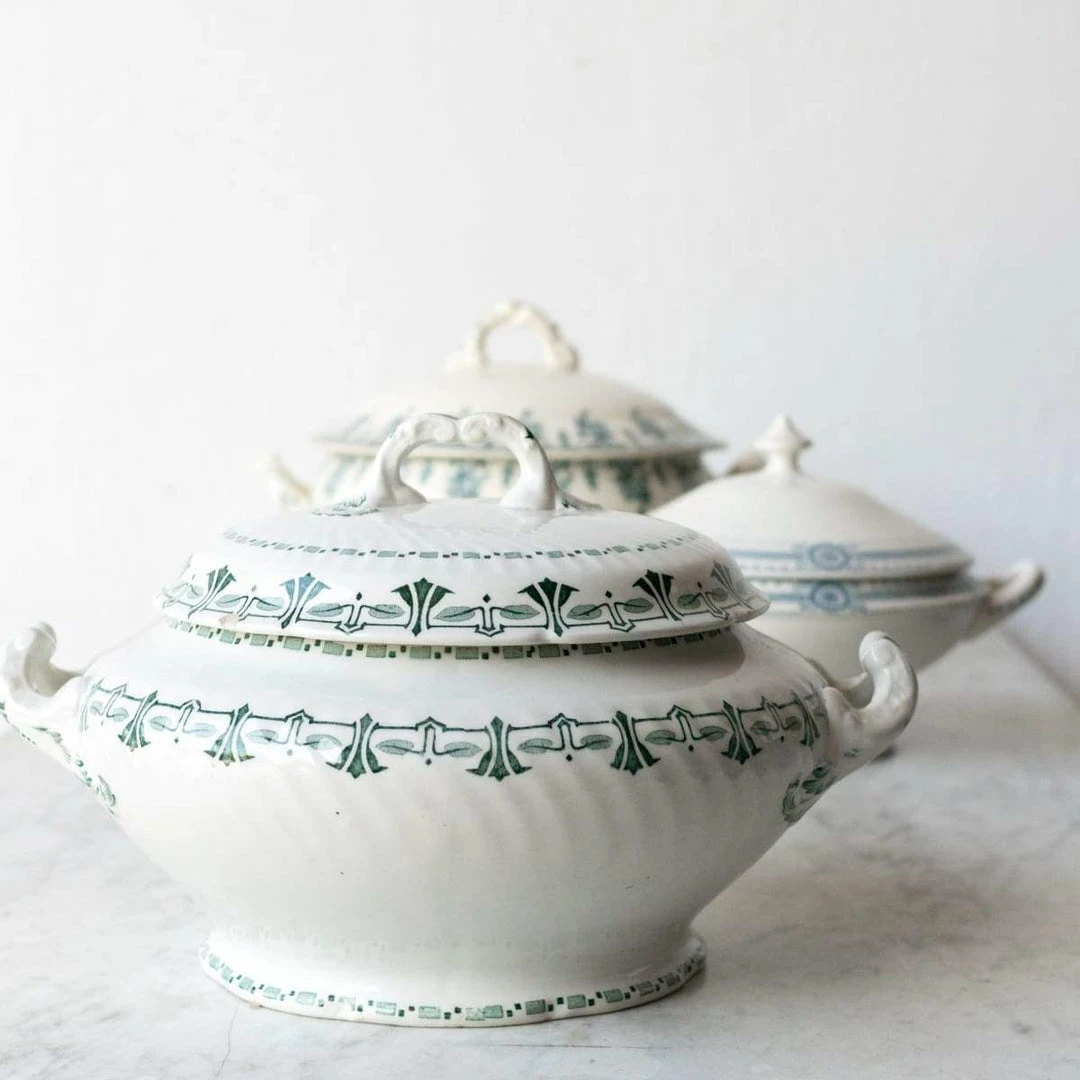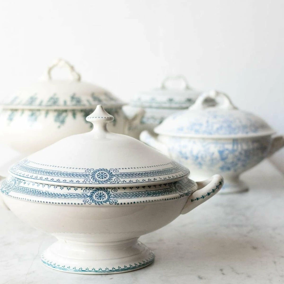 The soupiére is a typically French serving piece. These examples are decorated with a classic French transferware technique.