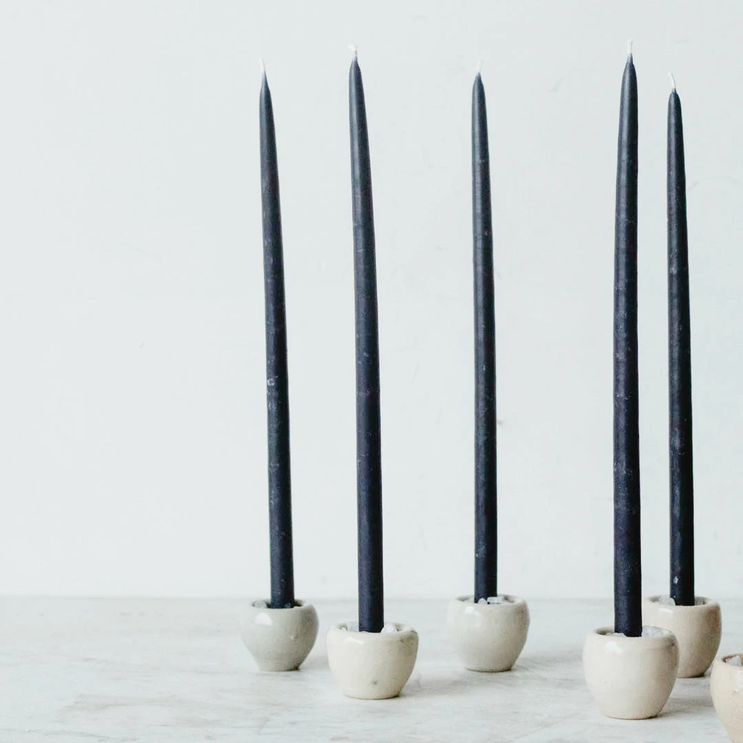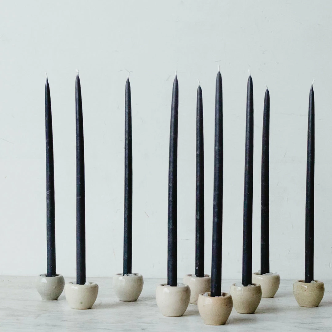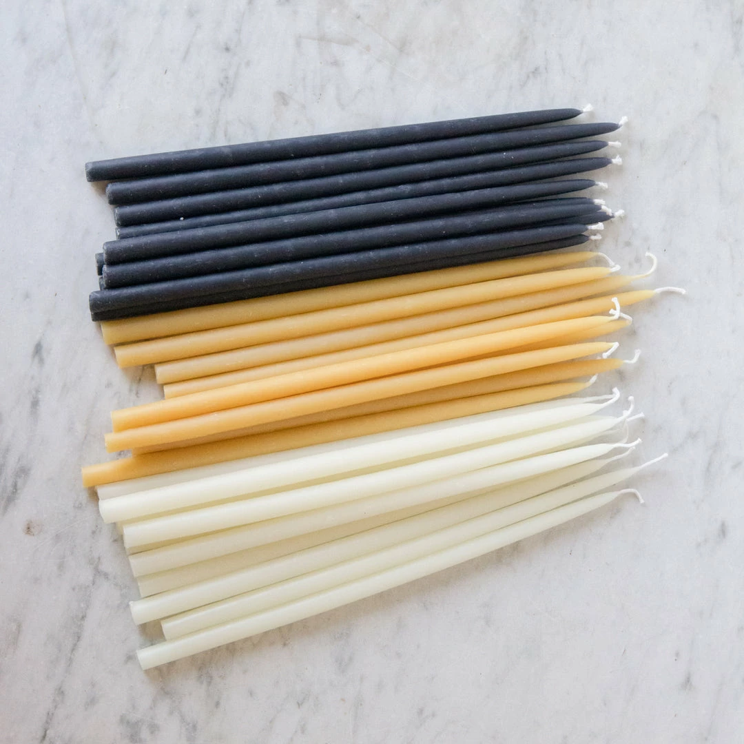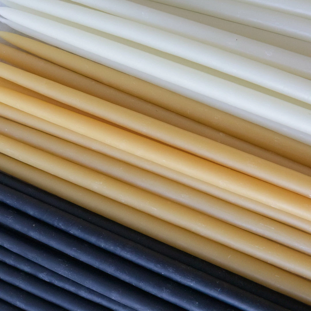 These beeswax tapers burn clean and bright and give off the faintest beeswax fragrance as they burn.