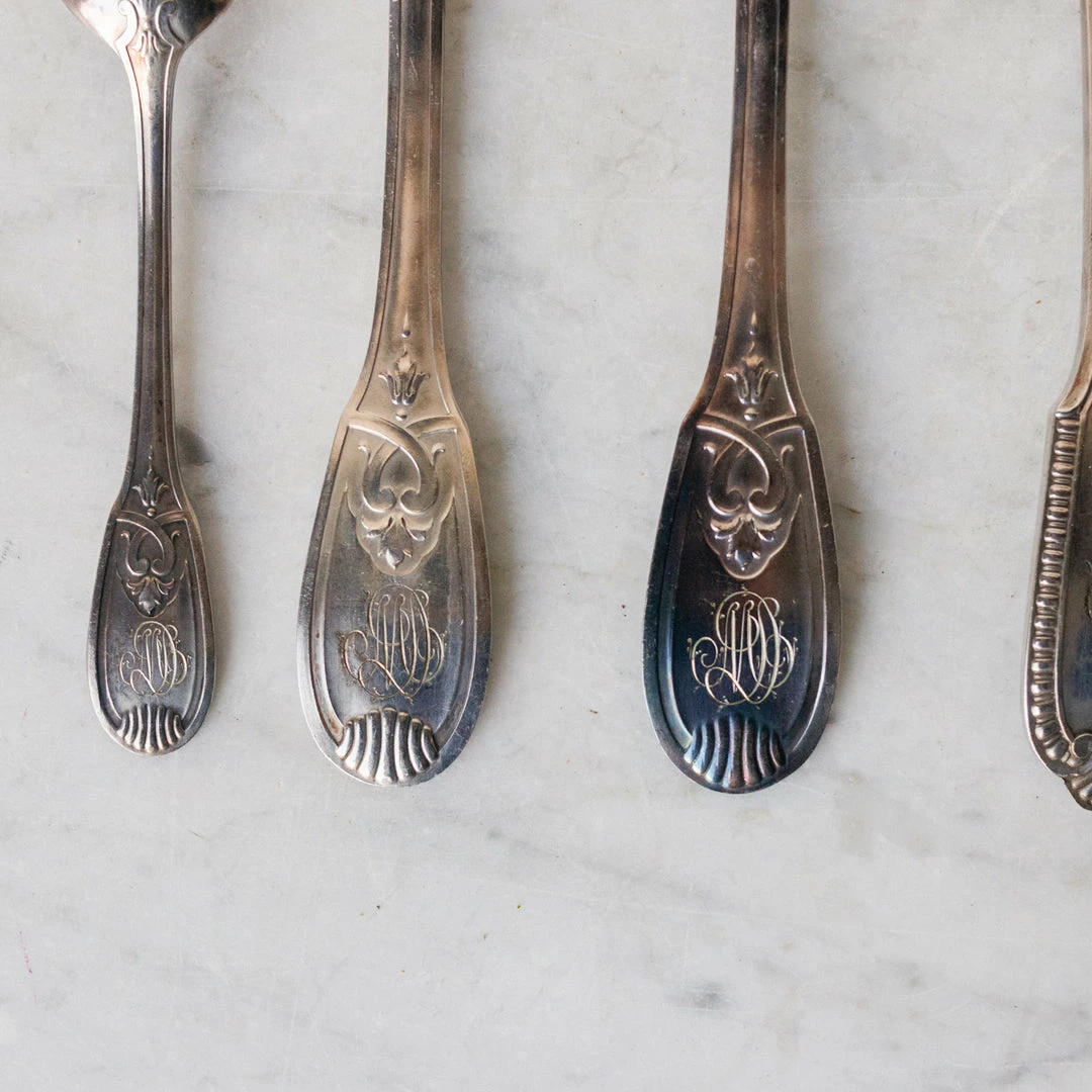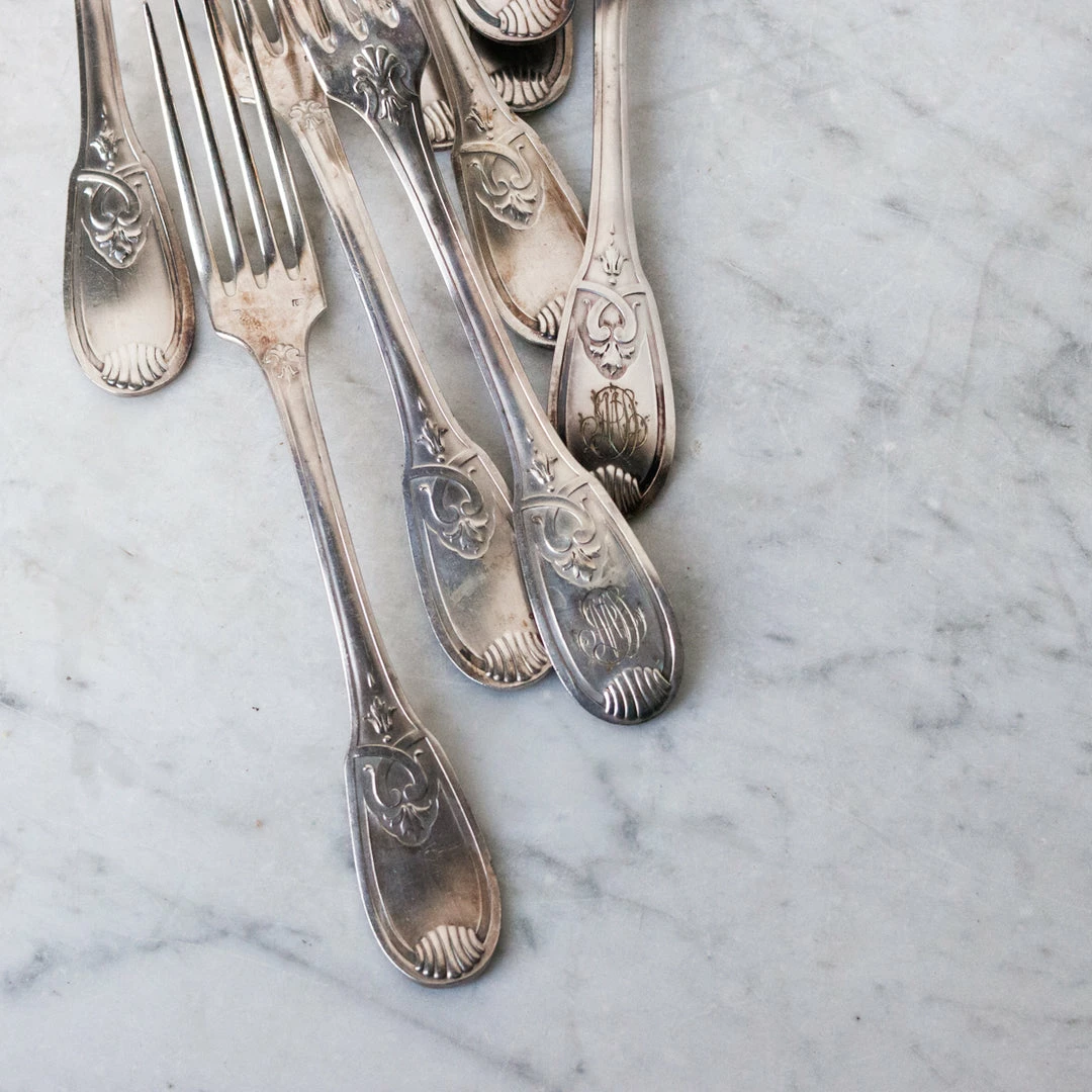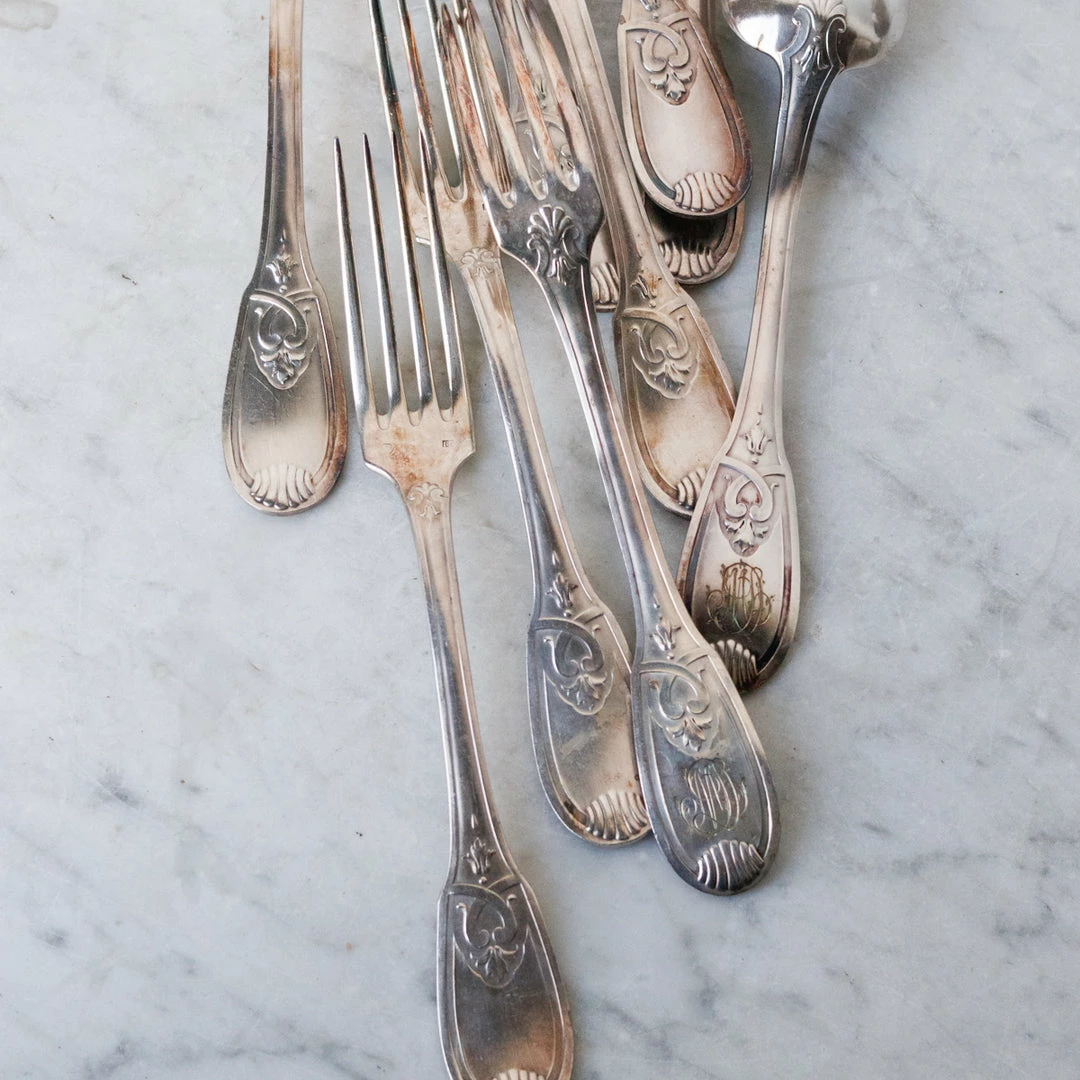 We love keeping our vintage silver in a big glass jar and bringing it out for parties. This set is made up entirely of French pieces, which means heavier pieces, larger European sizing, and forks and spoons decorated on both sides. They’re simply beautiful.