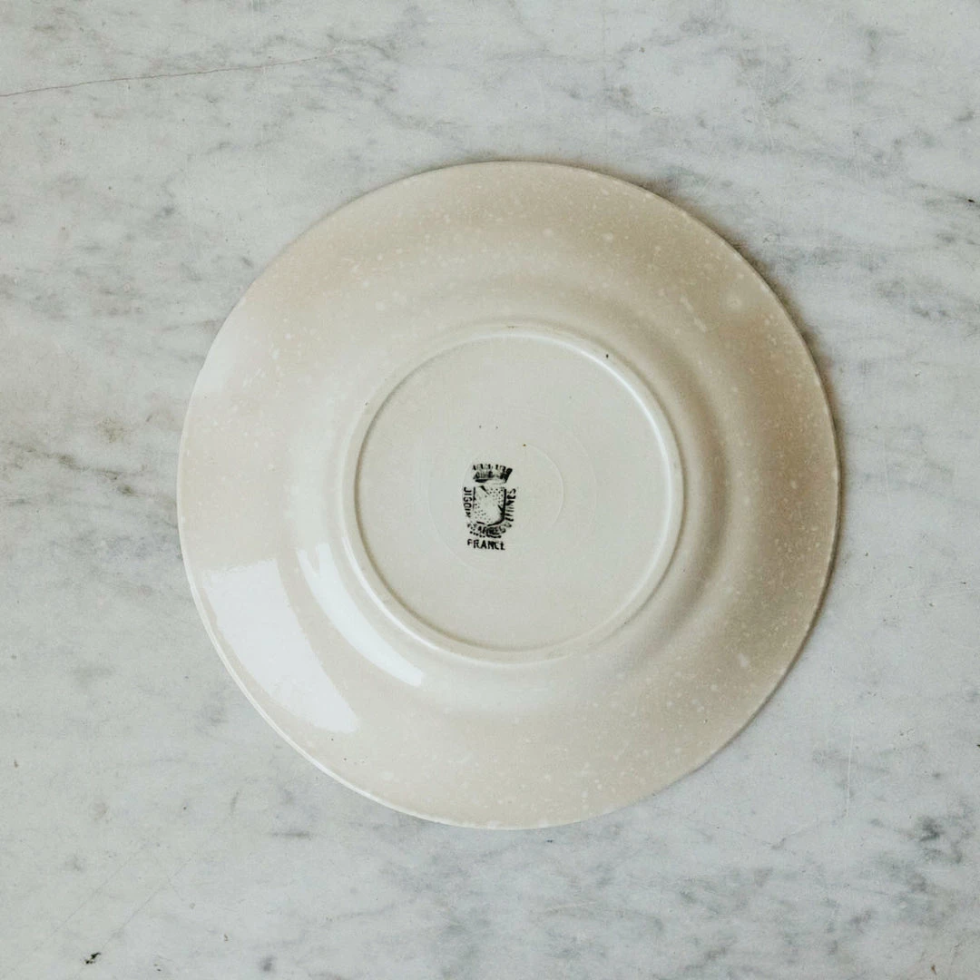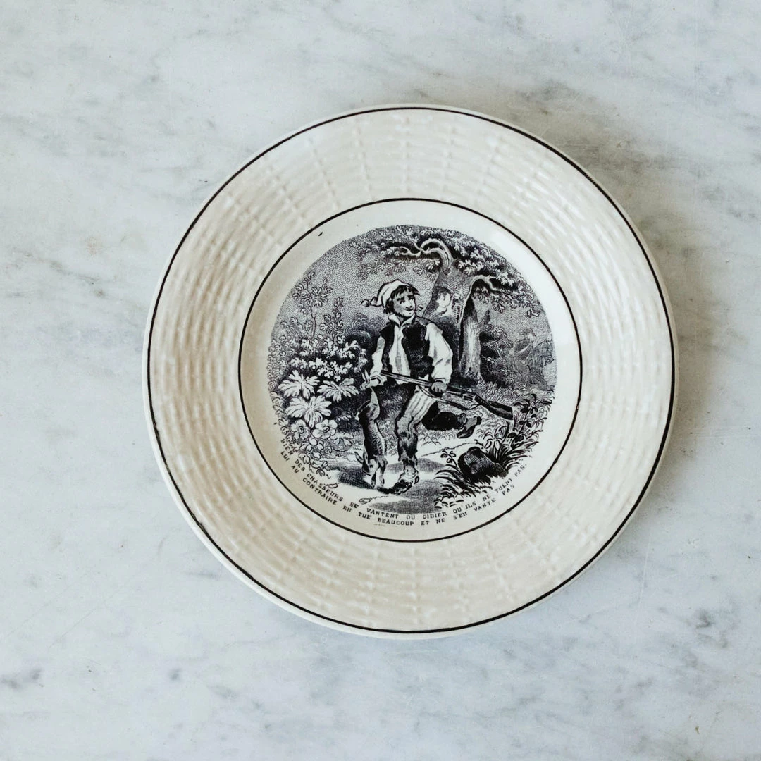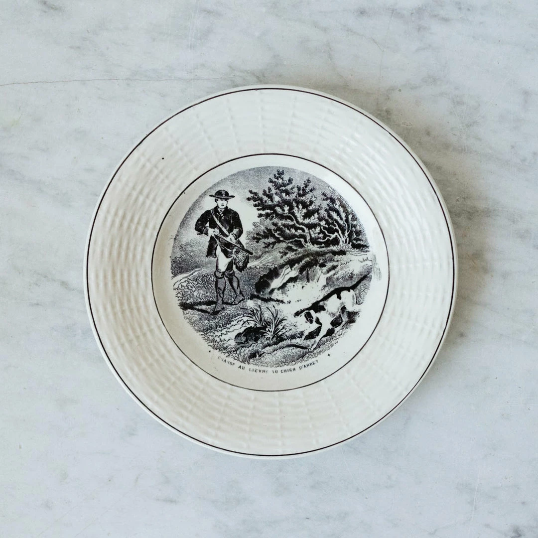We’re constantly collecting French transferware, and while we love an eclectic mix, there is something special about a matched set. These examples are beautifully rendered with a pretty basketweave embossed rim and black center conversation pattern.
