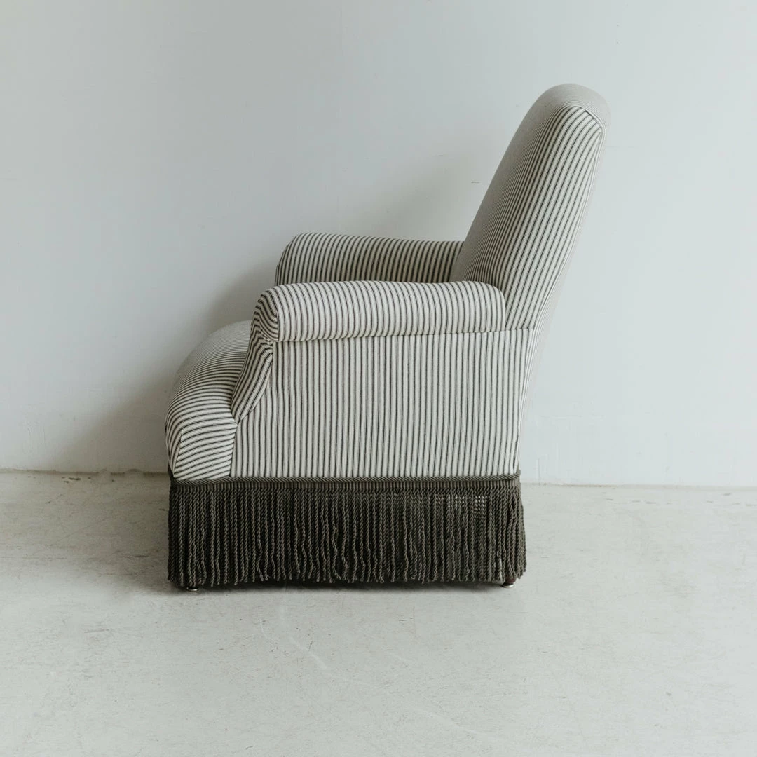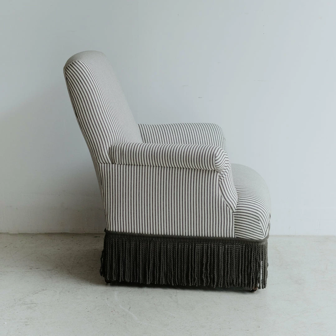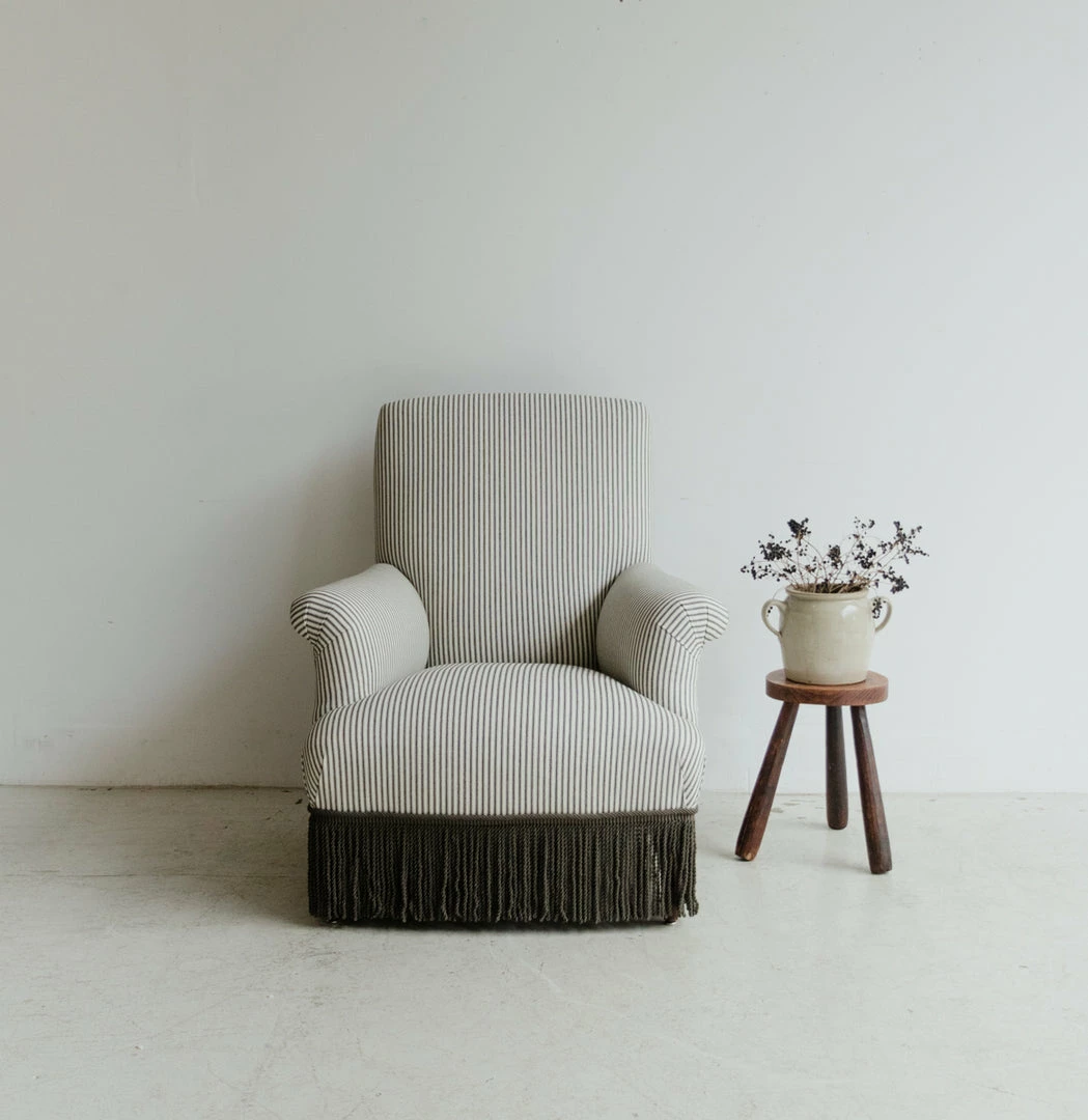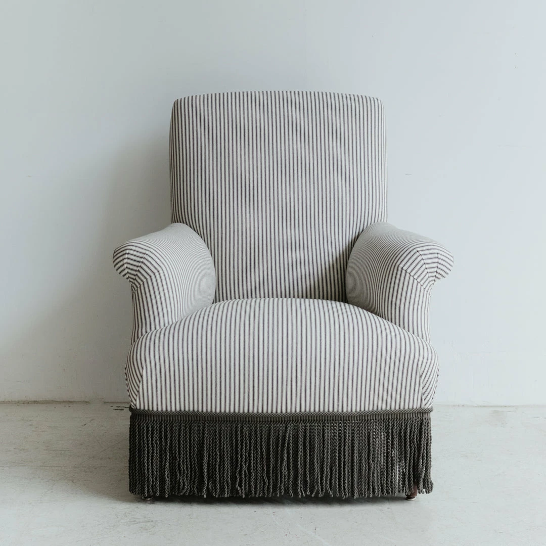 This vintage French armchair has been carefully restored and re-covered in a ticking stripe fabric that gives new life to a well-loved classic.Β We’ve finished it with chic charcoal bullion fringe.Β Β