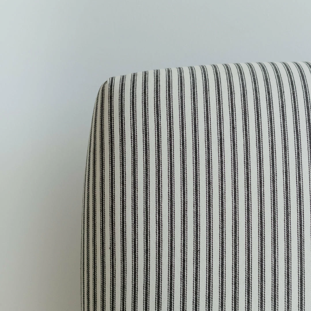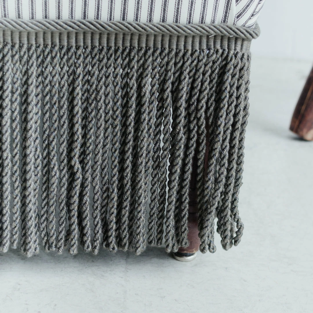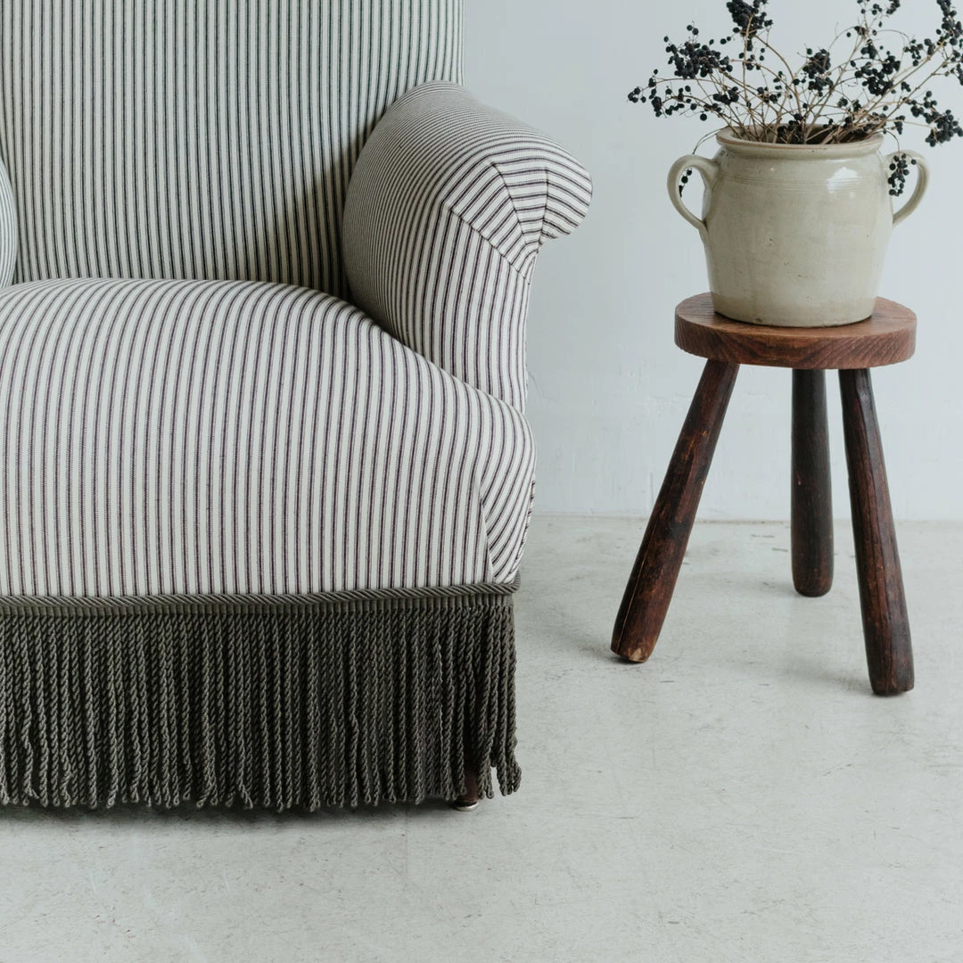 This vintage French armchair has been carefully restored and re-covered in a ticking stripe fabric that gives new life to a well-loved classic.Β We’ve finished it with chic charcoal bullion fringe.Β Β