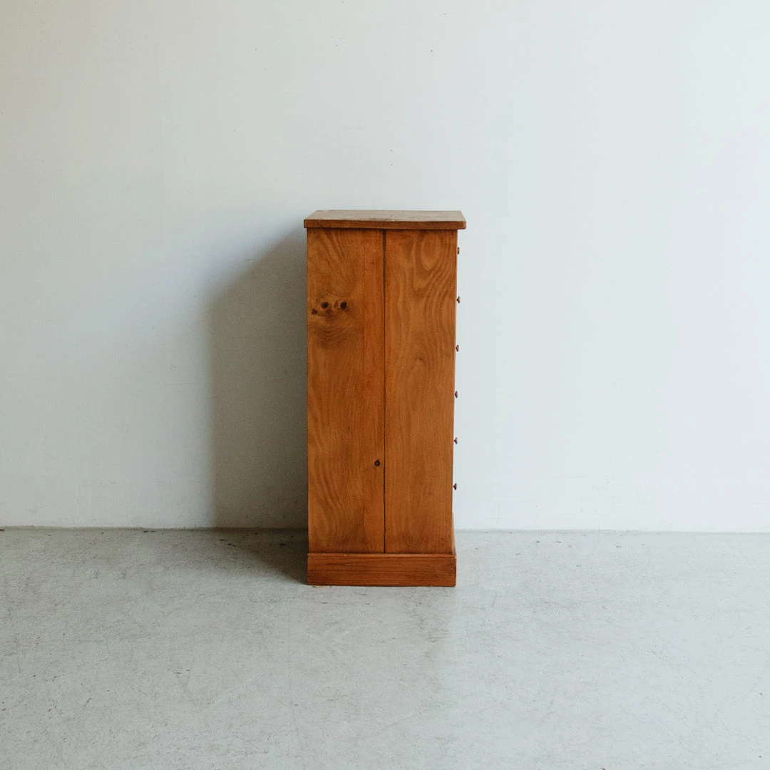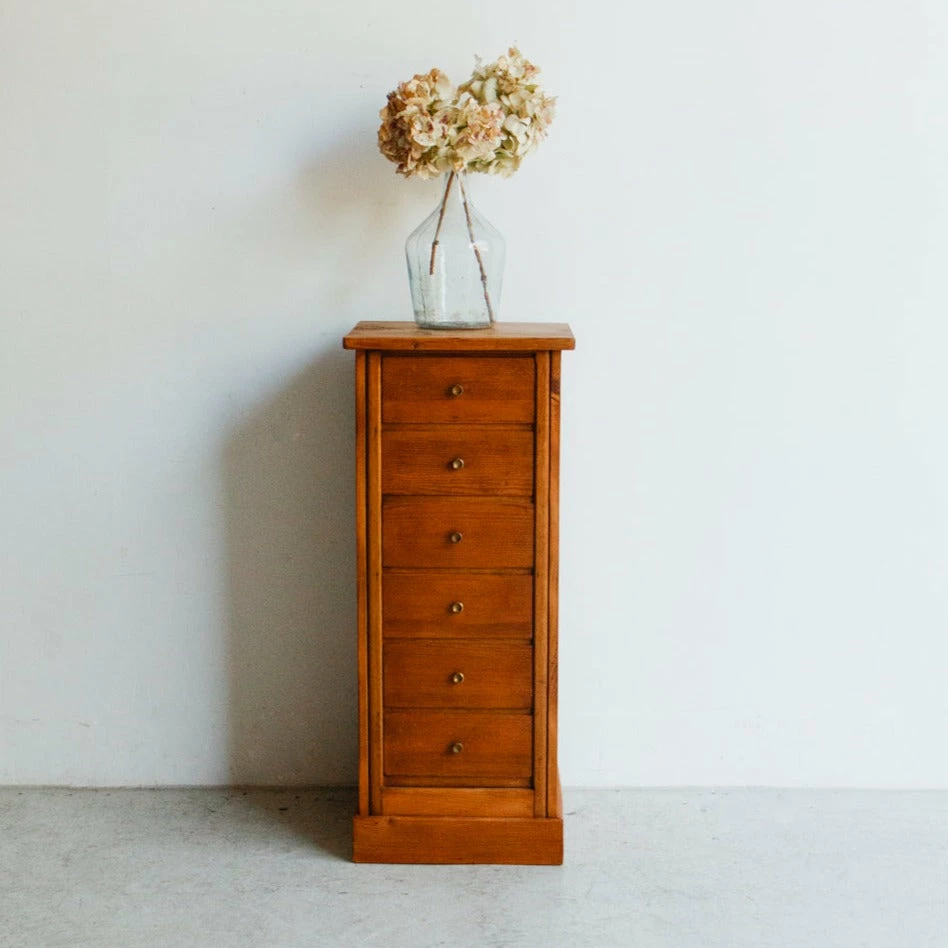 This simple design showcases the beauty of the wood’s grain and tight knots.ย And it’s packed with storage possibilities.ย ย The five drawers can be useful in an entry for all the small things that gather there, or to hide things away in a bath.ย ย