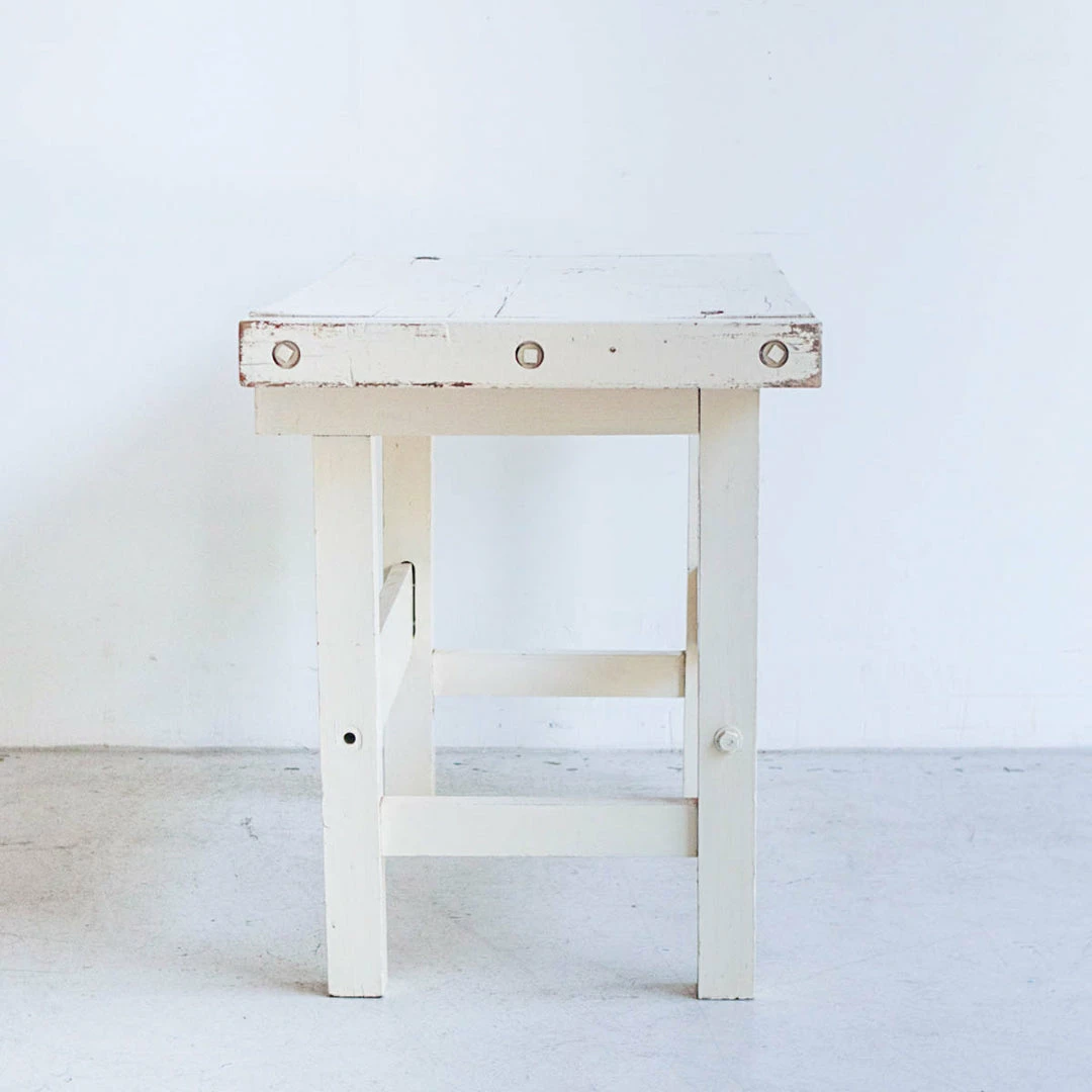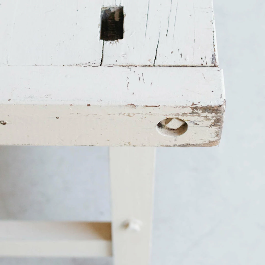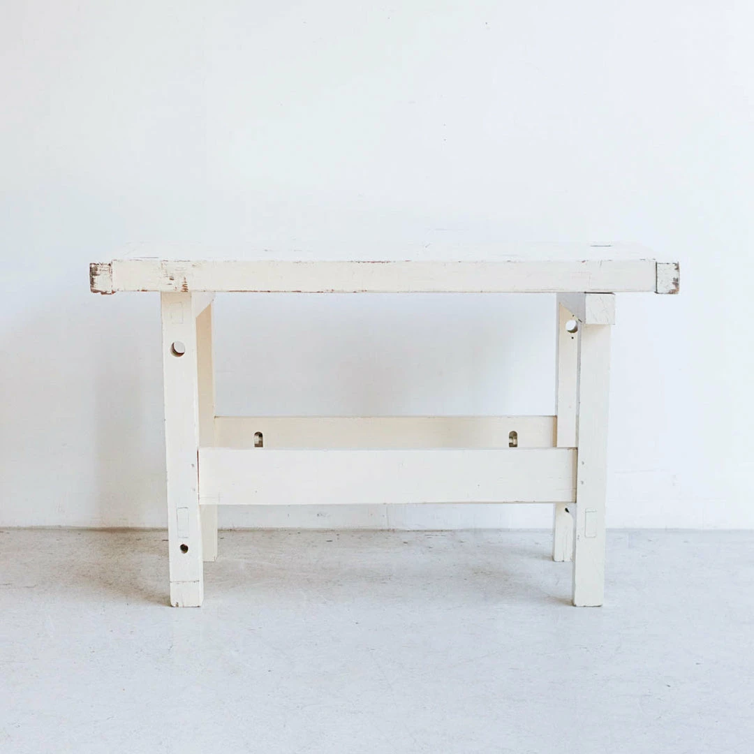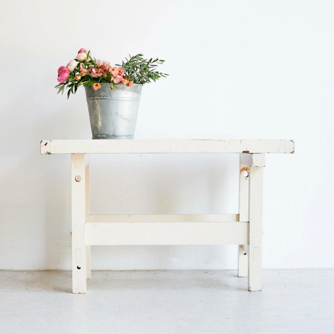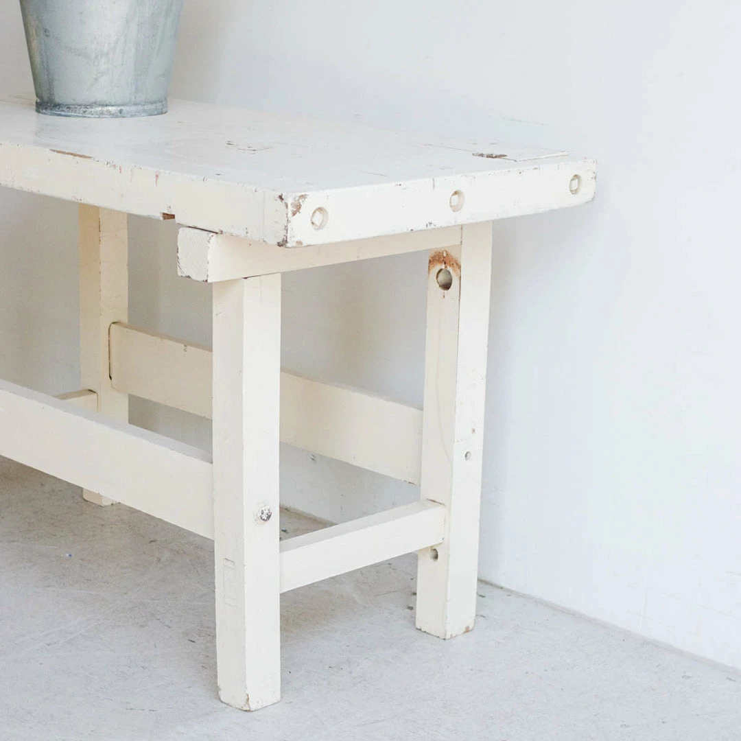 This rustic console was once a workbench in a French workshop.ย It’s perfectly aged and used with lovely rustic wood and chalky white paint worn away in all the right places.ย ย