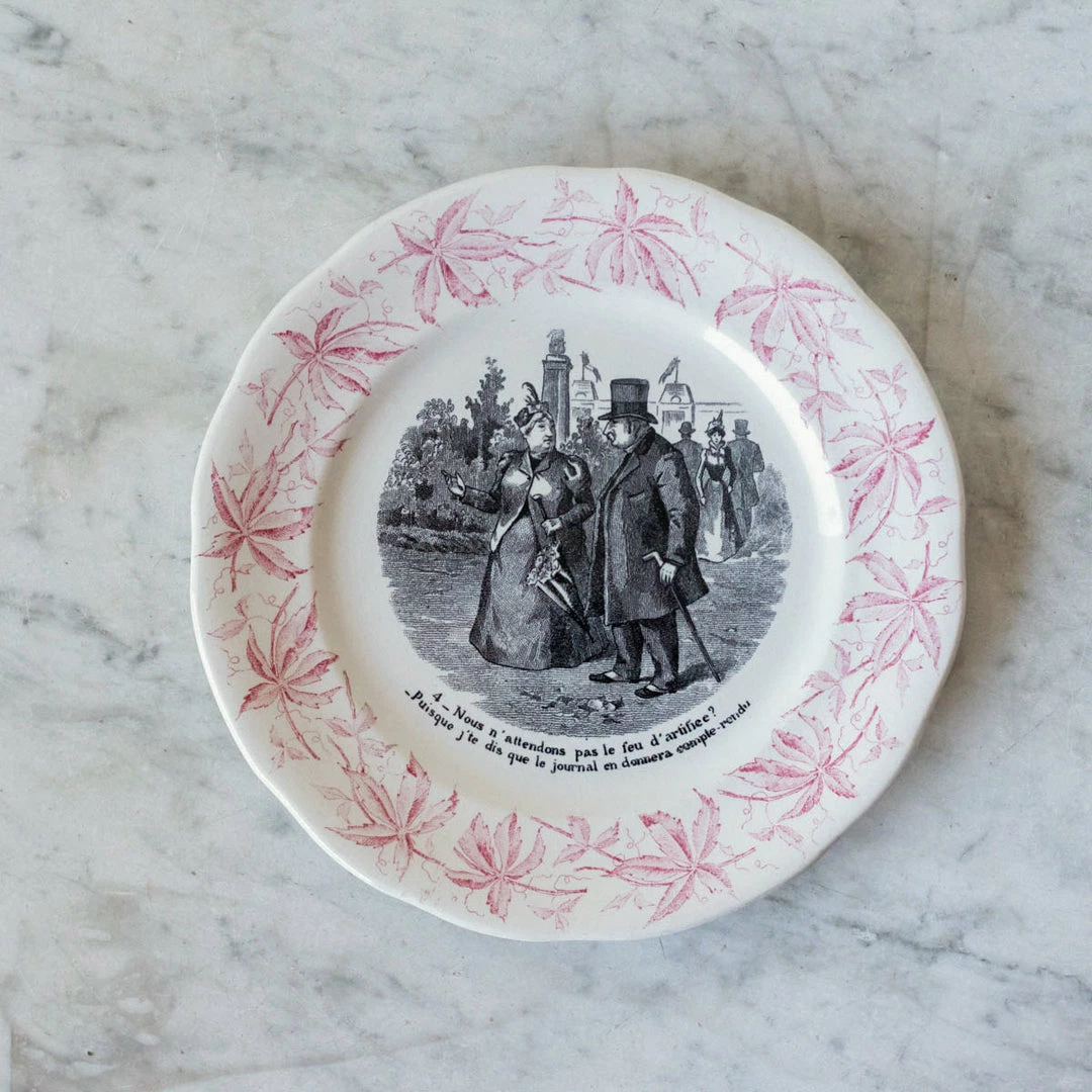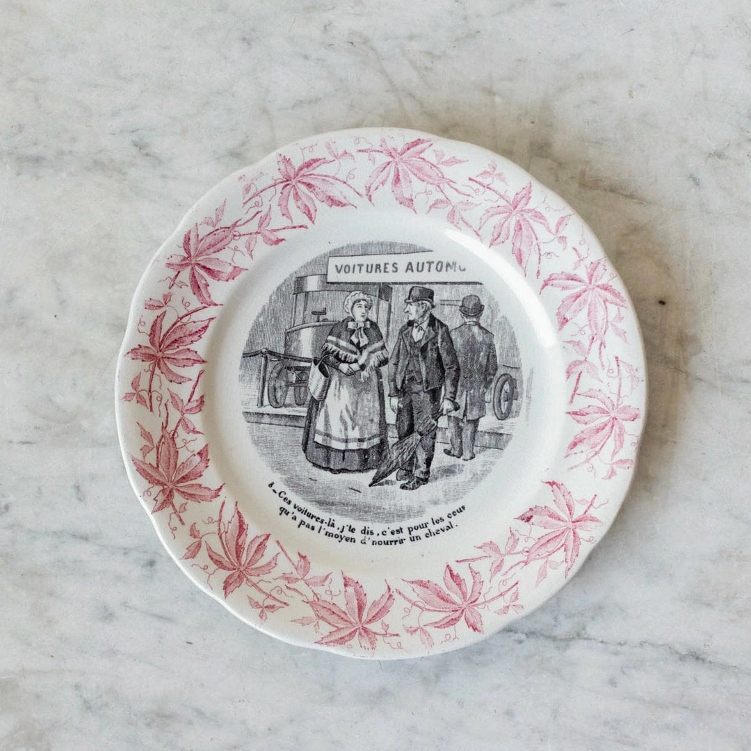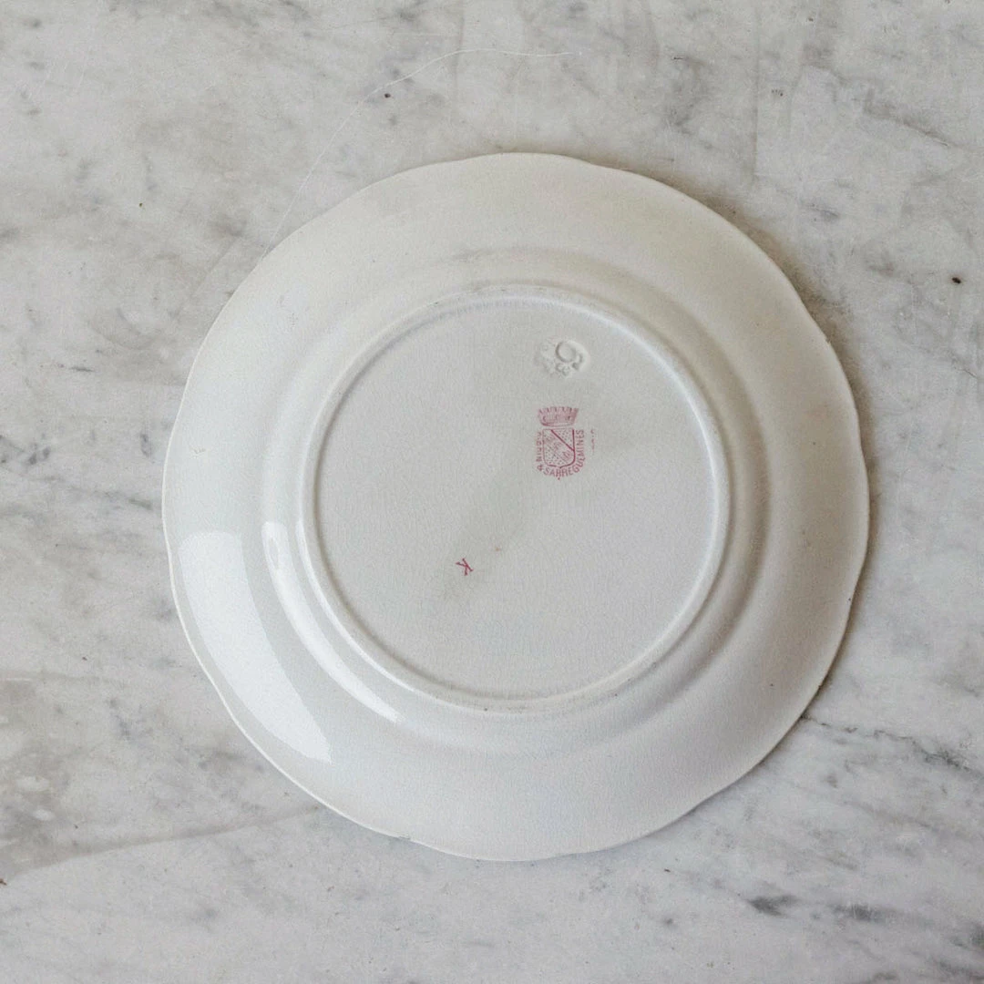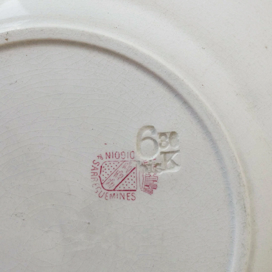 A transferware plate is a very nice thing to have in bulk in your china closet. This pretty pair has a red border that we think is lovely. Decorated with the classic transferware technique that is typical in France.