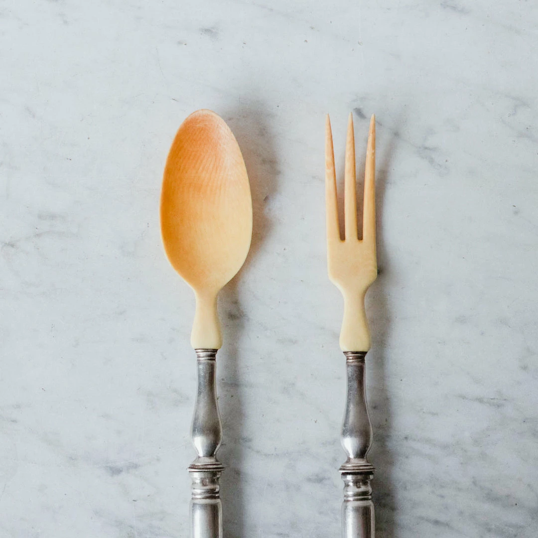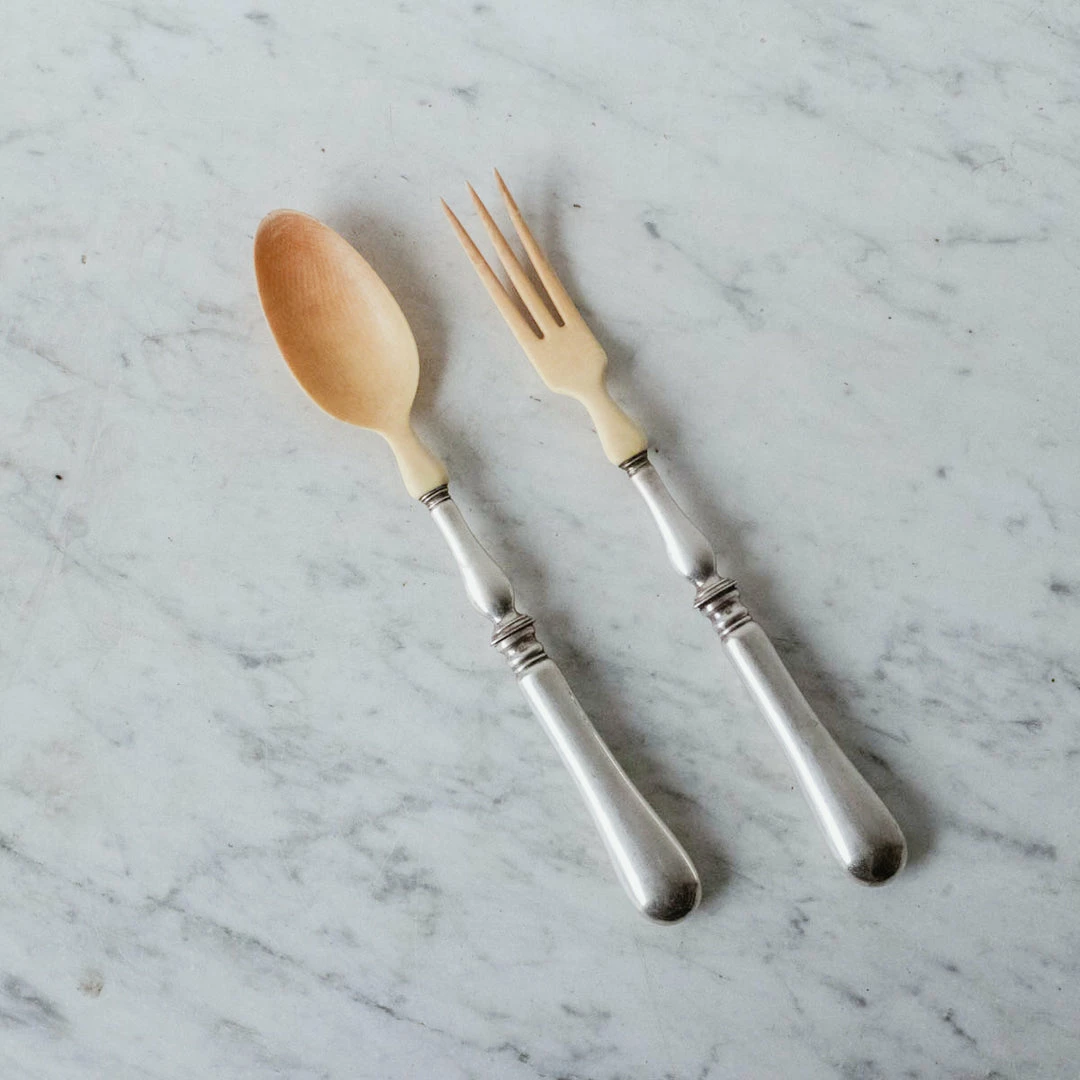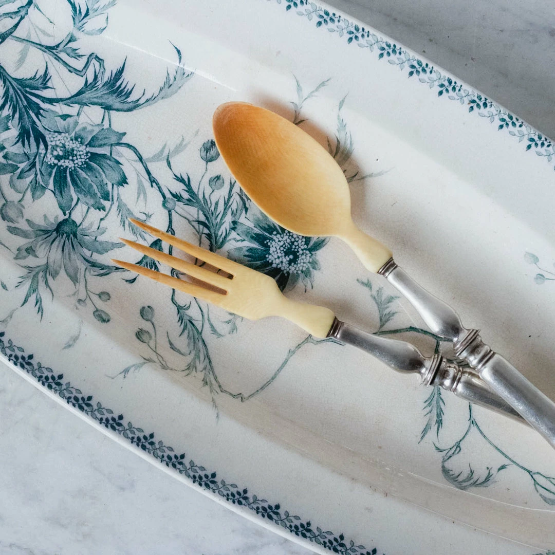 We found this lovely set of servers in a flea market in Brussels. They are hand carved from bone.