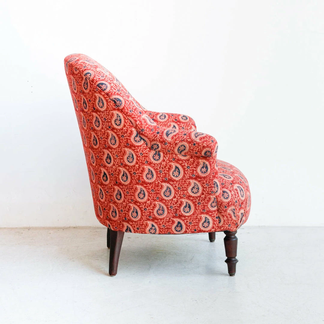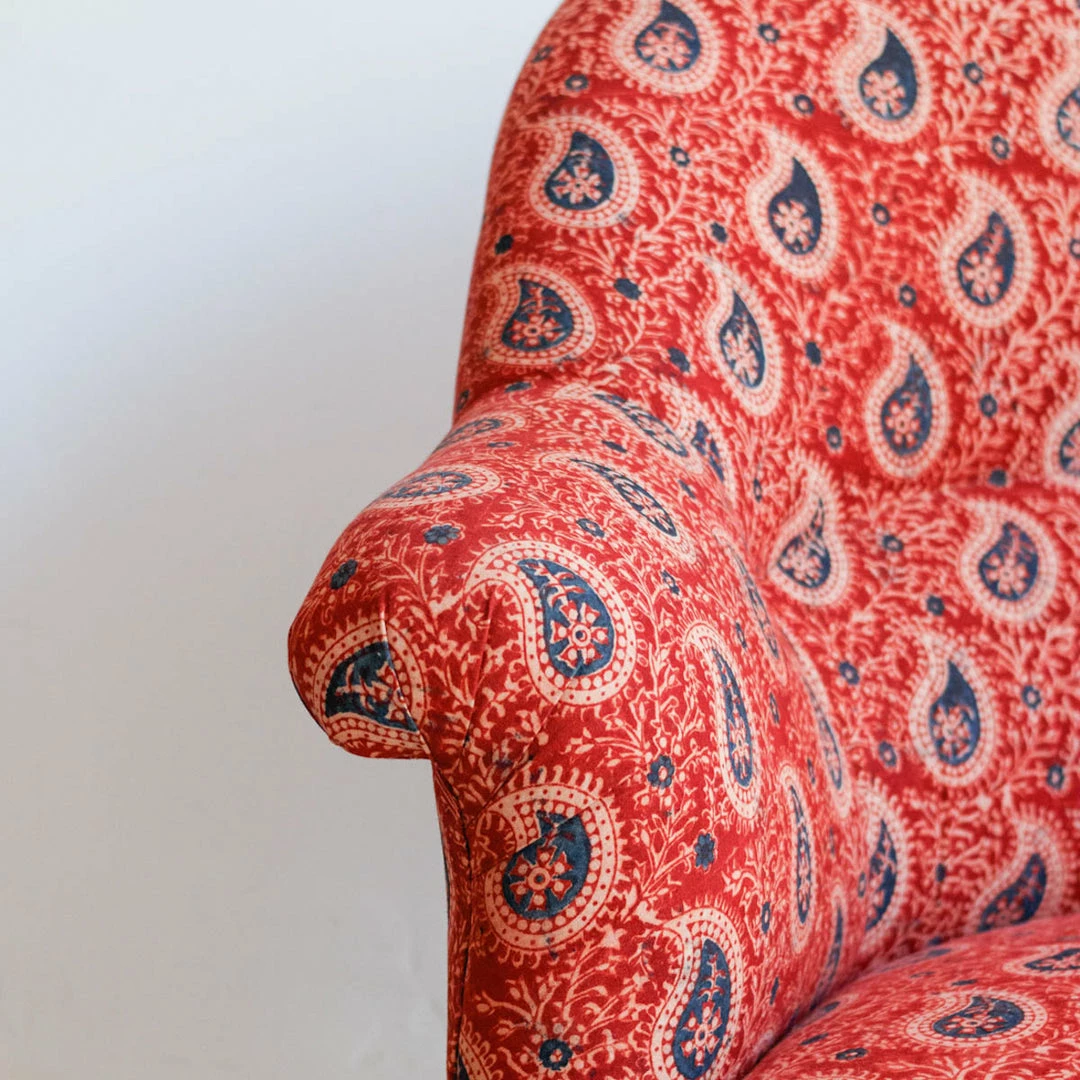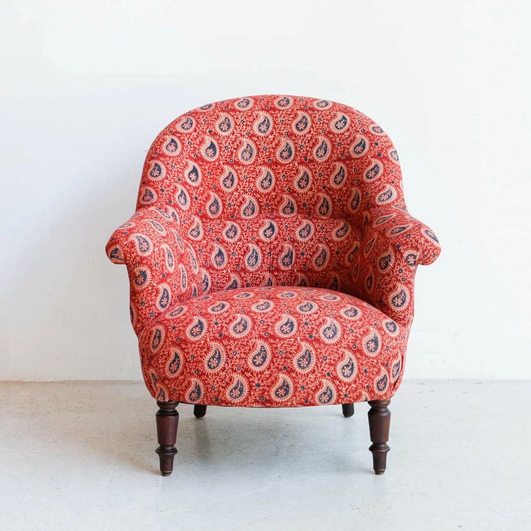 We found this cute set of twins in a flea market in Chartres.ย They’ve been carefully restored and re-upholstered in organic cotton, hand printed block print fabric.ย We love the intricate pattern of the block print.ย ย