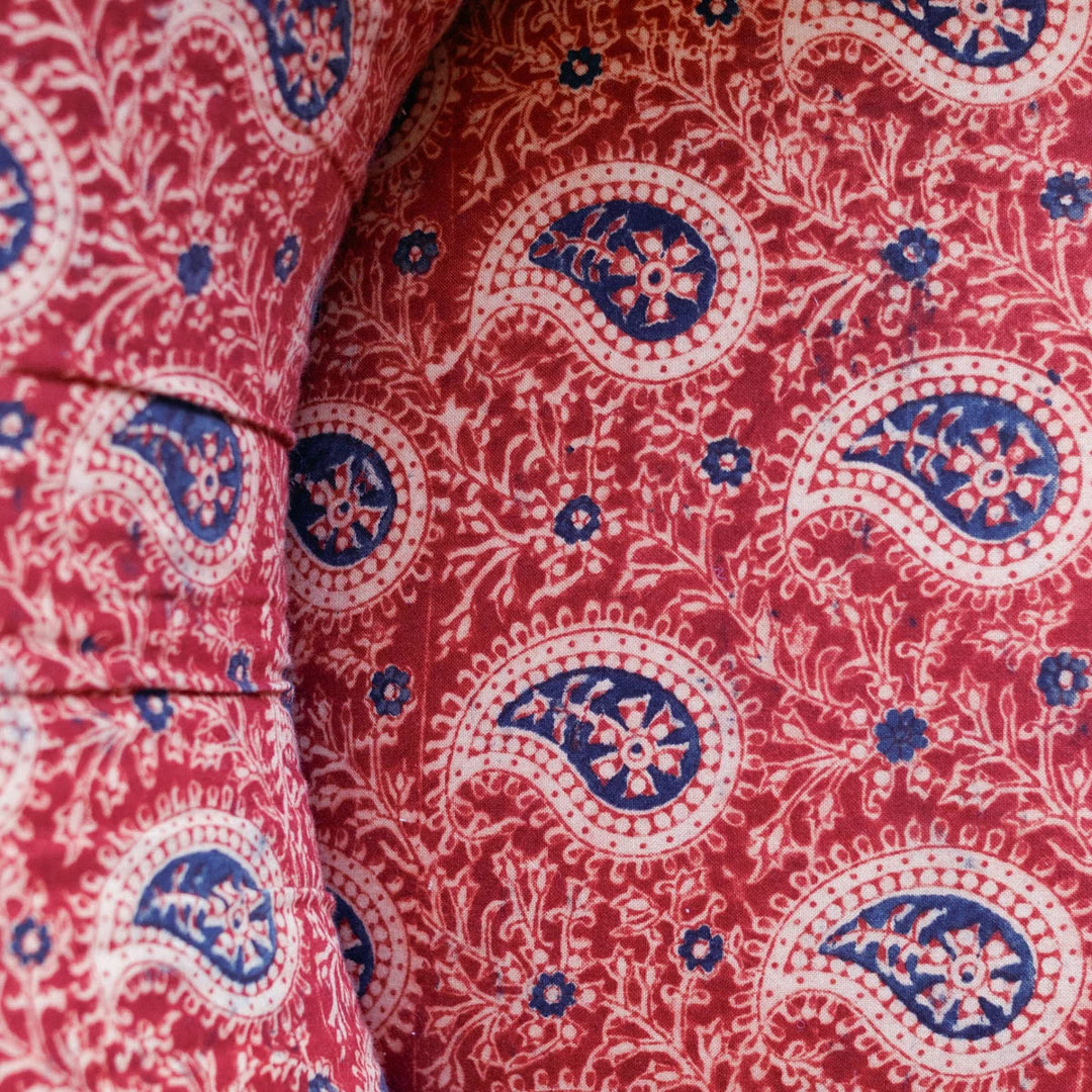 - Covered with hand block printed organic cotton.