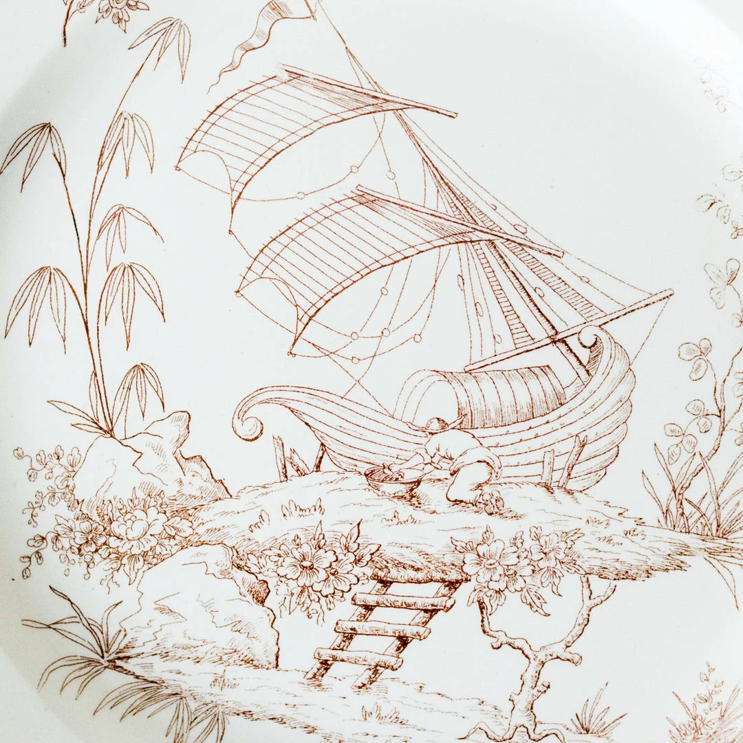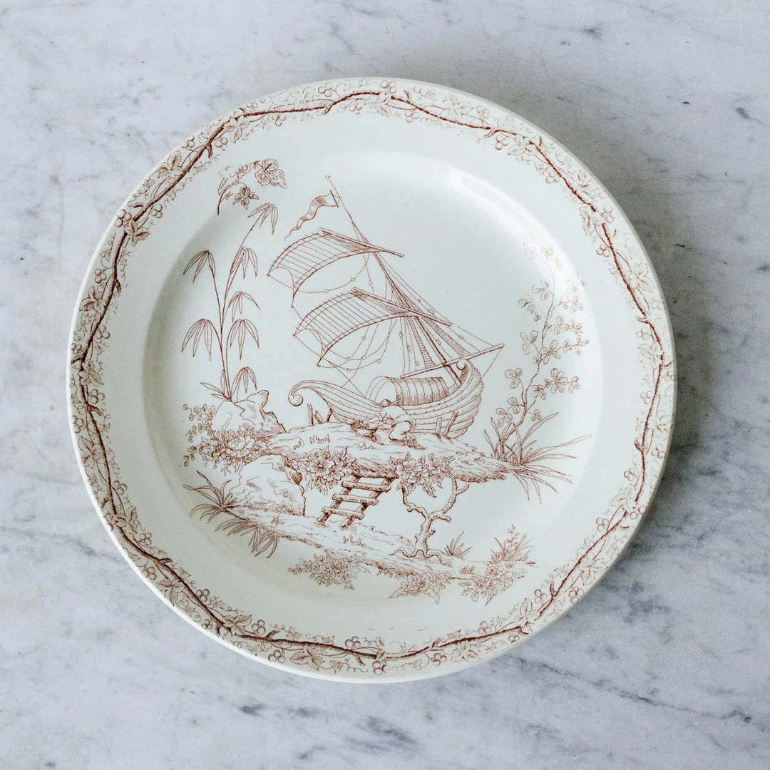 - Made of ironstone with a classic French transferware pattern featuring beautifully rendered ships.