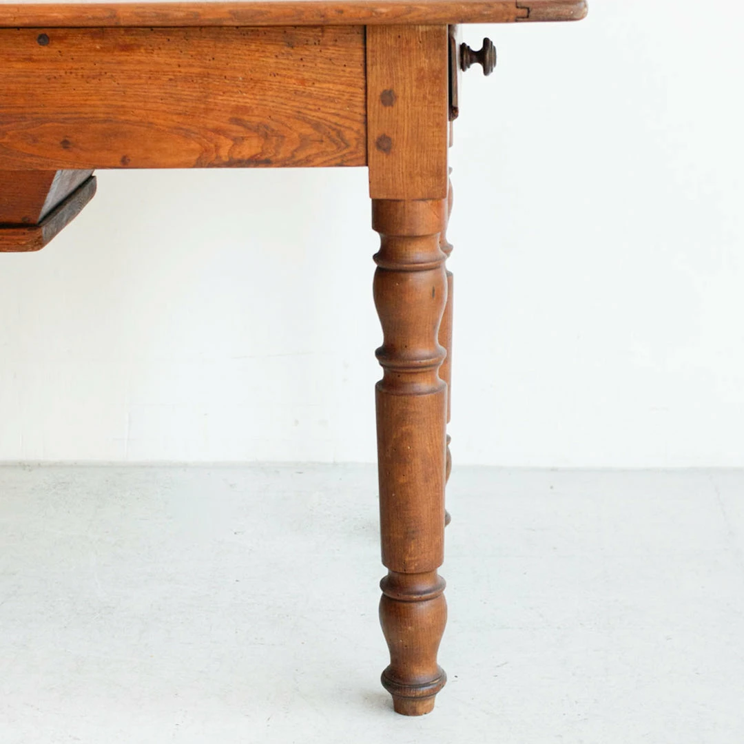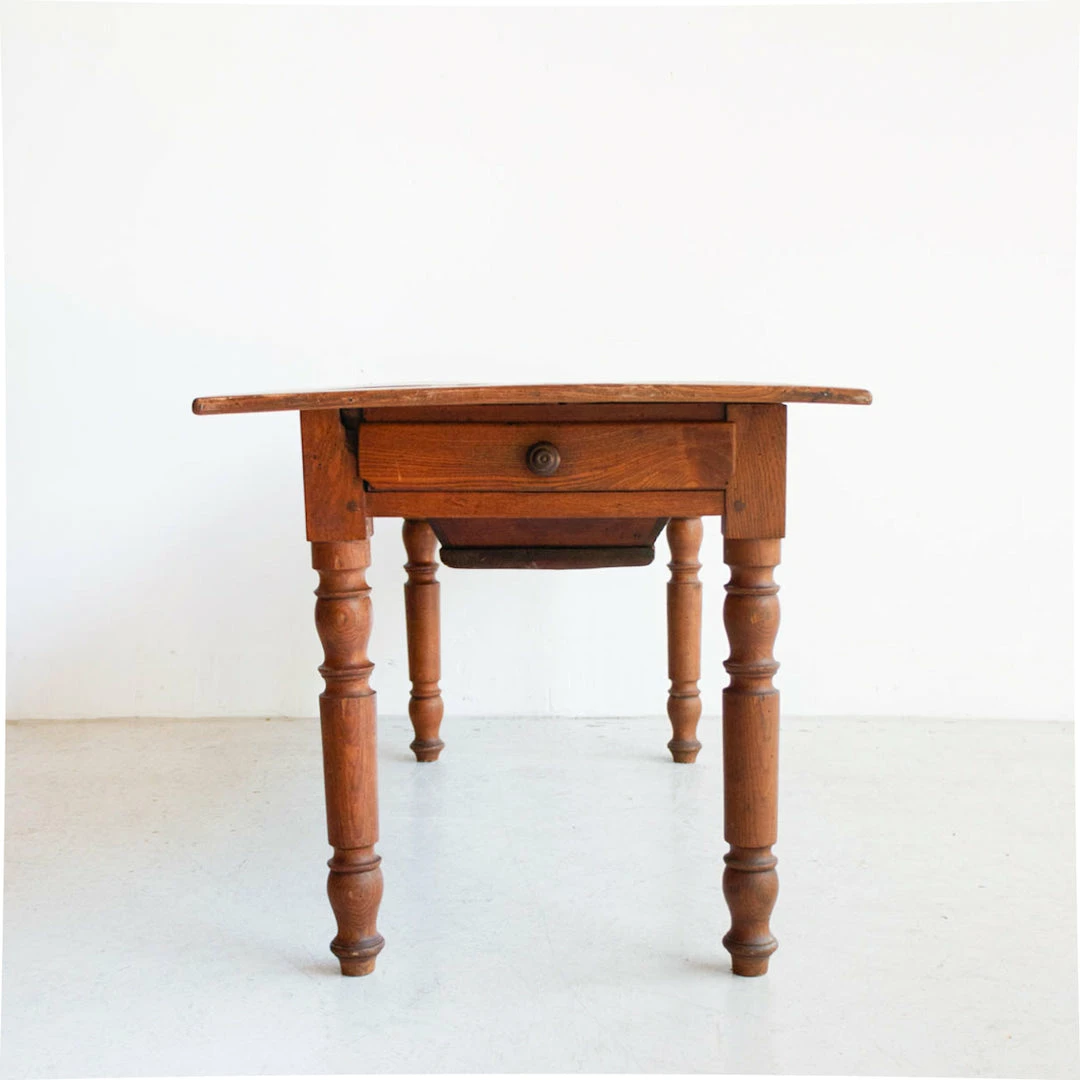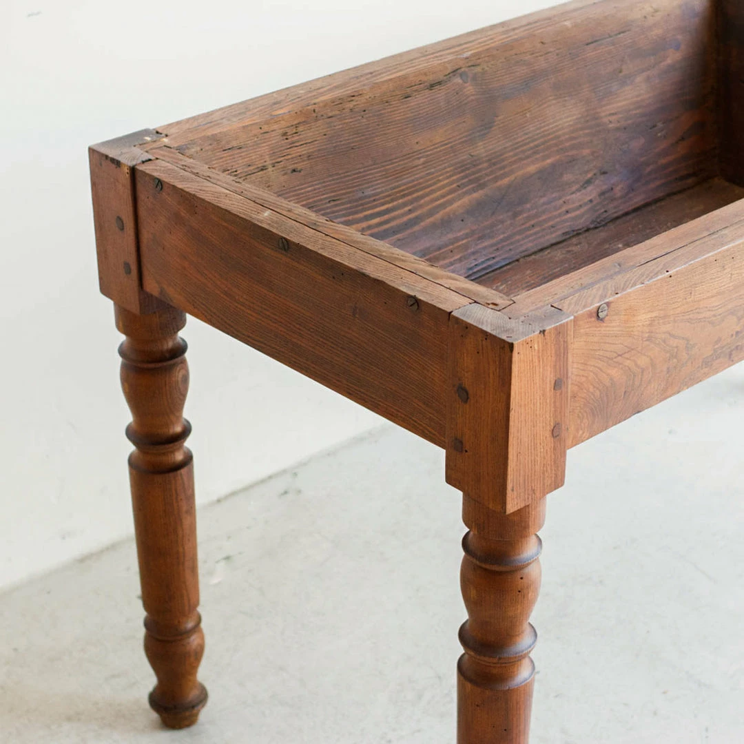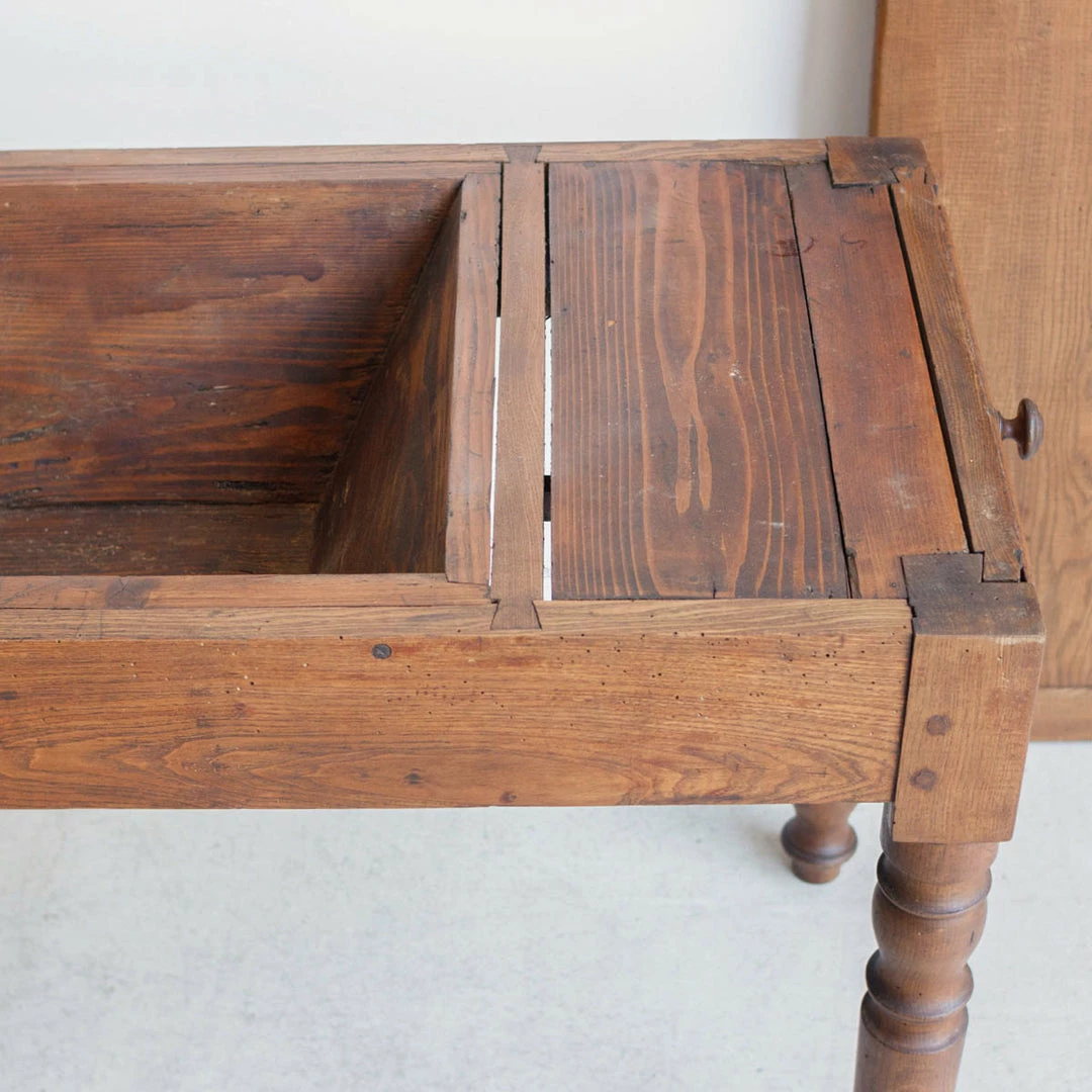 This table was once the centerpiece of a French kitchen.ย The trough held rising dough and the drawer held kitchen tools while the removable top served as a work surface.ย ย We love the well-worn waxed finish, polished smooth with time and use.ย ย