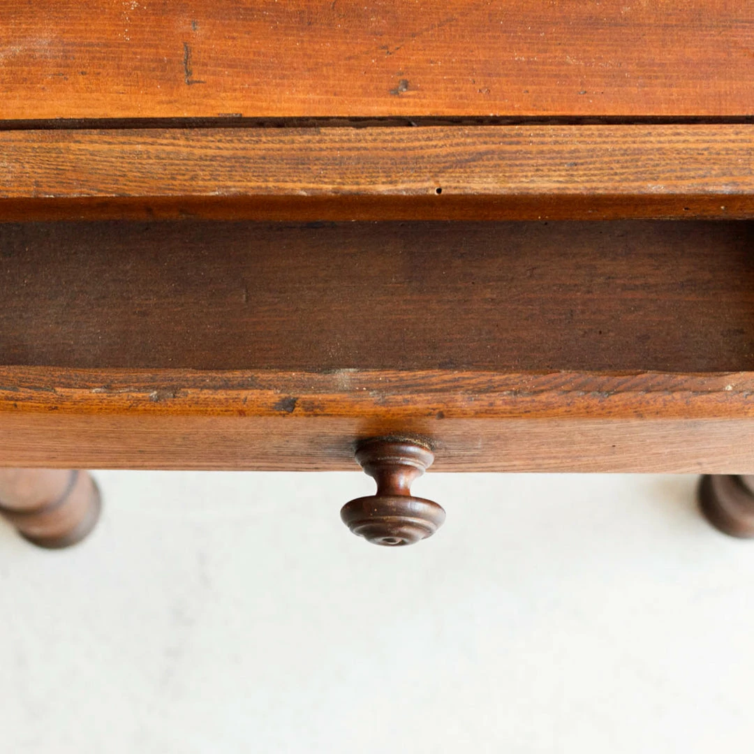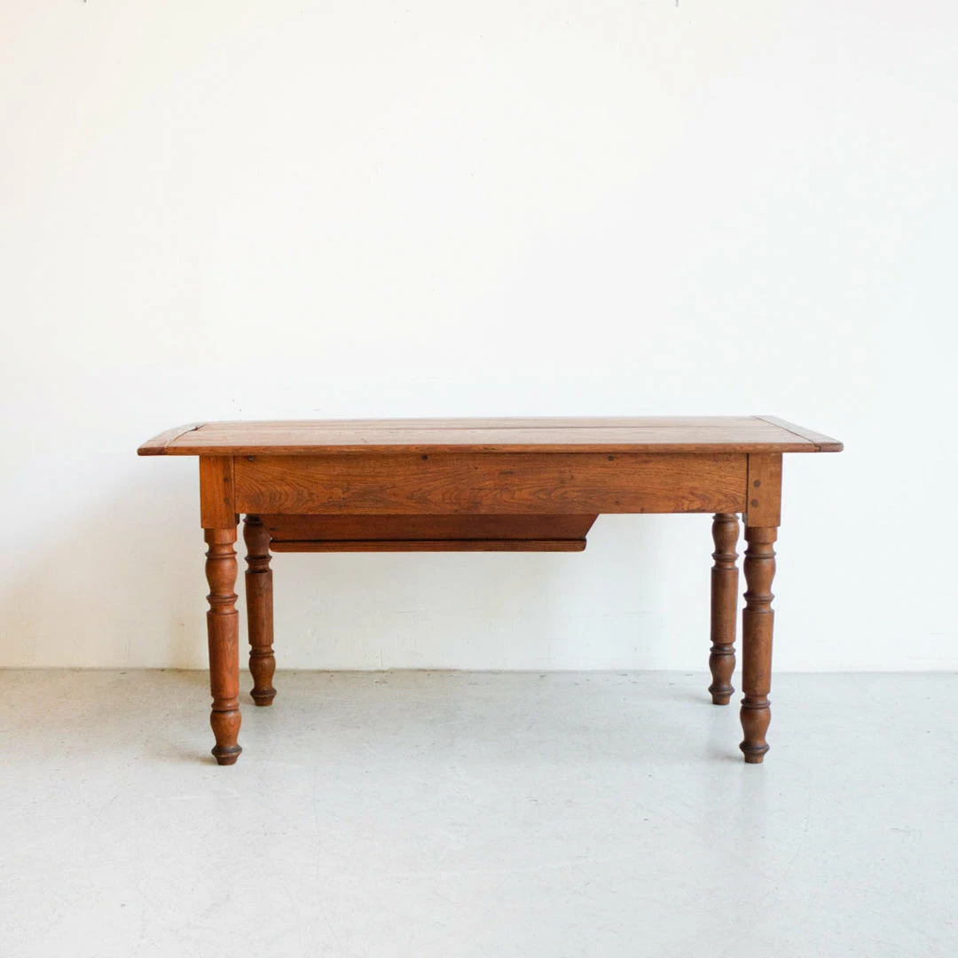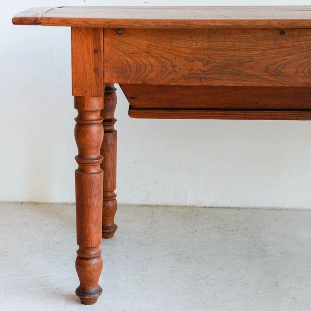 This table was once the centerpiece of a French kitchen.ย The trough held rising dough and the drawer held kitchen tools while the removable top served as a work surface.ย ย We love the well-worn waxed finish, polished smooth with time and use.ย ย