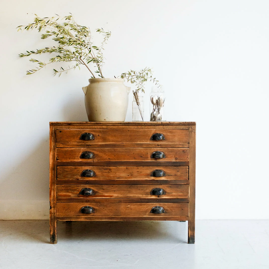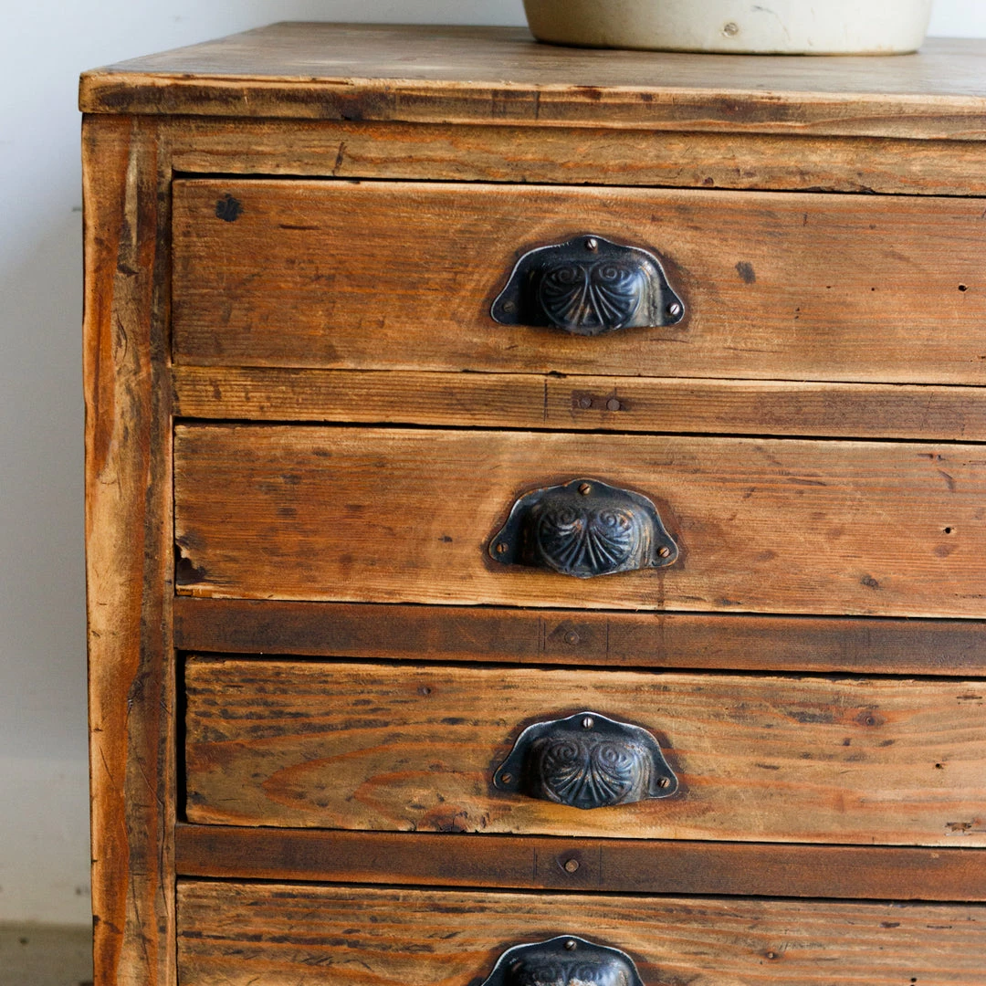 This drawer chest is the essence of simplicity.ย We love the narrow drawers – perfect for flatware or linens in the dining room, or for sweaters in the dressing room.ย ย