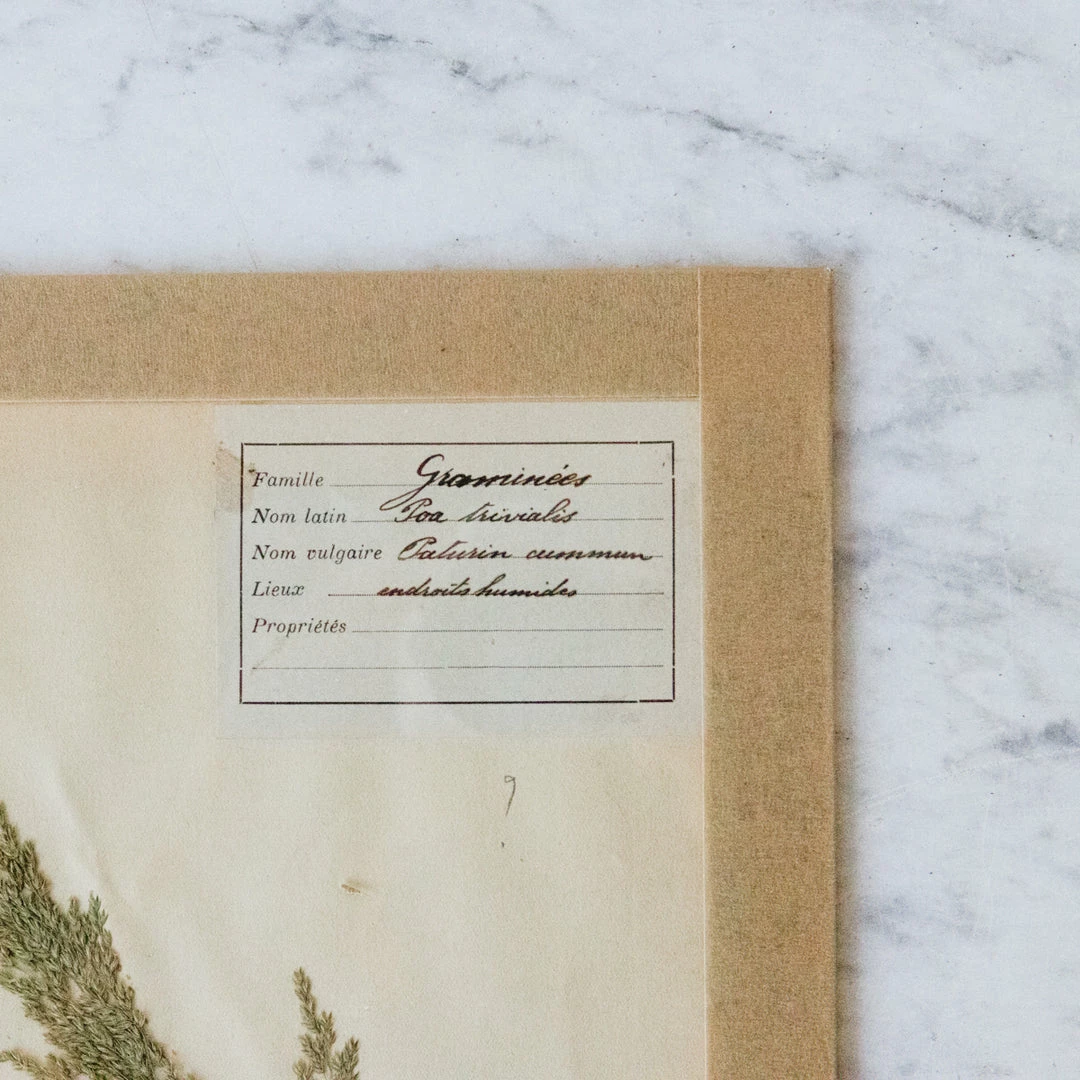 Each of these pressed botanicals was once a page in a French botanist’s journal. We collected them from an agricultural school in Haute-Loire. Each has a dried specimen and hand script written in French language.