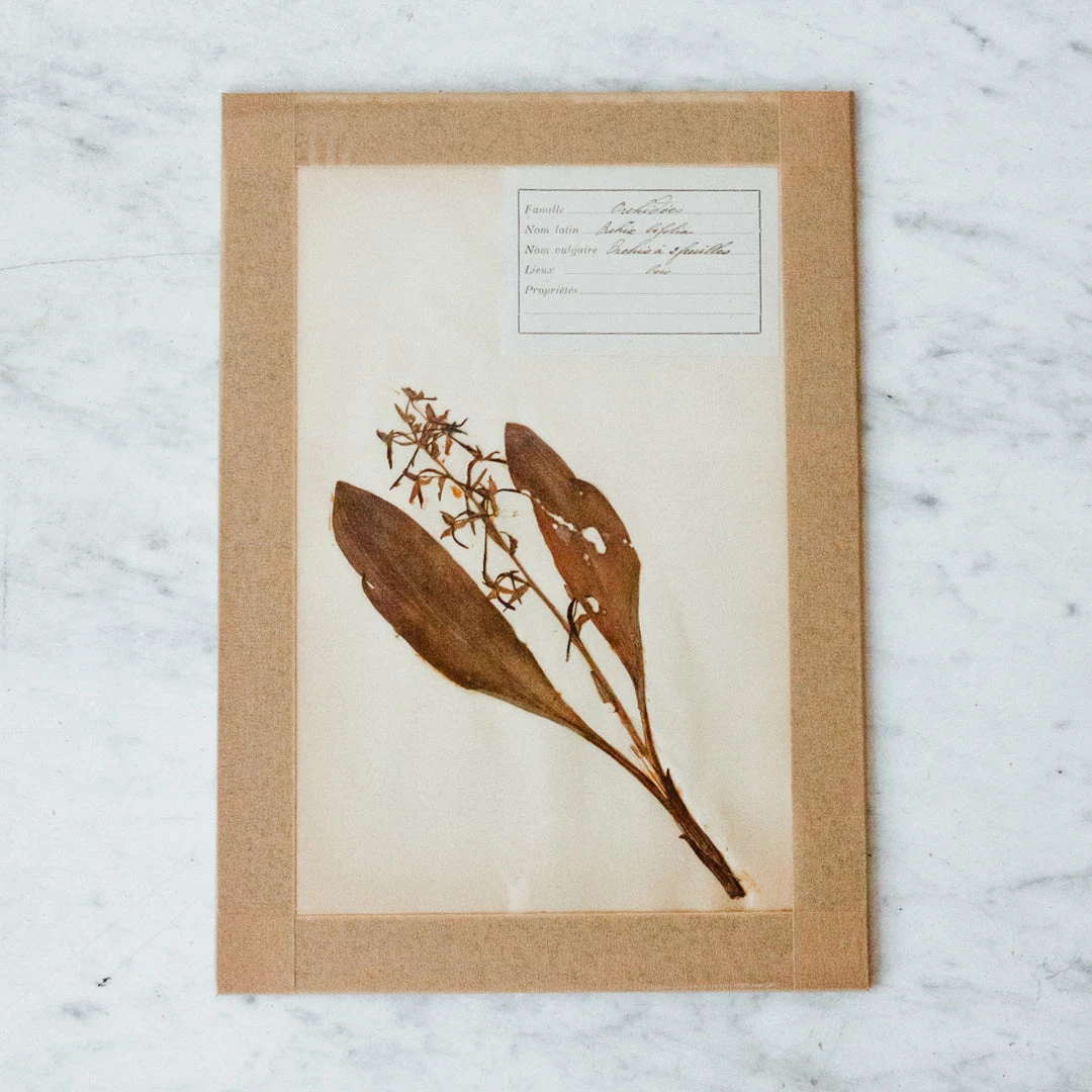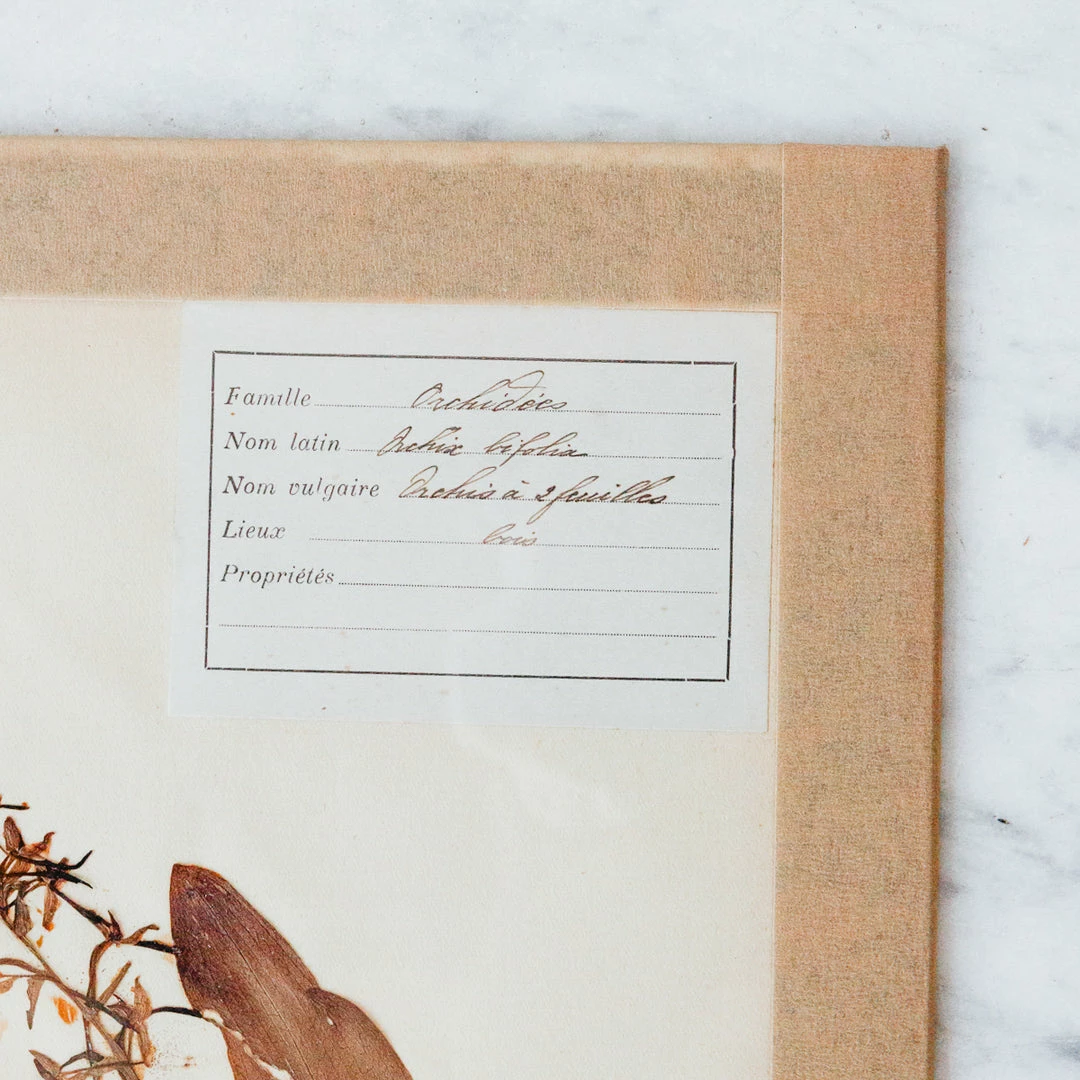 Each of these pressed botanicals was once a page in a French botanist’s journal. We collected them from an agricultural school in Haute-Loire. Each has a dried specimen and hand script written in French language.