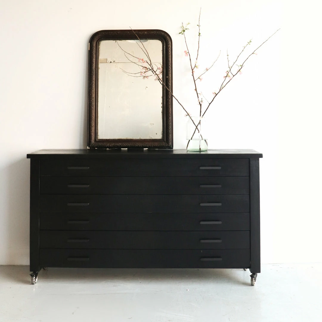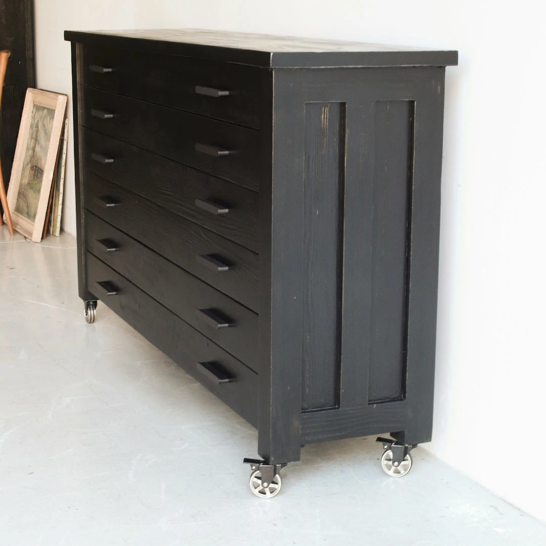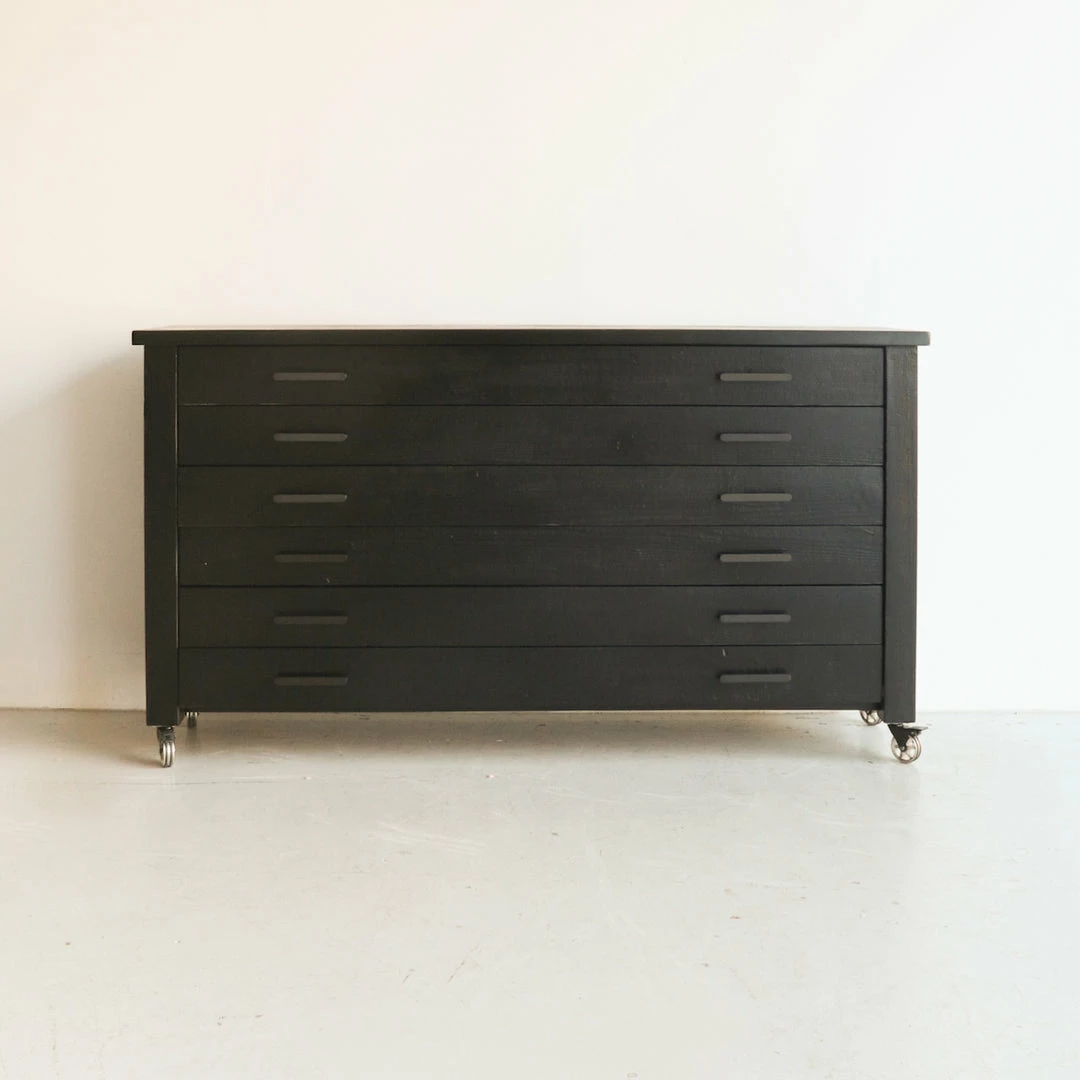 We designed this dramatic chest in the style of a vintage map chest we found in a flea market in Lyon. It’s been crafted with all the charm of the original piece, and the function of a newly made chest with drawer glides and 4″ locking casters. We think it’s the perfect piece for a dining room to store table linens, platters and flatware, for books and papers in an office, or magazines and tear sheets in a studio.