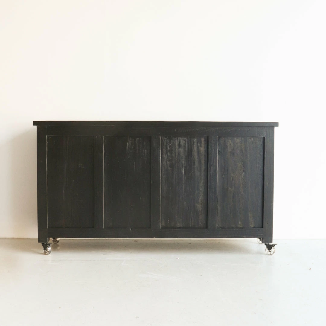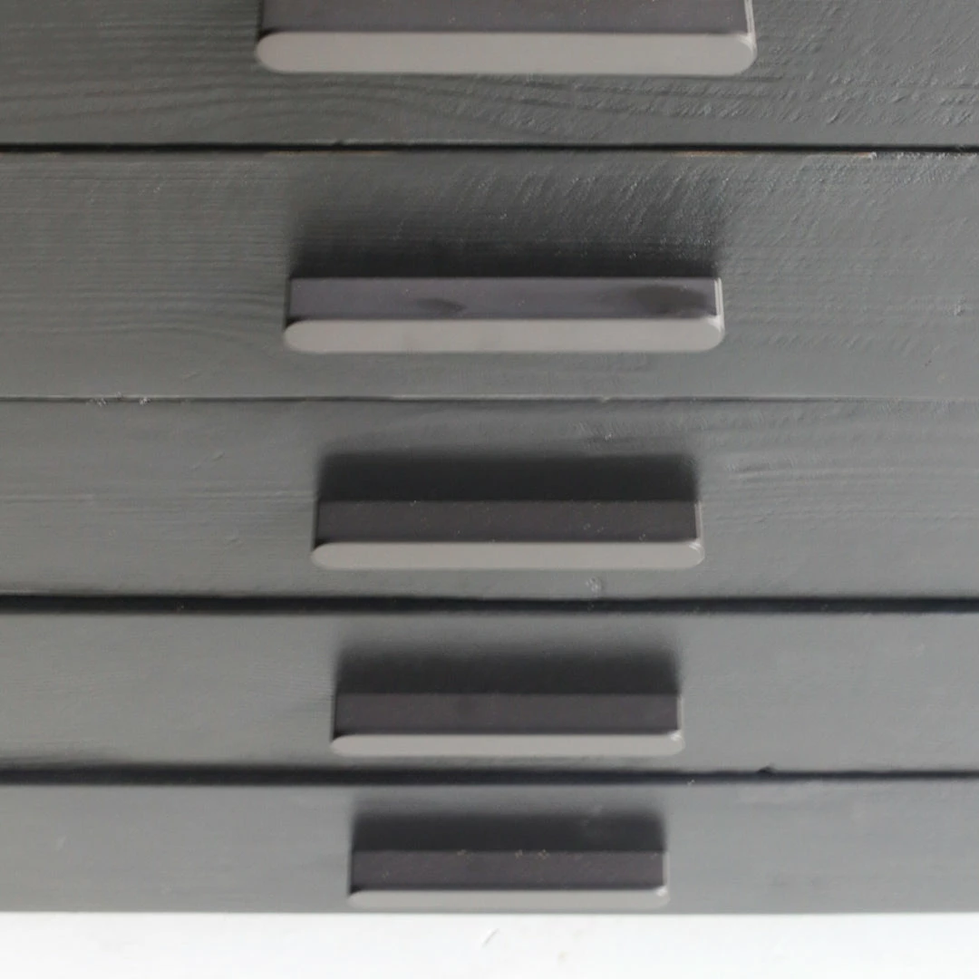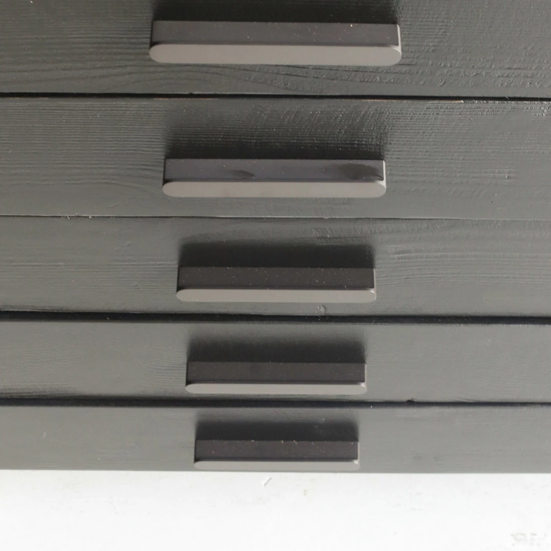 We designed this dramatic chest in the style of a vintage map chest we found in a flea market in Lyon. It’s been crafted with all the charm of the original piece, and the function of a newly made chest with drawer glides and 4″ locking casters. We think it’s the perfect piece for a dining room to store table linens, platters and flatware, for books and papers in an office, or magazines and tear sheets in a studio.