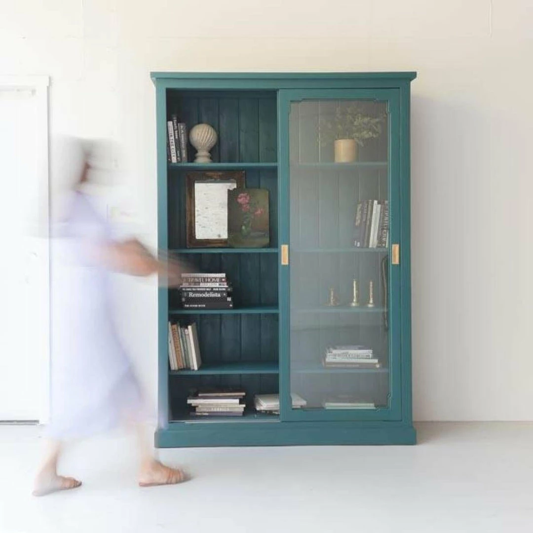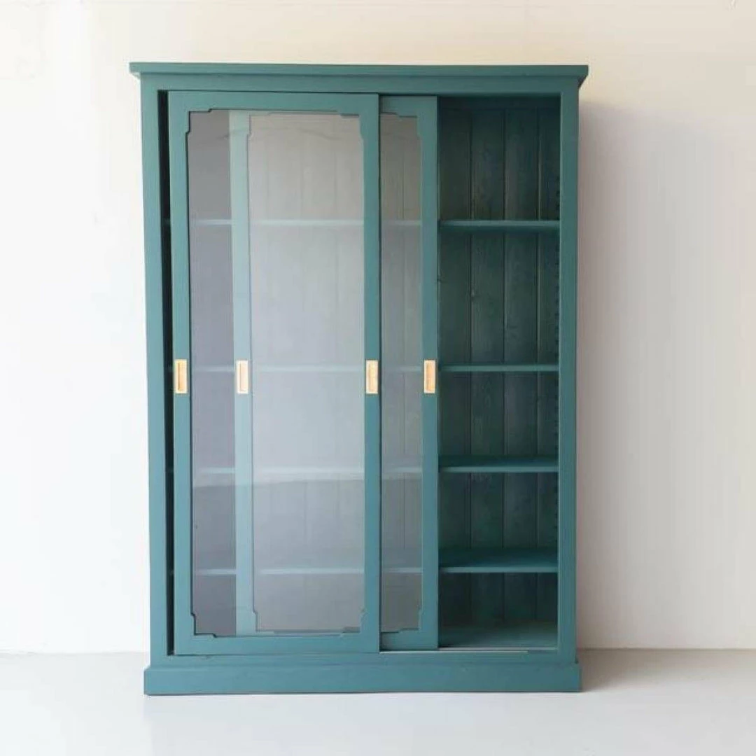 - Cabinet is featured in custom paint in Benjamin Moore Beau Green.