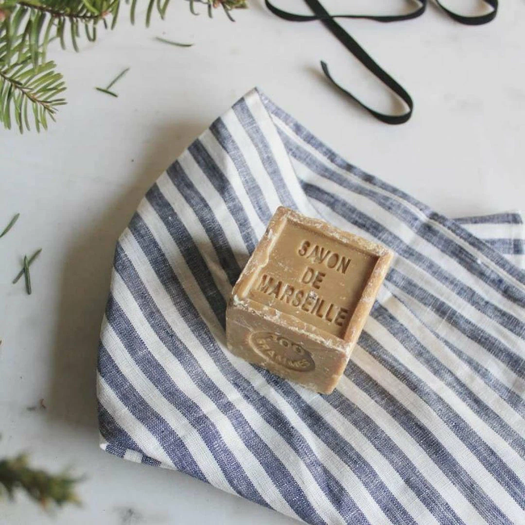 - Set includes one cube of Savon de Marseille, & one yarn-dyed kitchen towel.