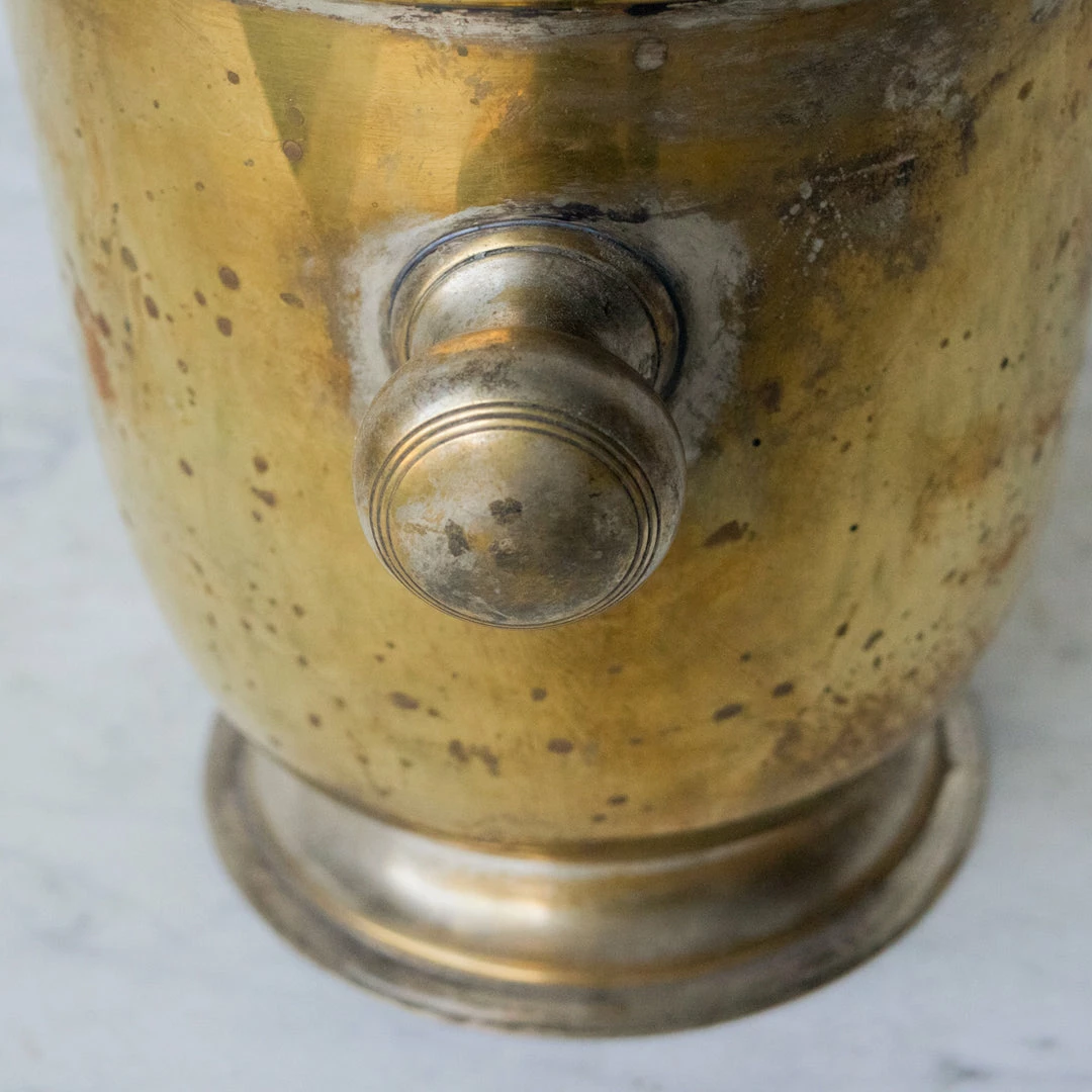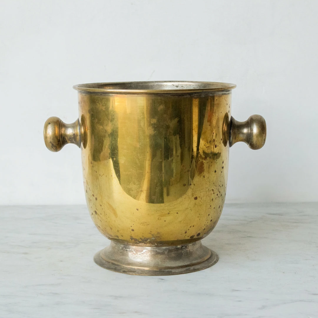 This very special champagne bucket was once used in the tasting room of the French champagne house. Most of the silver has been worn away to reveal the brass underneath. But the silver is still visible at the base, handles and other places to give it a soulfulness only found in a vintage piece. We think it’s as perfect for a bunch of garden roses as it is for chilling your champagne.