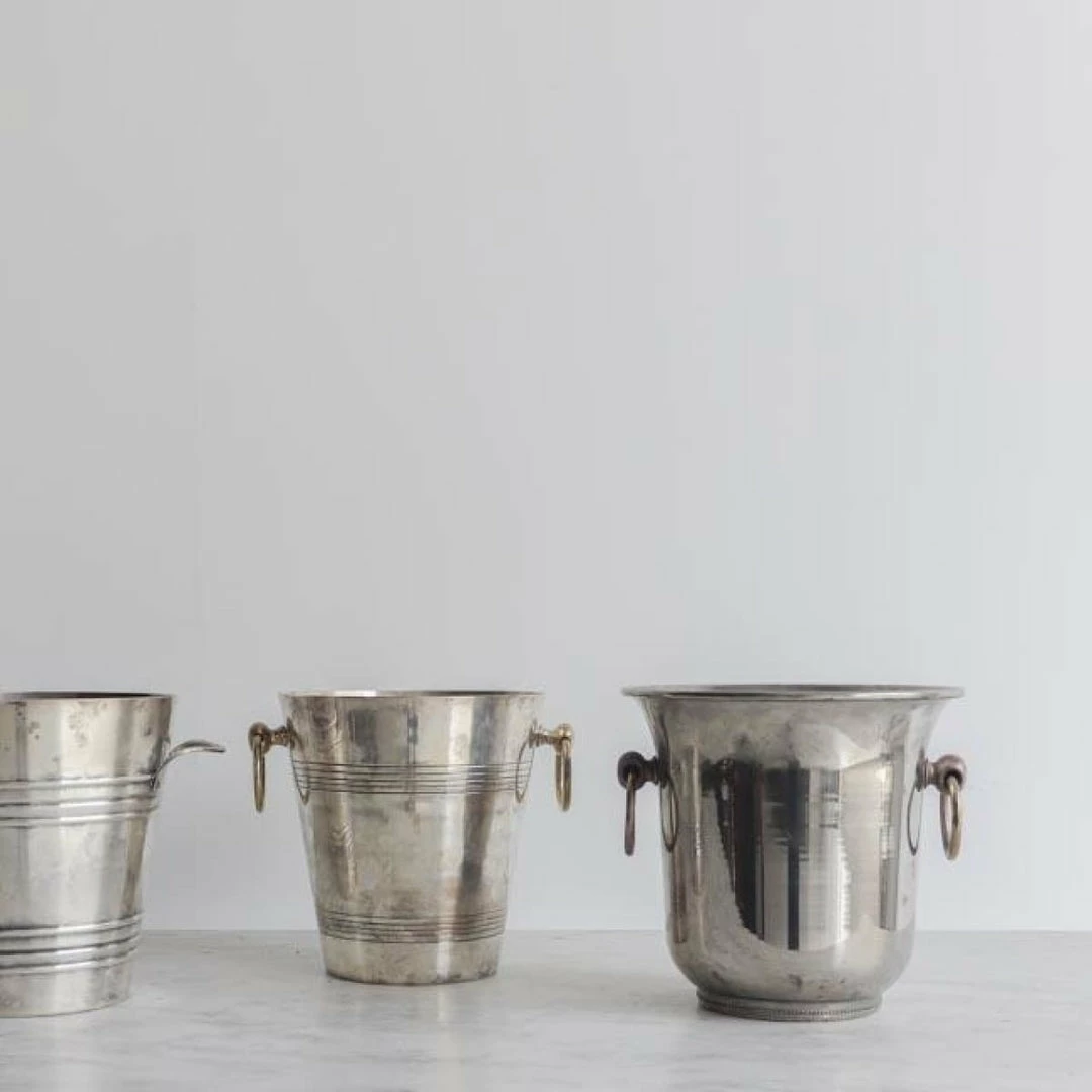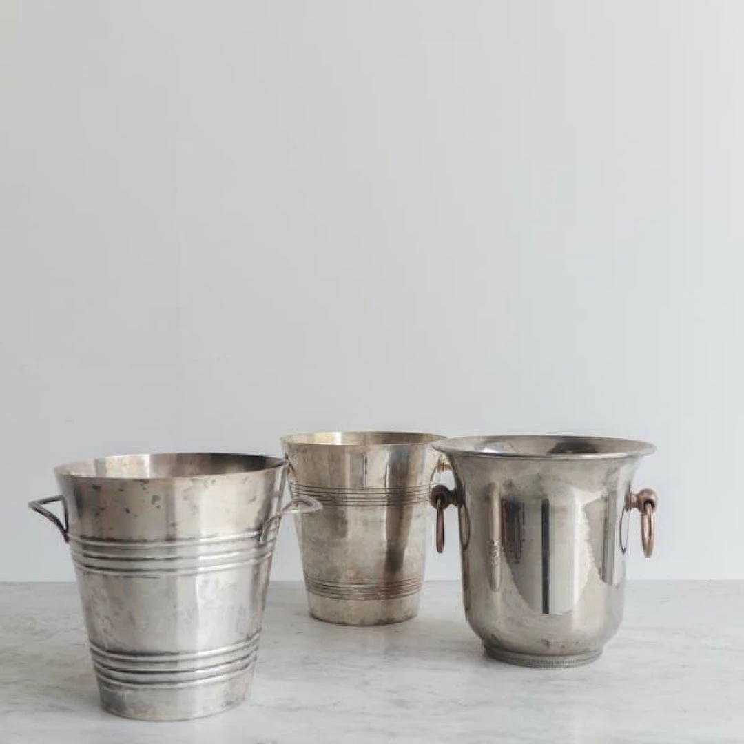 These champagne buckets were once used in French hotels. Β Now we think one is a pretty addition to your bar, or a lovely wedding gift. Β Silver plated.