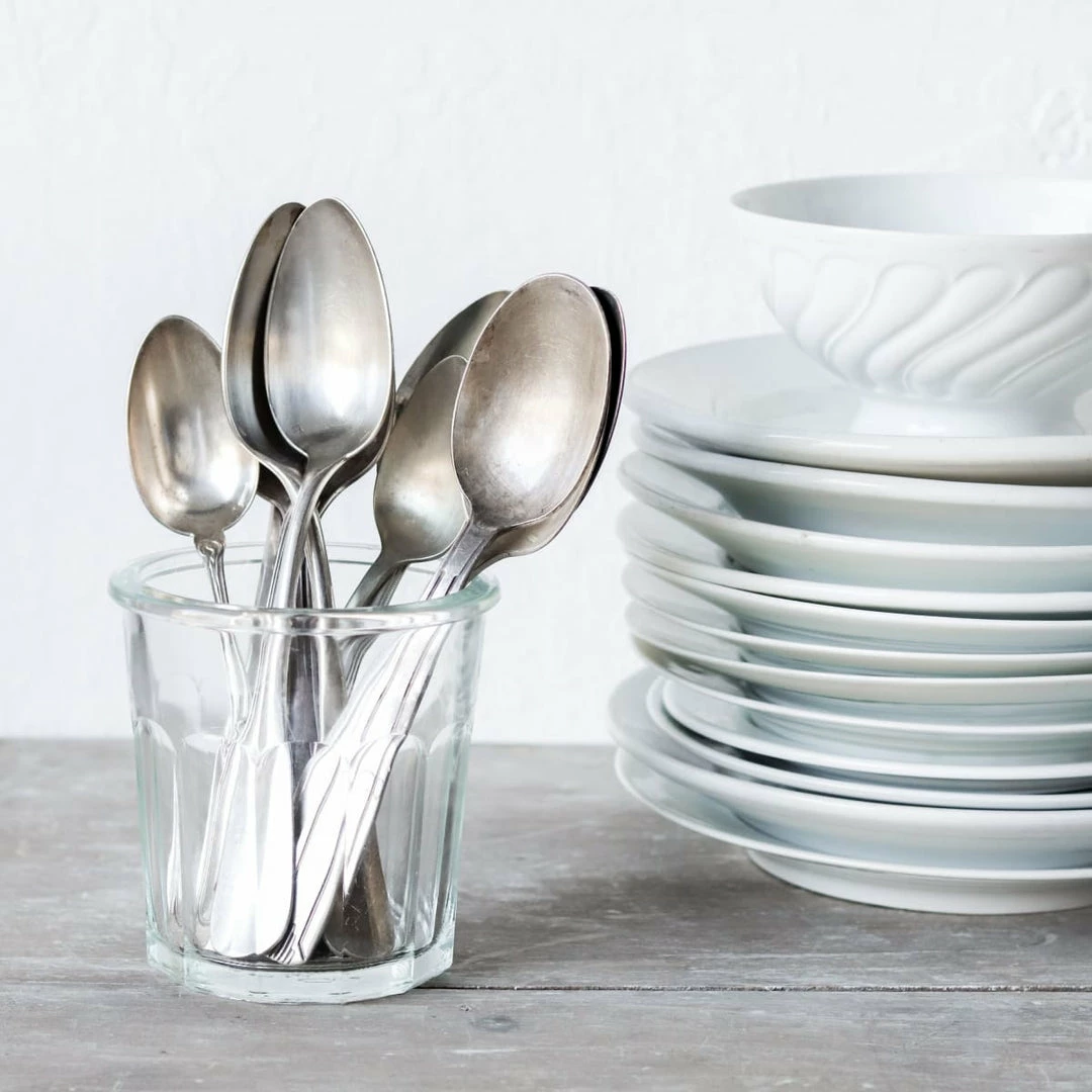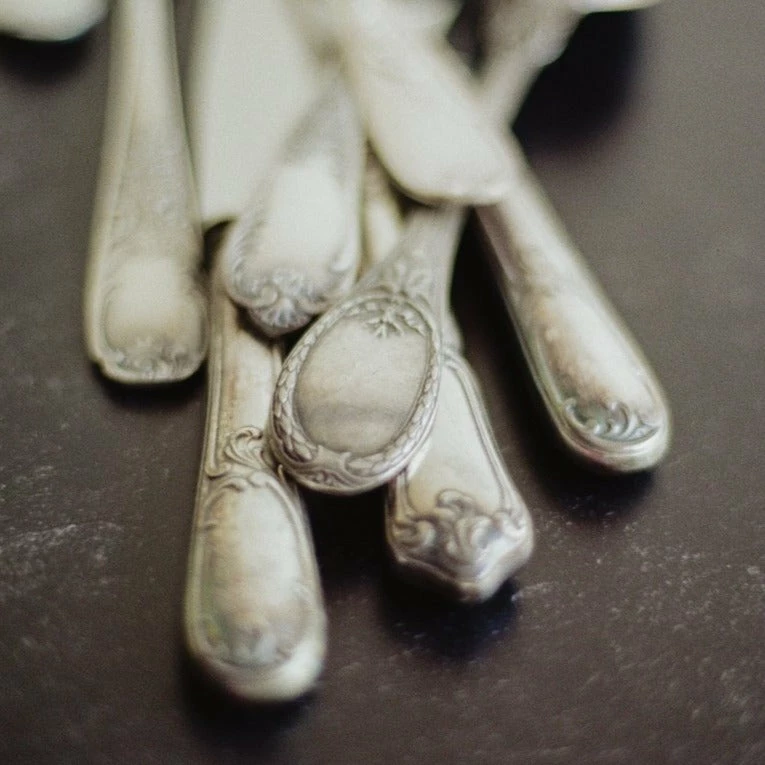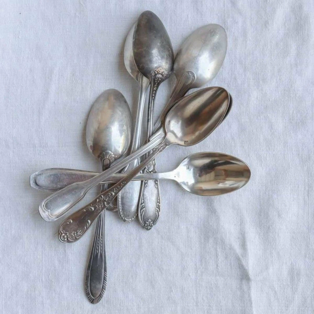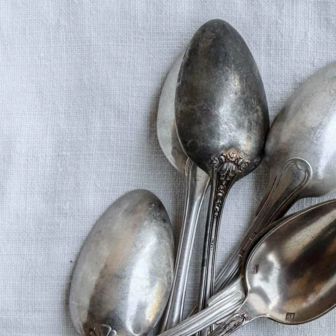 We love keeping our vintage silver in a big glass jar and bringing it out for parties. This set is made up entirely of French pieces, which means heavier pieces, larger European sizing, and forks and spoons decorated on both sides. They’re simply beautiful.ย ย