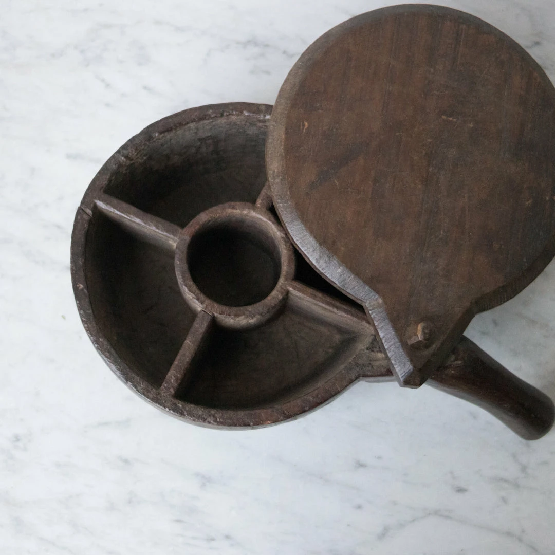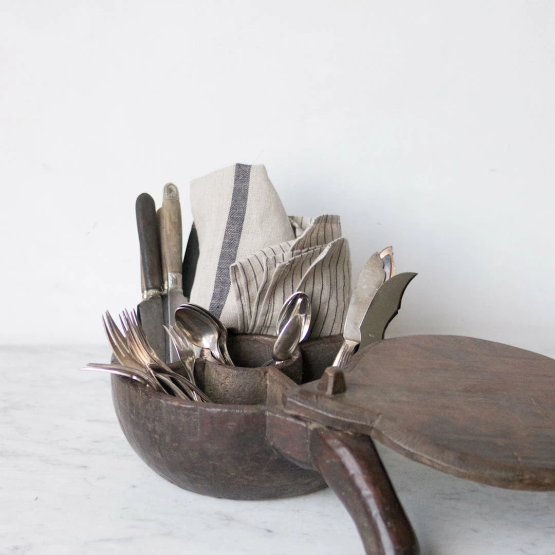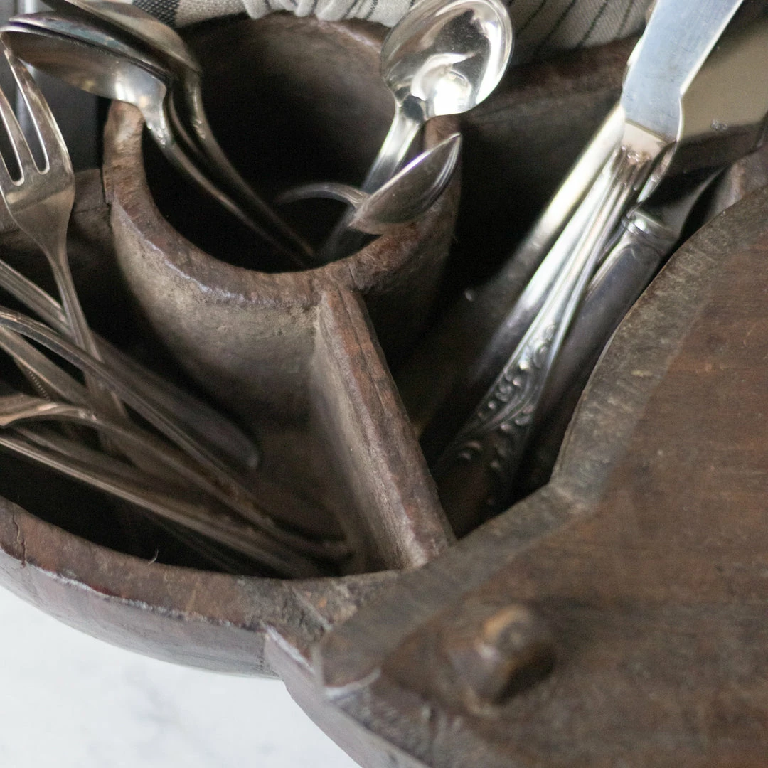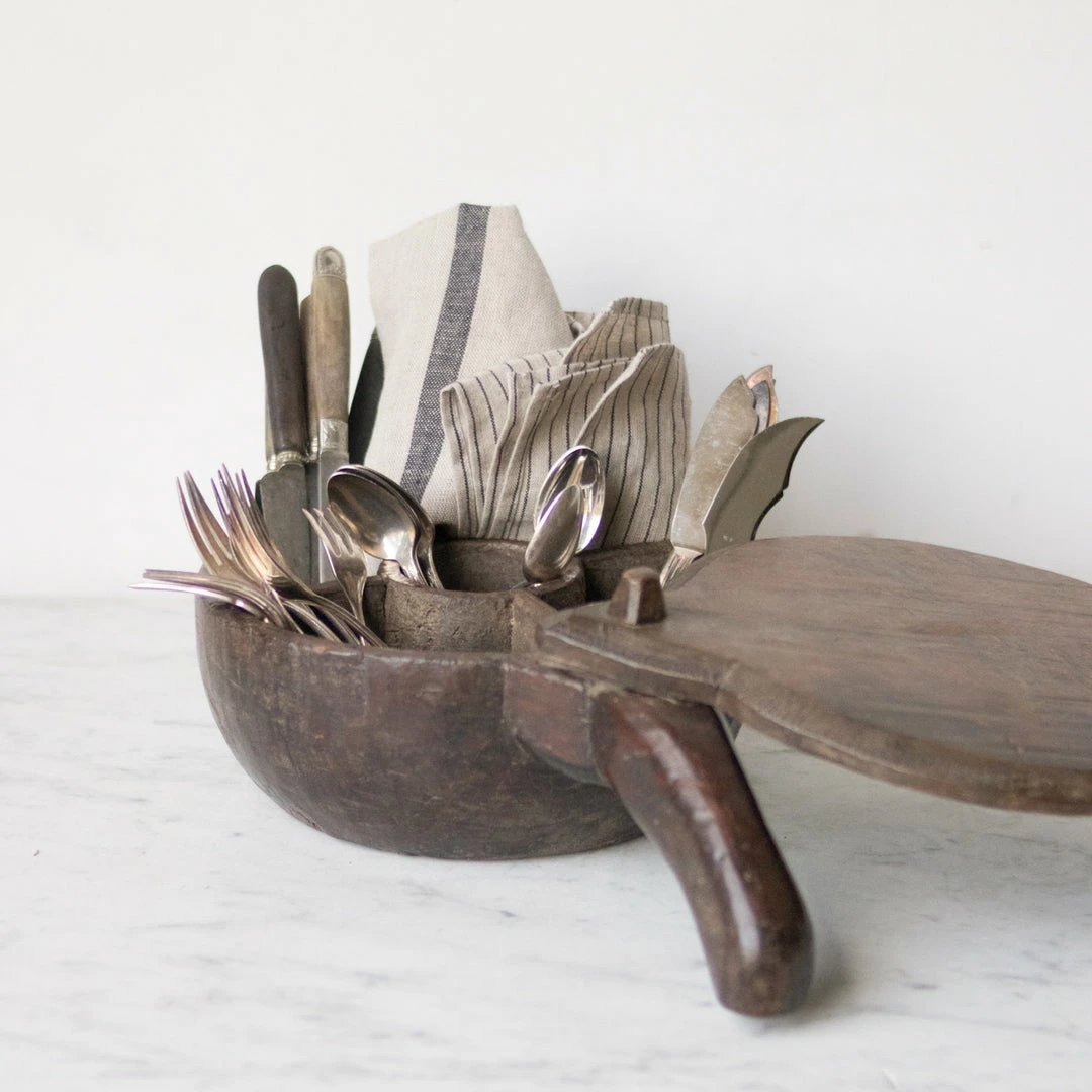 This carved box was once used for storing spices in a Moroccan kitchen.ย Now we think it’s a lovely for storing flatware, salt, or other small things.ย