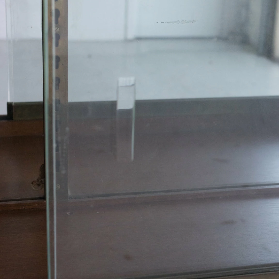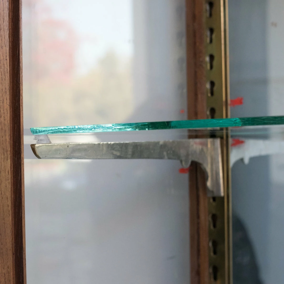 - Upper cabinet with two glass shelves, sliding glass doors and mirrored back panel.