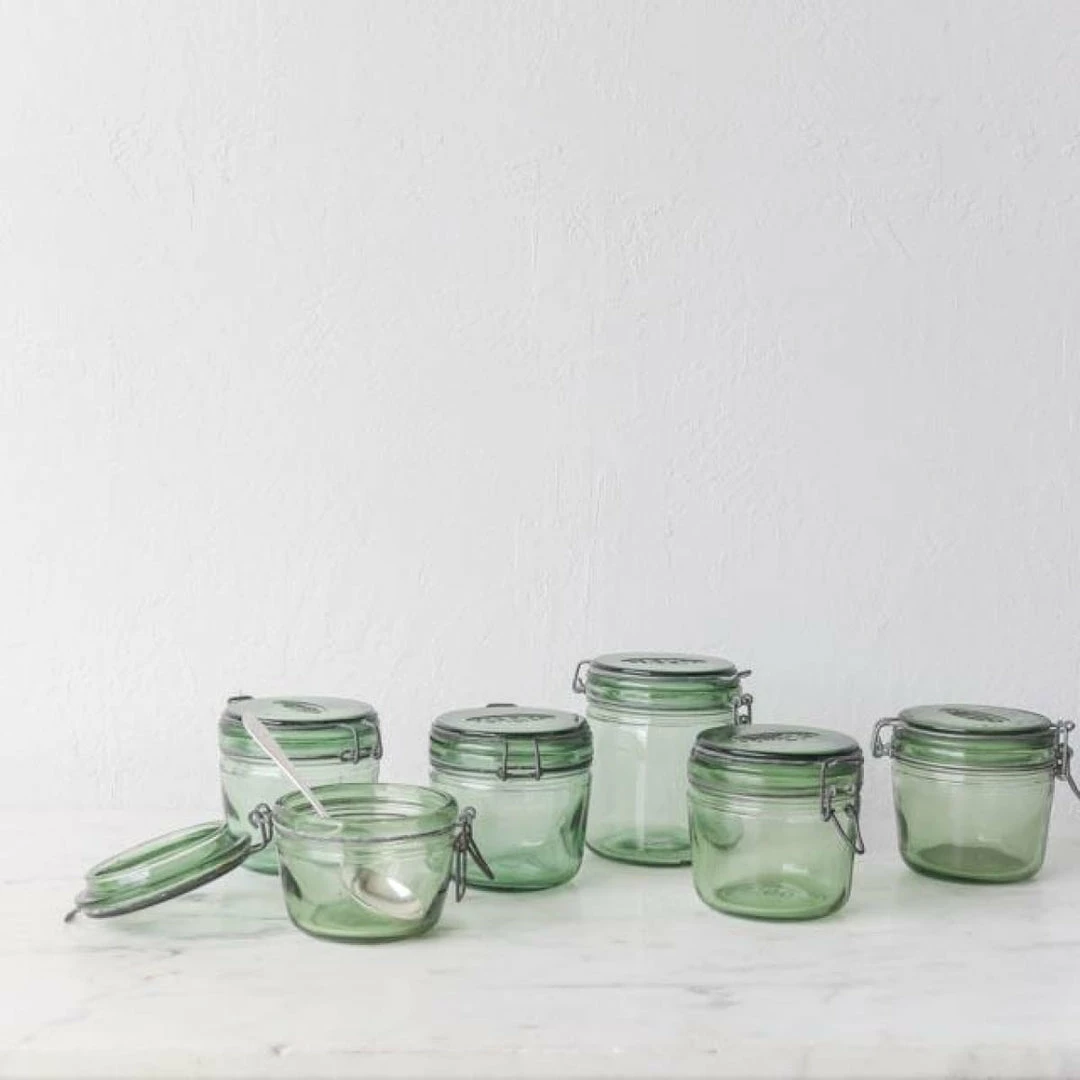 We met a collector at a brocante in Le Mans and somehow got ourselves invited back to his farmhouse where he had a big and beautiful collection of these vintage French canning jars. They’re made from heavy green glass with metal hinges. The jars are retired from their useful life of canning, but we can think of so many other good uses for them!
