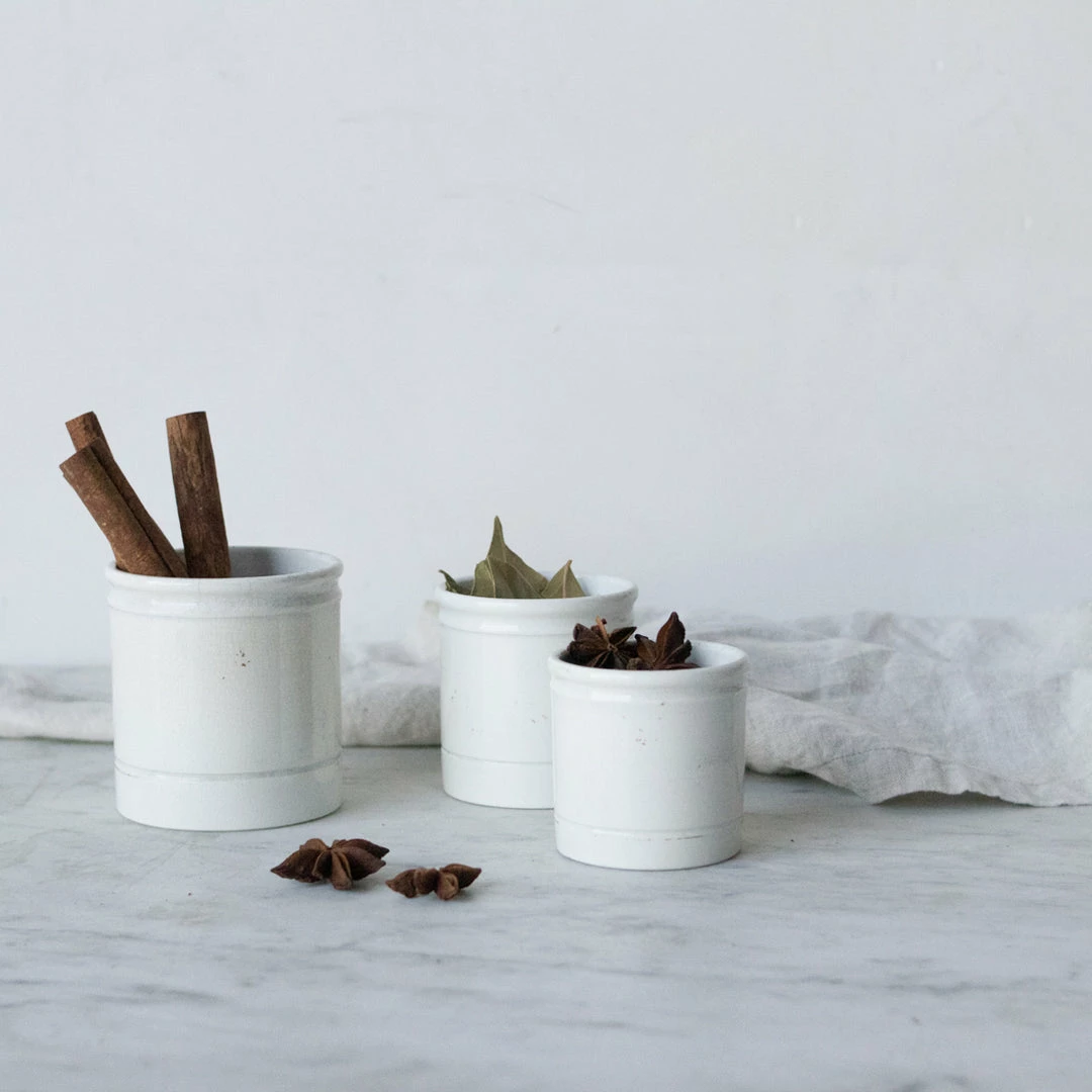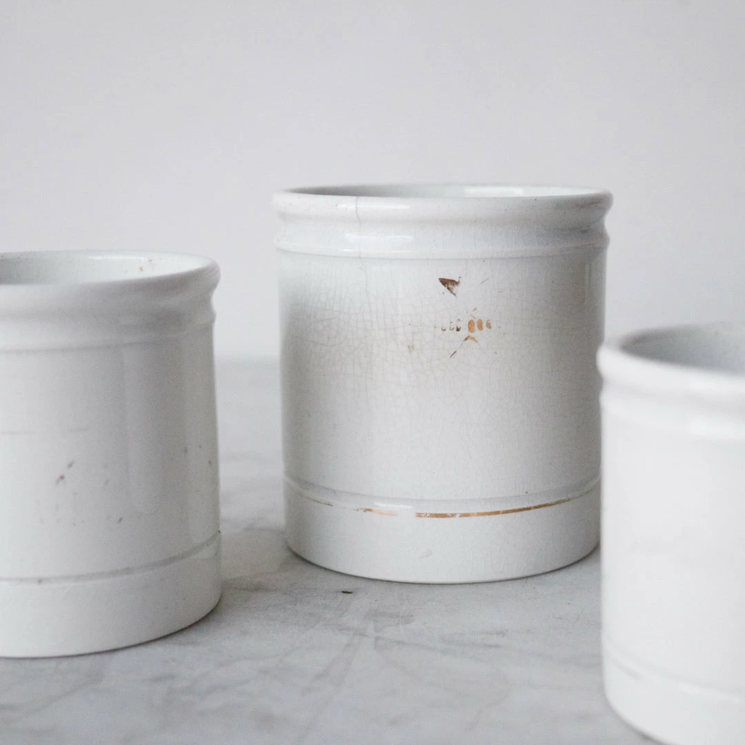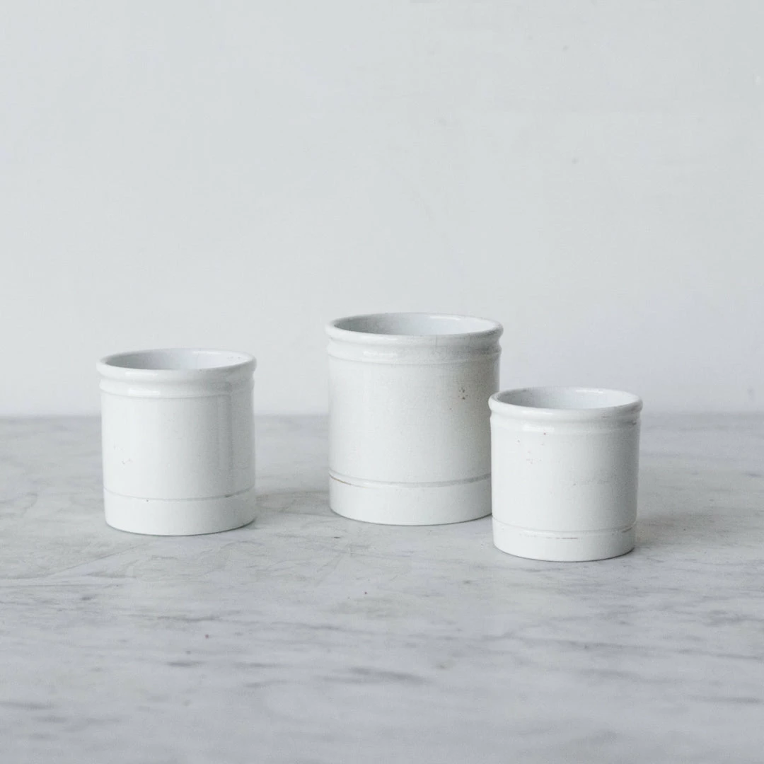 These lovely confiture crocks were once used for storing jam in a French kitchen. Now we think they’re lovely little cachepots for your herbs, or cellars for salt in your kitchen.