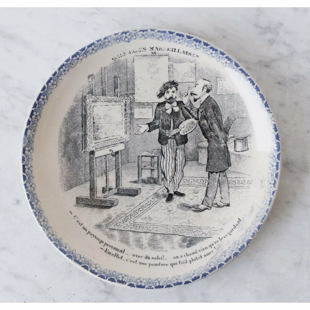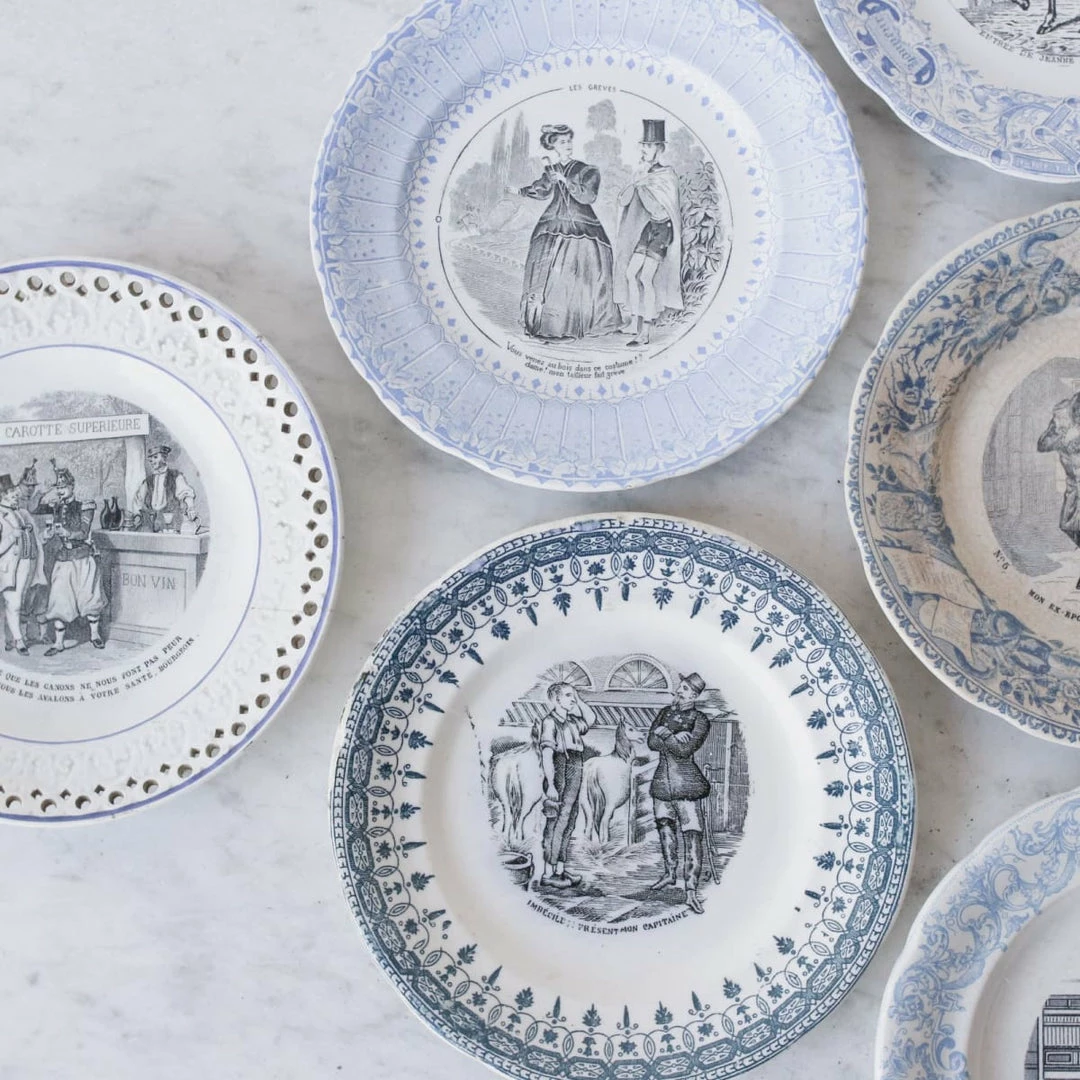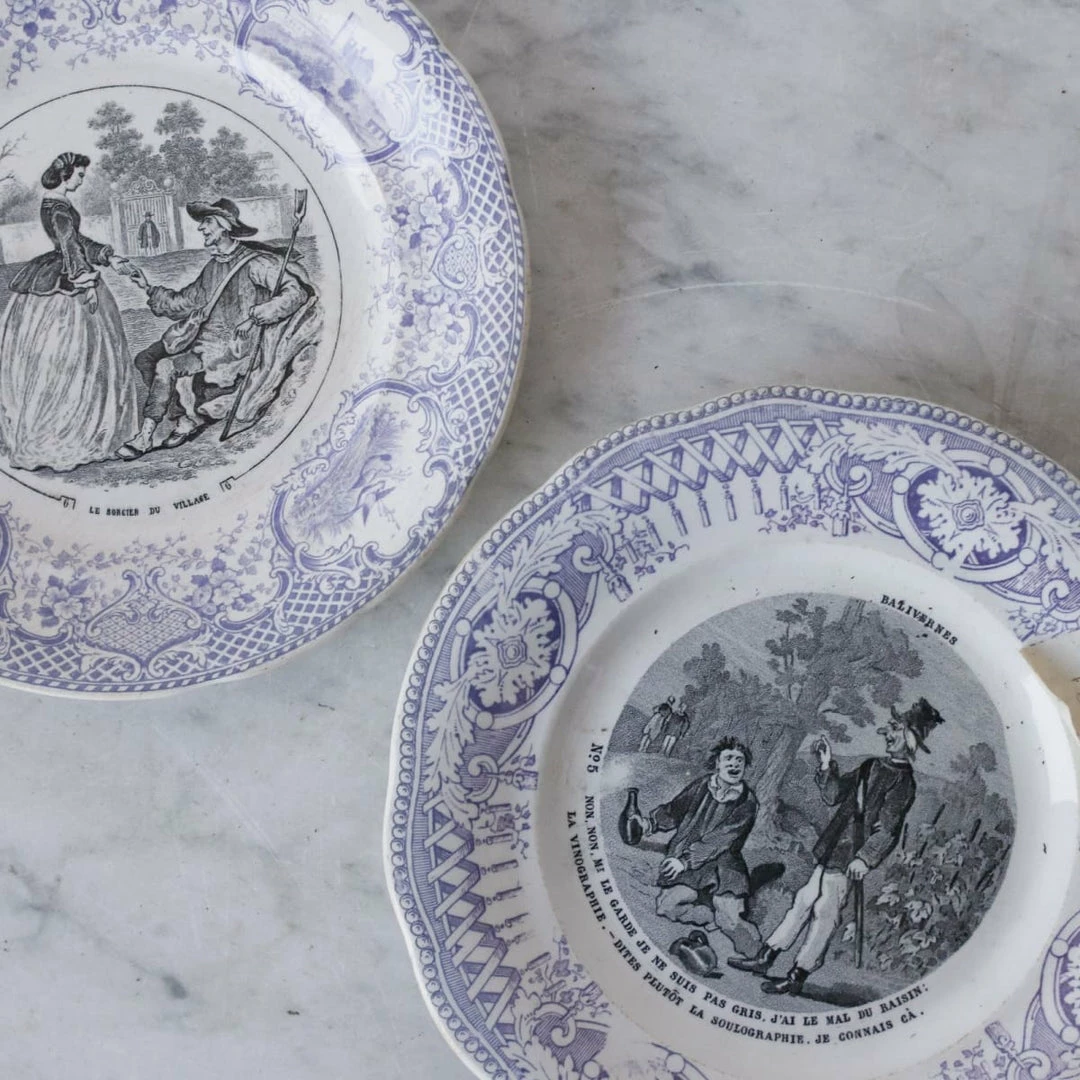 We’re constantly collecting French transferware. These examples are beautifully rendered with colored rims and black conversation patterns in the centers.