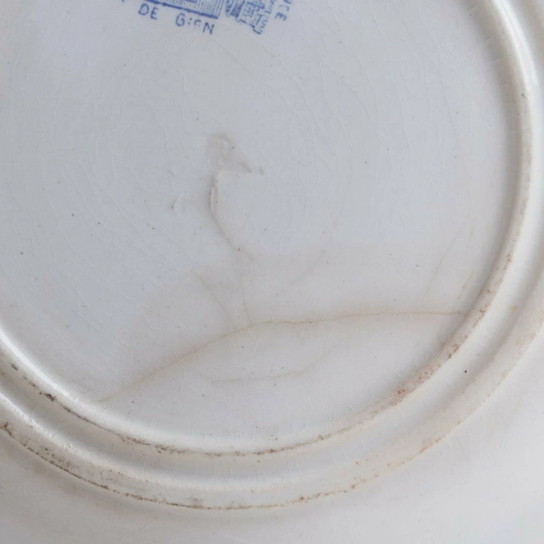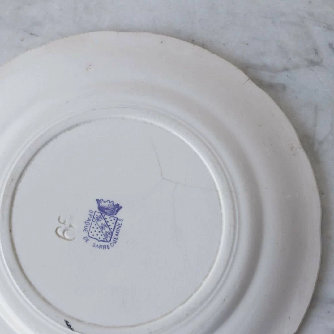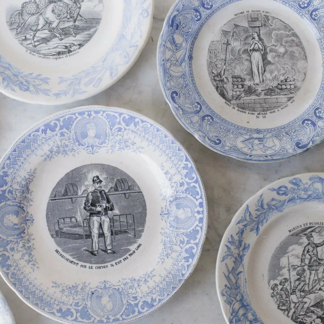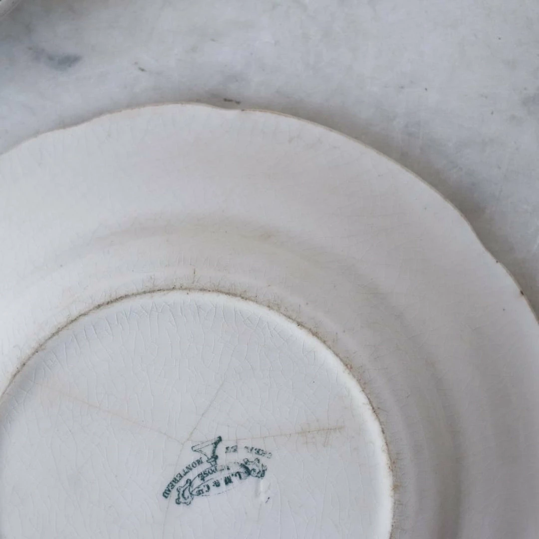 We’re constantly collecting French transferware. These examples are beautifully rendered with colored rims and black conversation patterns in the centers.