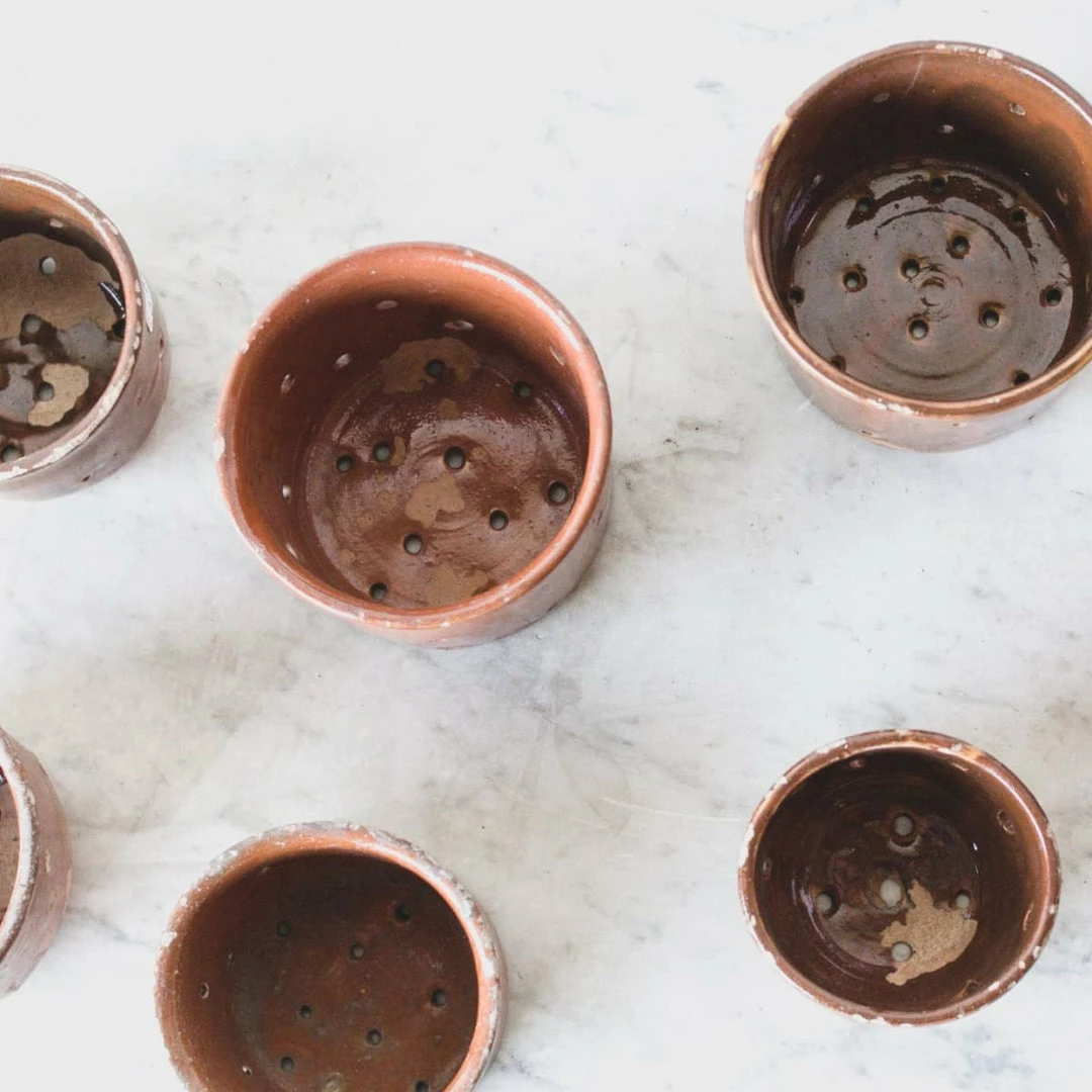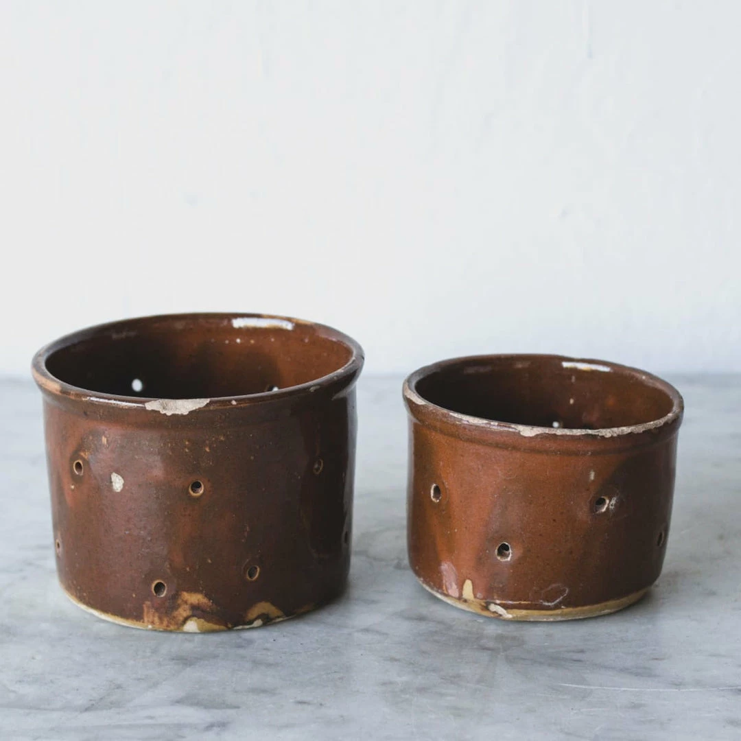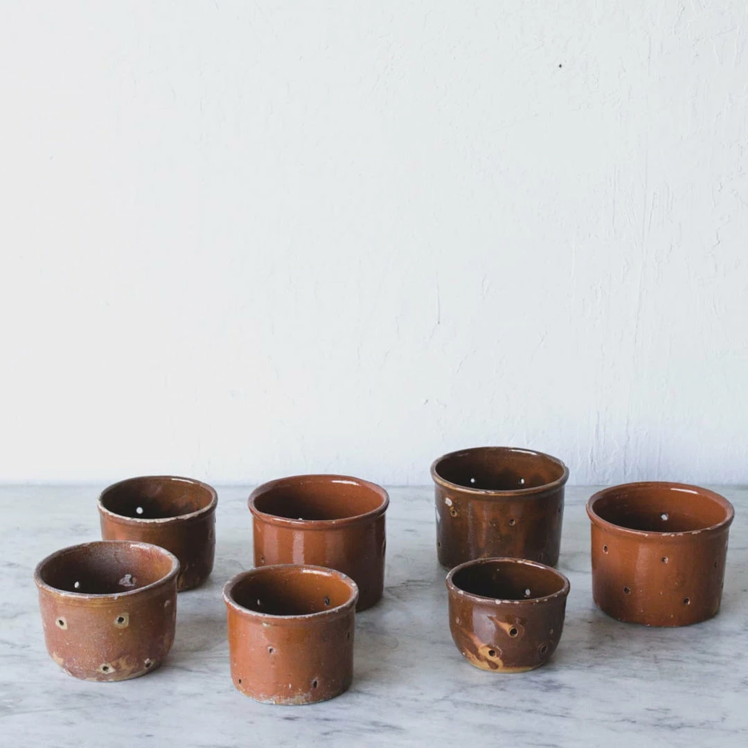 These vintage cheese pots were found in a farmhouse in Chartres, France. ย We don’t make our own cheese, so we like to use them for our candles instead. ย The light shines beautifully through the hand pierced holes.ย ย