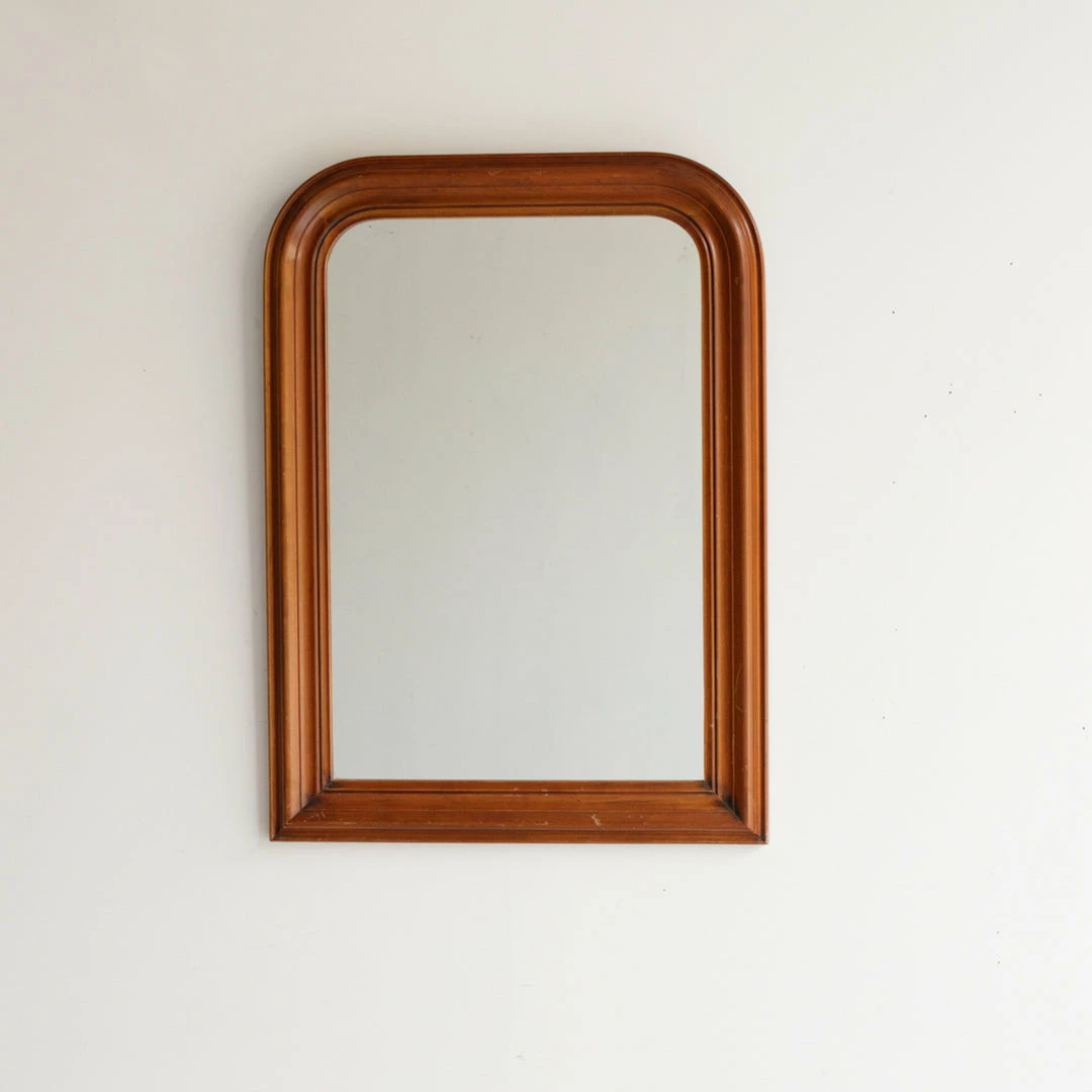 The Louis Philippe style of mirror is one of our favorites, with its soft shoulders at the top and strong corners at the bottom. It’s unusual to find a piece as large as this and even more unusual to find one with a natural wood finish.