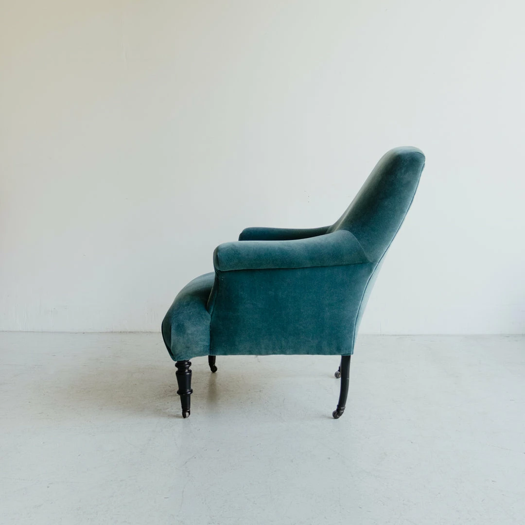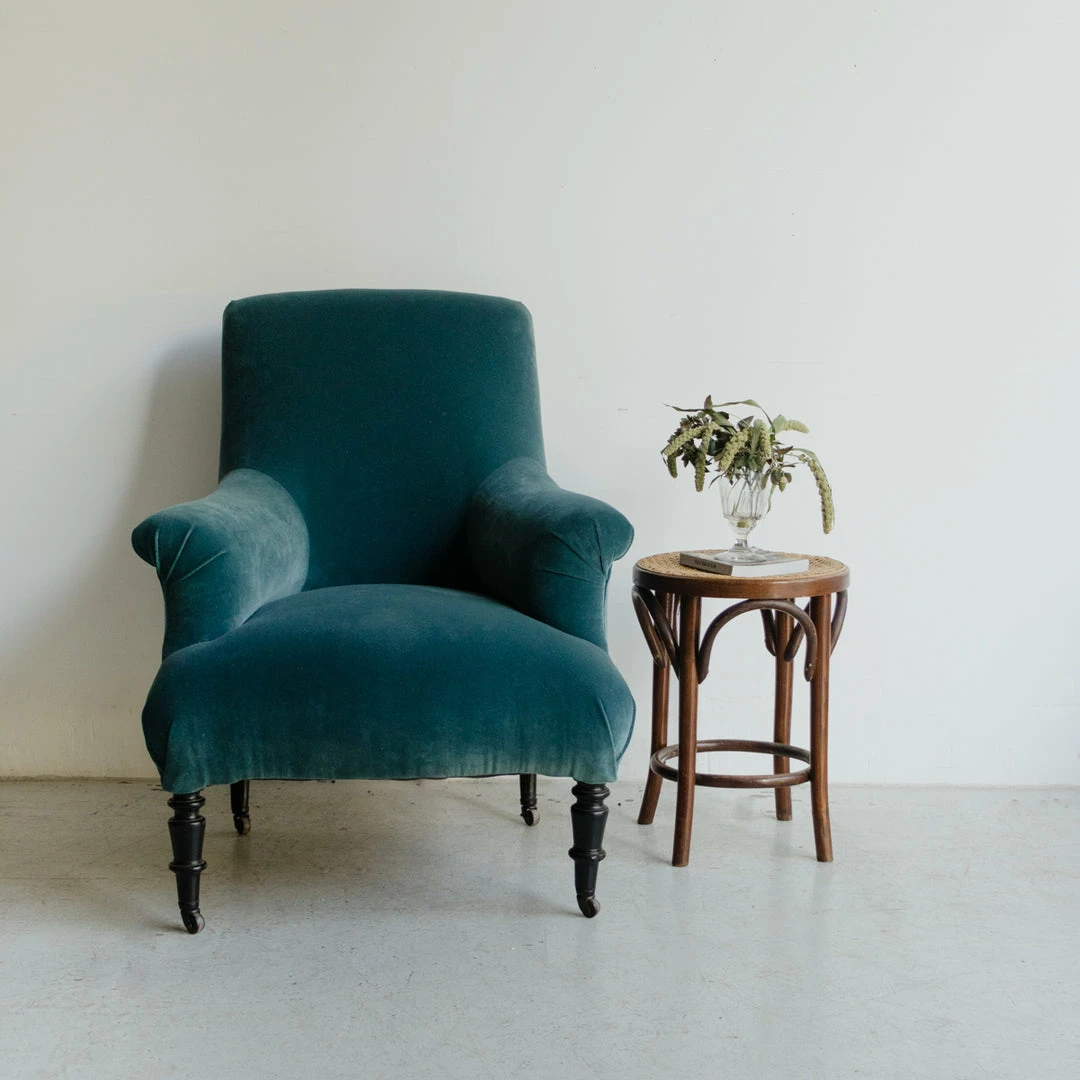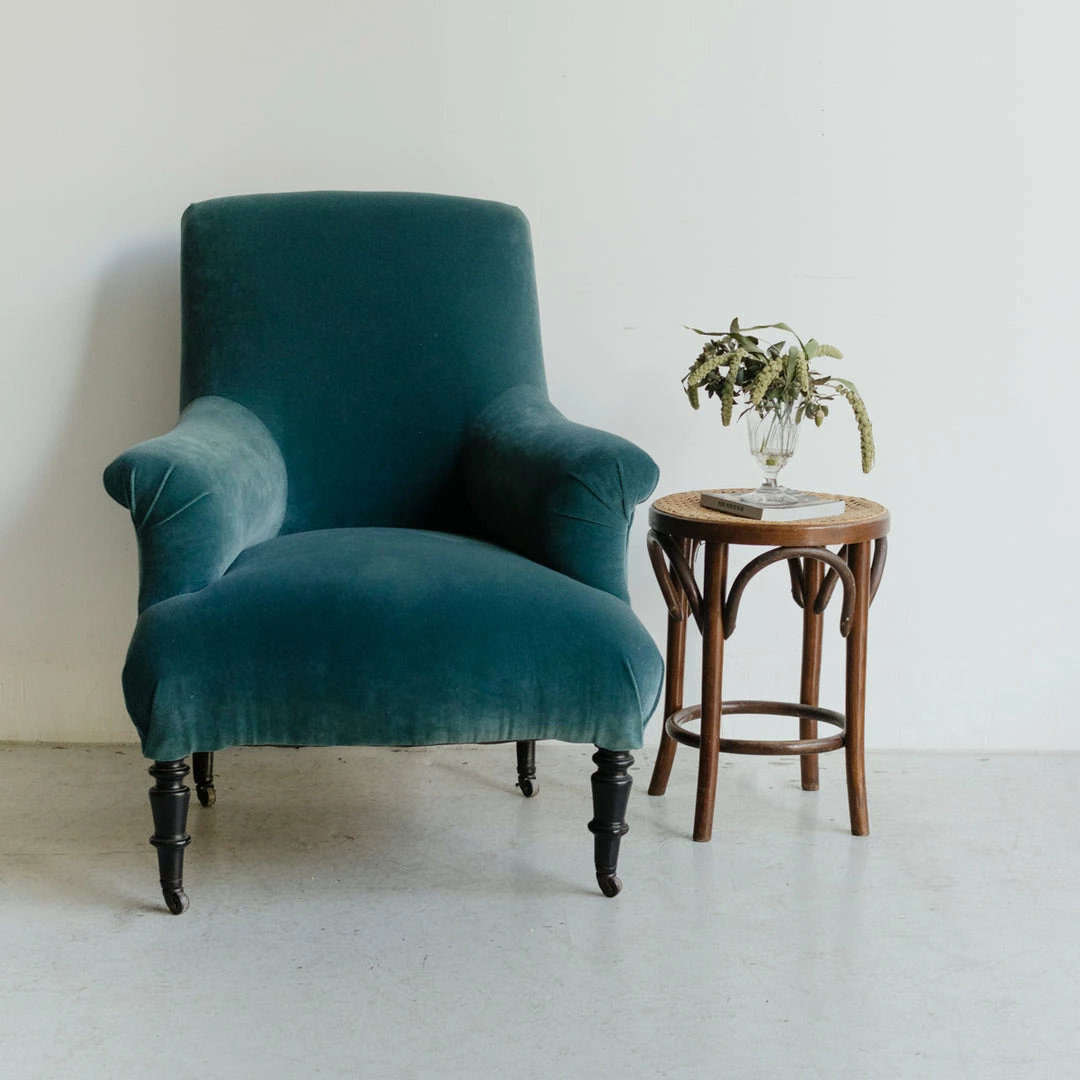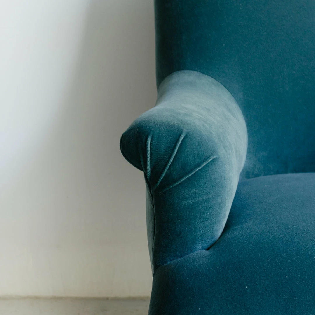 We love the high back and pleated arms of this beautiful vintage Napoleon chair. It’s the perfect stage for the lovely, simple velvet we’ve chosen.