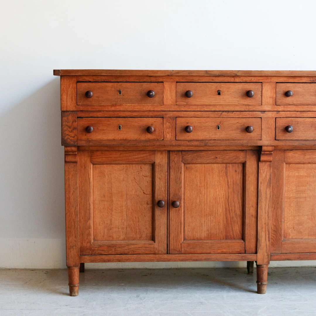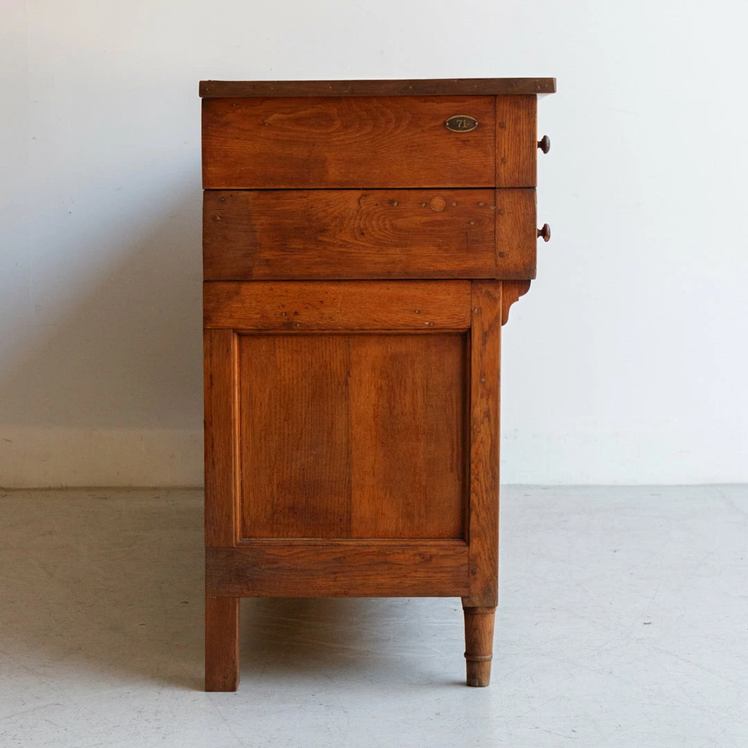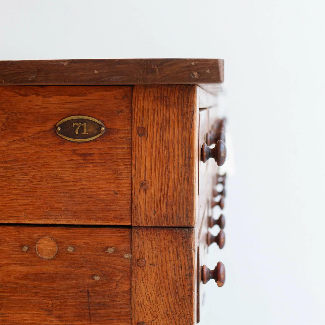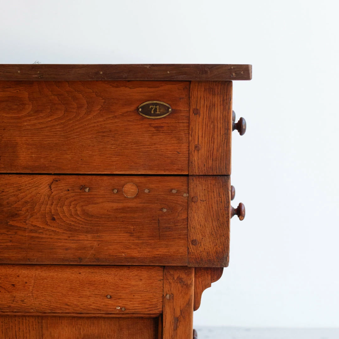 This cabinet was once used in a French salon de coiffure. It’s been fully restored in France, but retains its vintage charm with mis-matched door and drawer handles that have been replaced over the years, exposed peg joinery, and a brass plaque with the number 71 on one side.