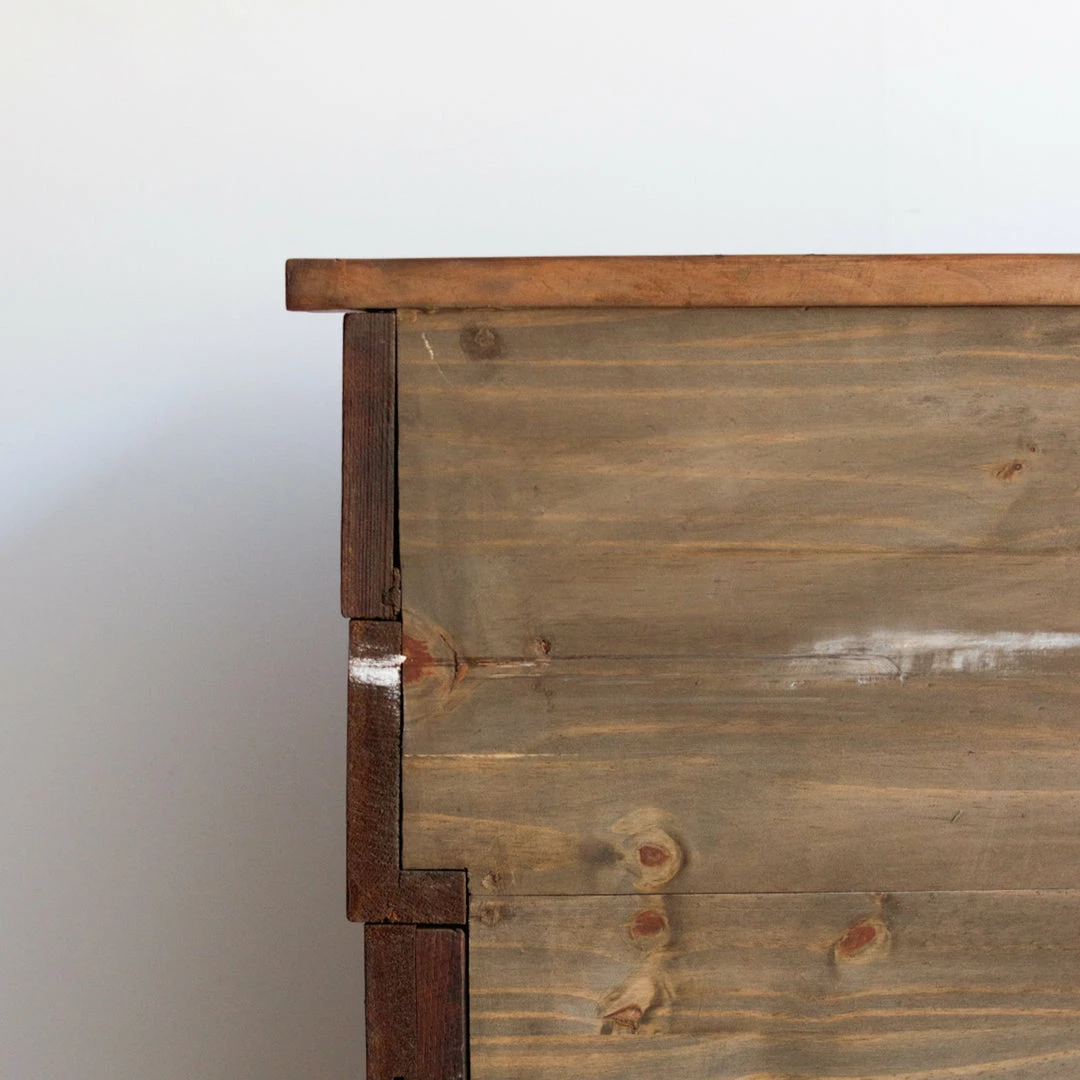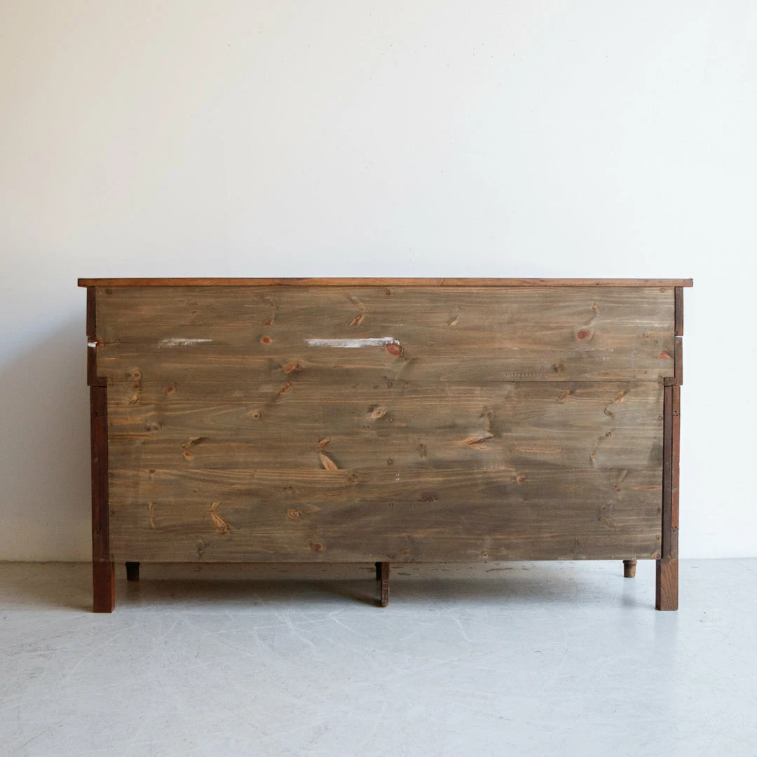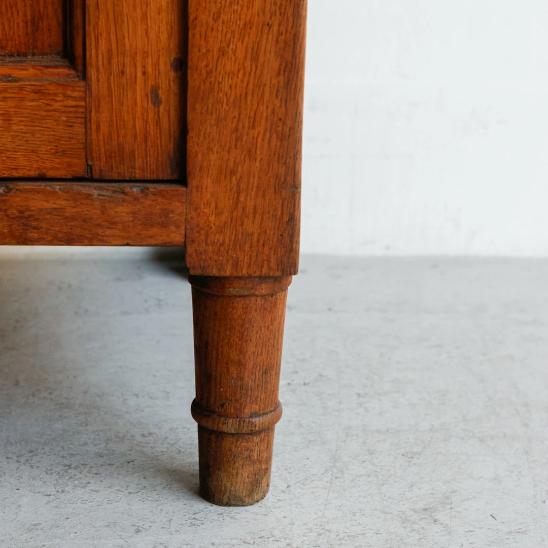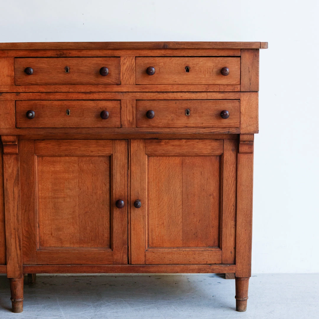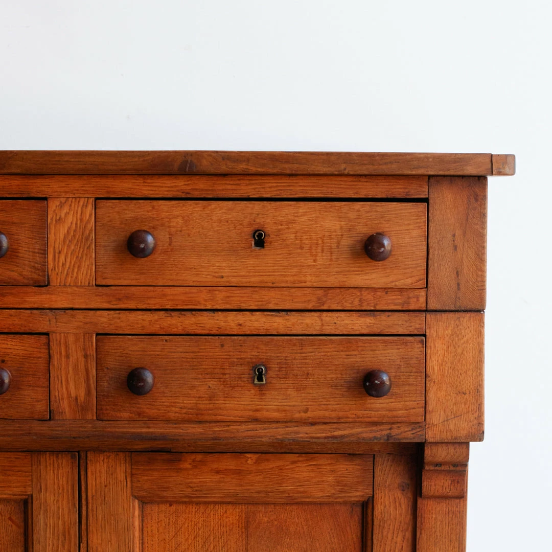 This cabinet was once used in a French salon de coiffure. It’s been fully restored in France, but retains its vintage charm with mis-matched door and drawer handles that have been replaced over the years, exposed peg joinery, and a brass plaque with the number 71 on one side.