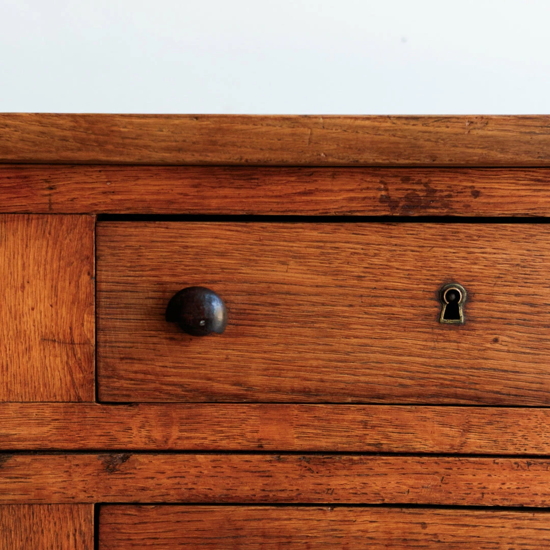 - Eight drawers. Keys have long ago been lost, but seven of the drawers open and close without keys. The eighth is locked forever.