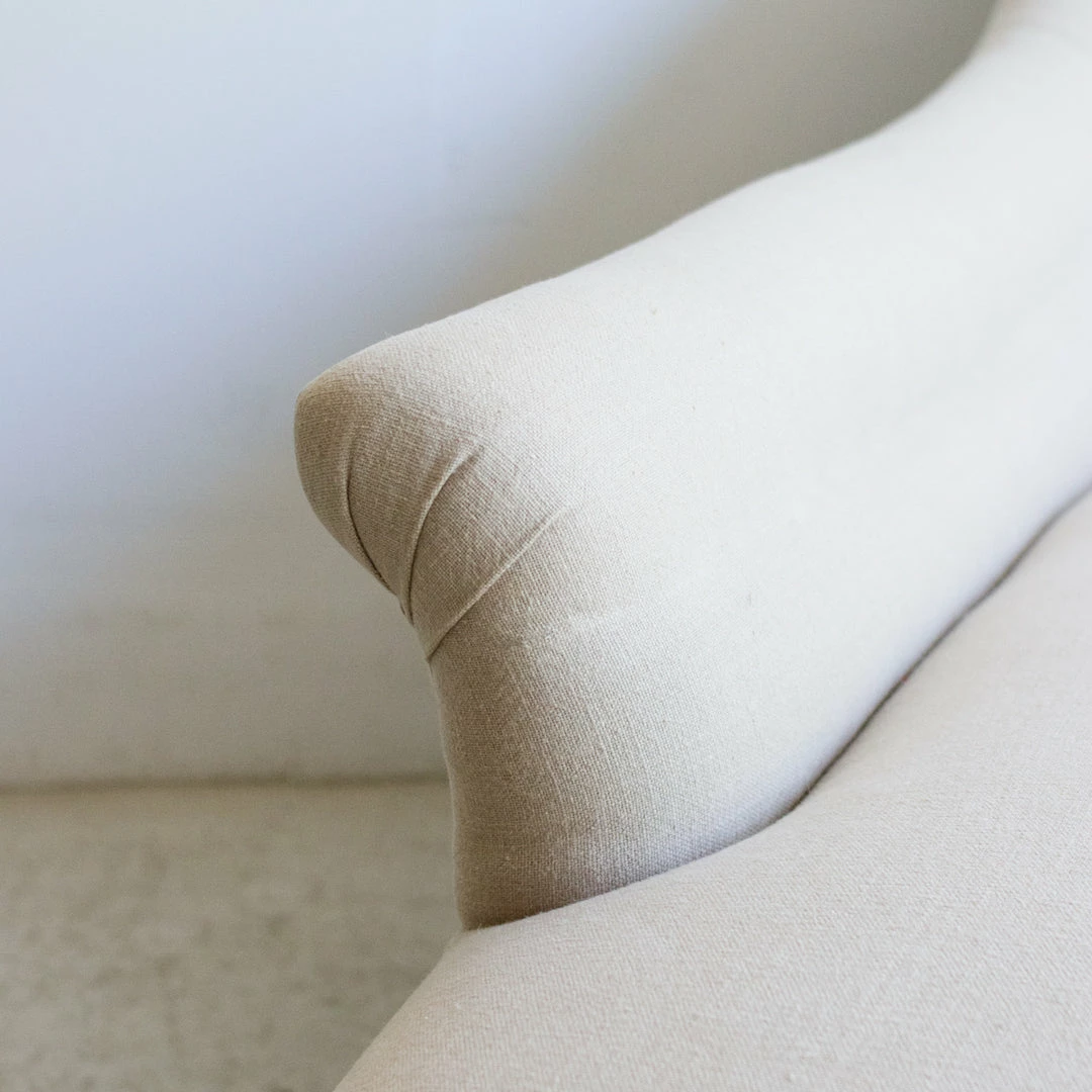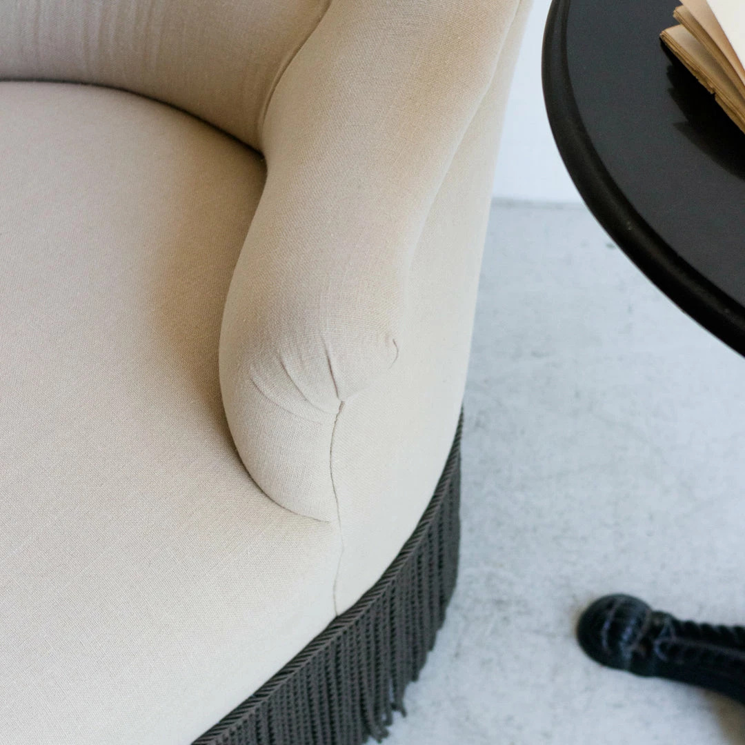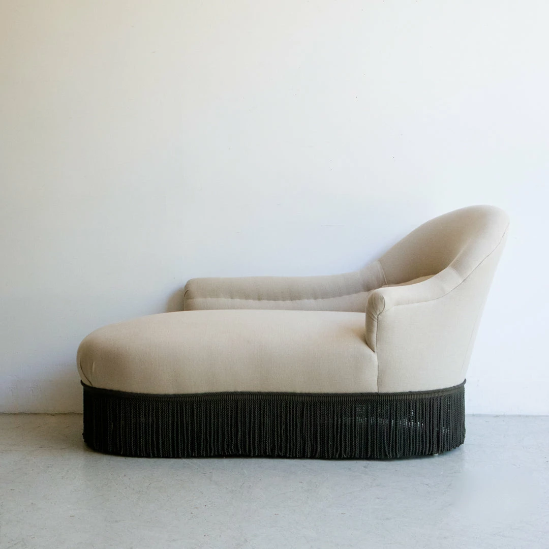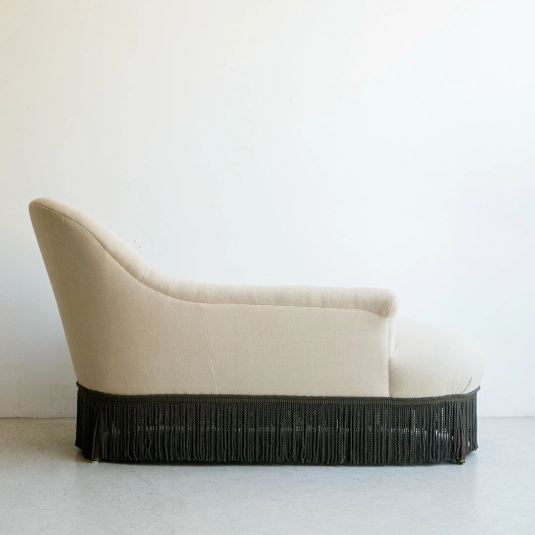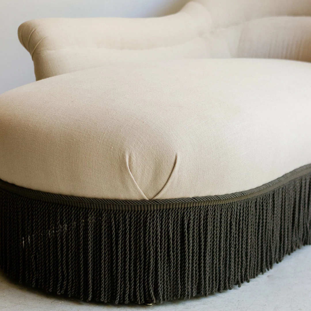 This upholstered chaise was once used in a French boudoir for resting between callers. We’ve beautifully restored it and re-covered it in a flax linen with dramatic long fringe.