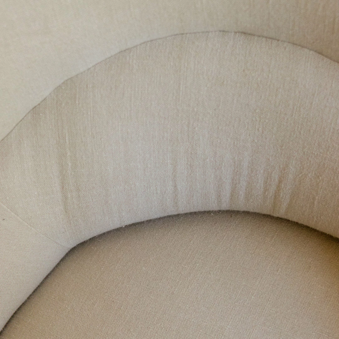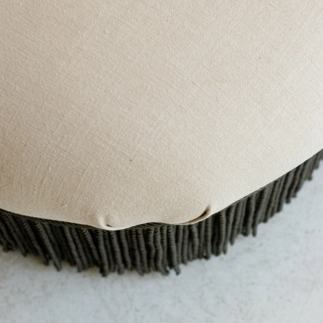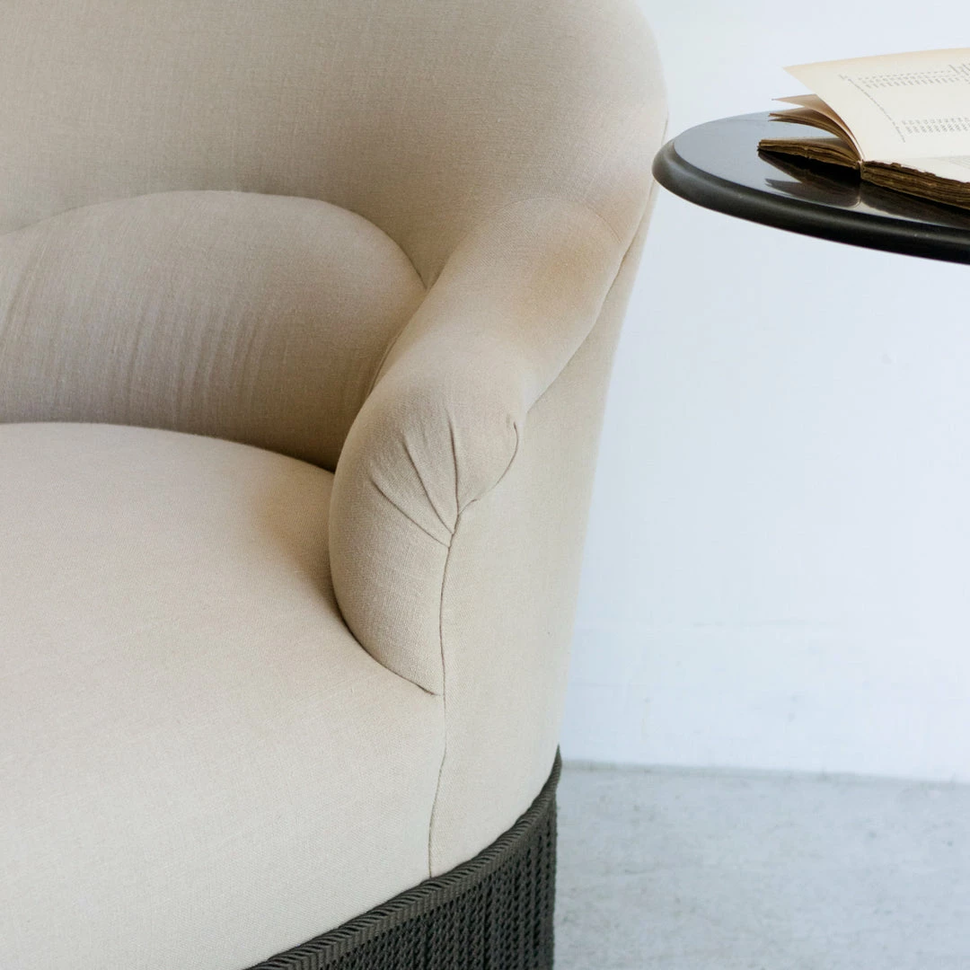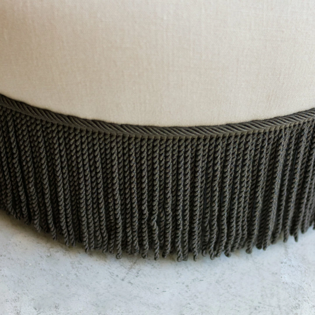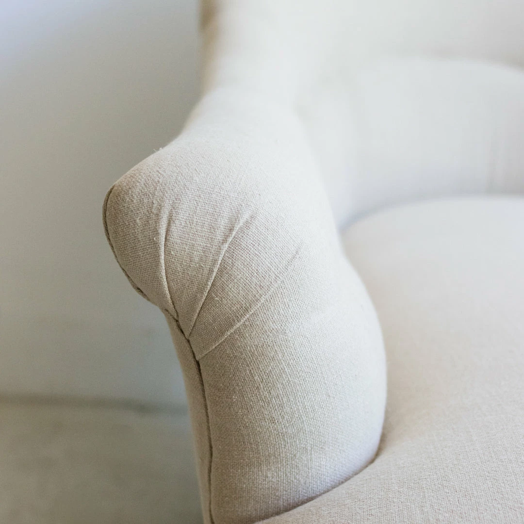 This upholstered chaise was once used in a French boudoir for resting between callers. We’ve beautifully restored it and re-covered it in a flax linen with dramatic long fringe.
