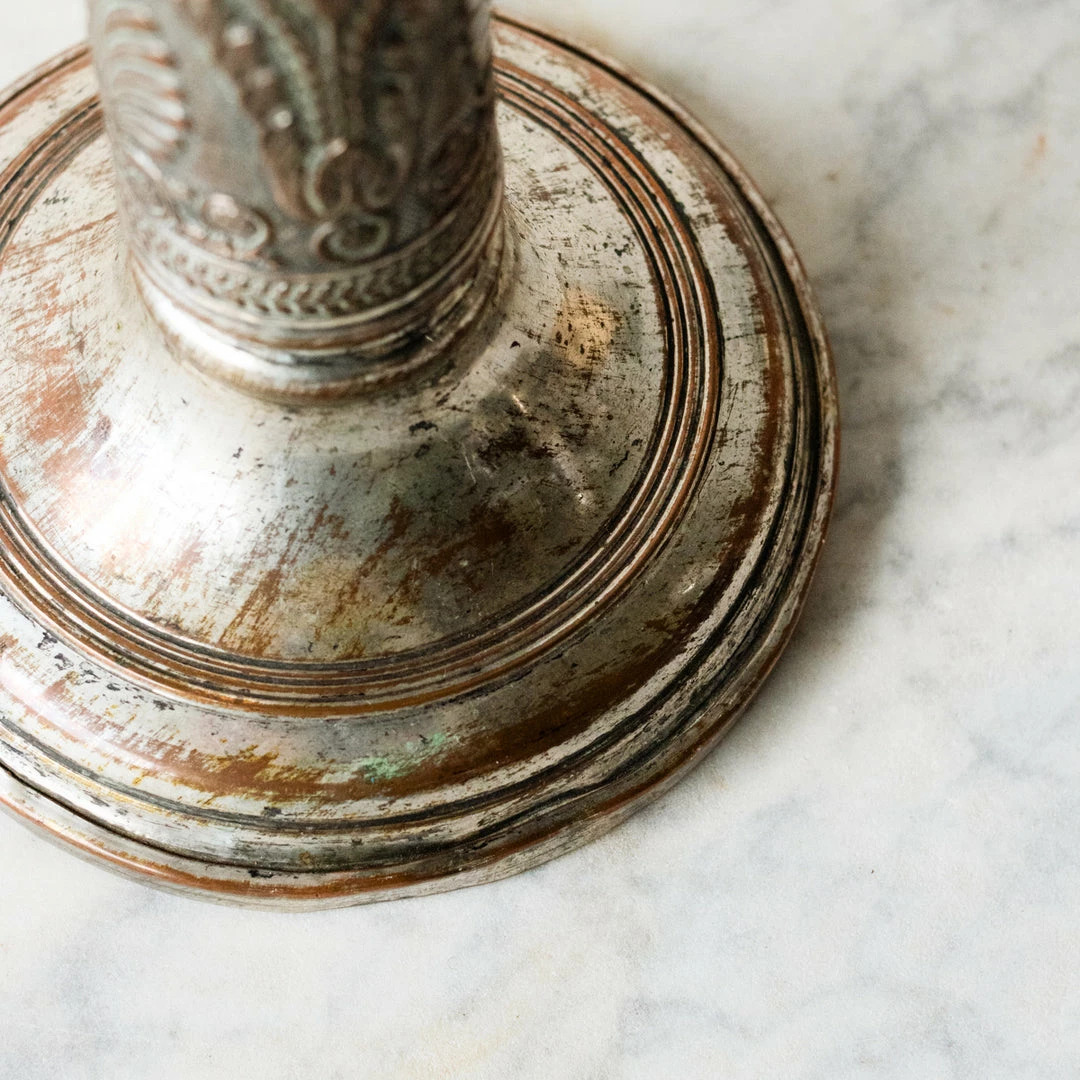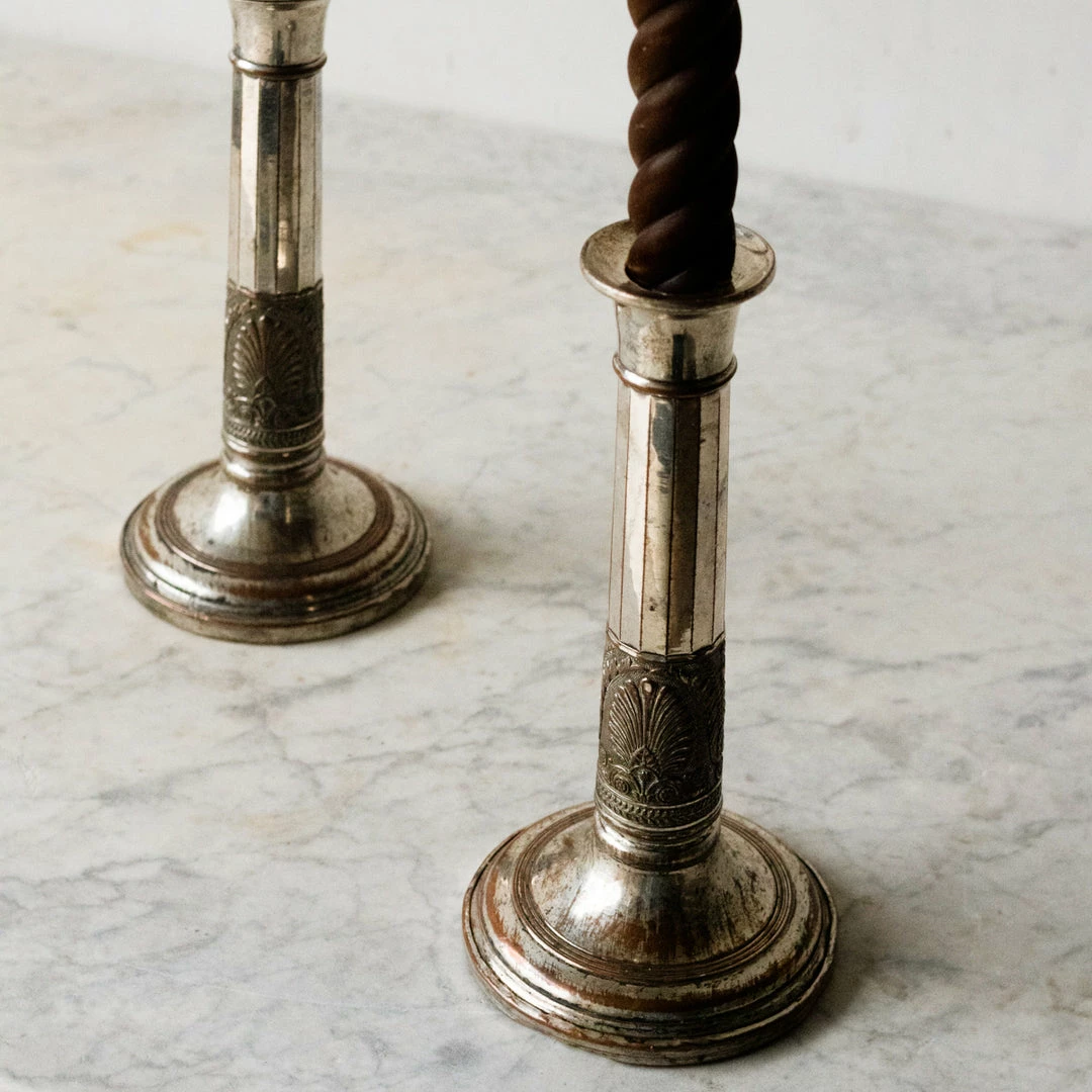 We found these vintage silver candlesticks embossed with intricate acanthus leaves in a flea market in Lyon. They silver is burnished with a glow that only comes with time and use. A matched pair like this is a rare find.