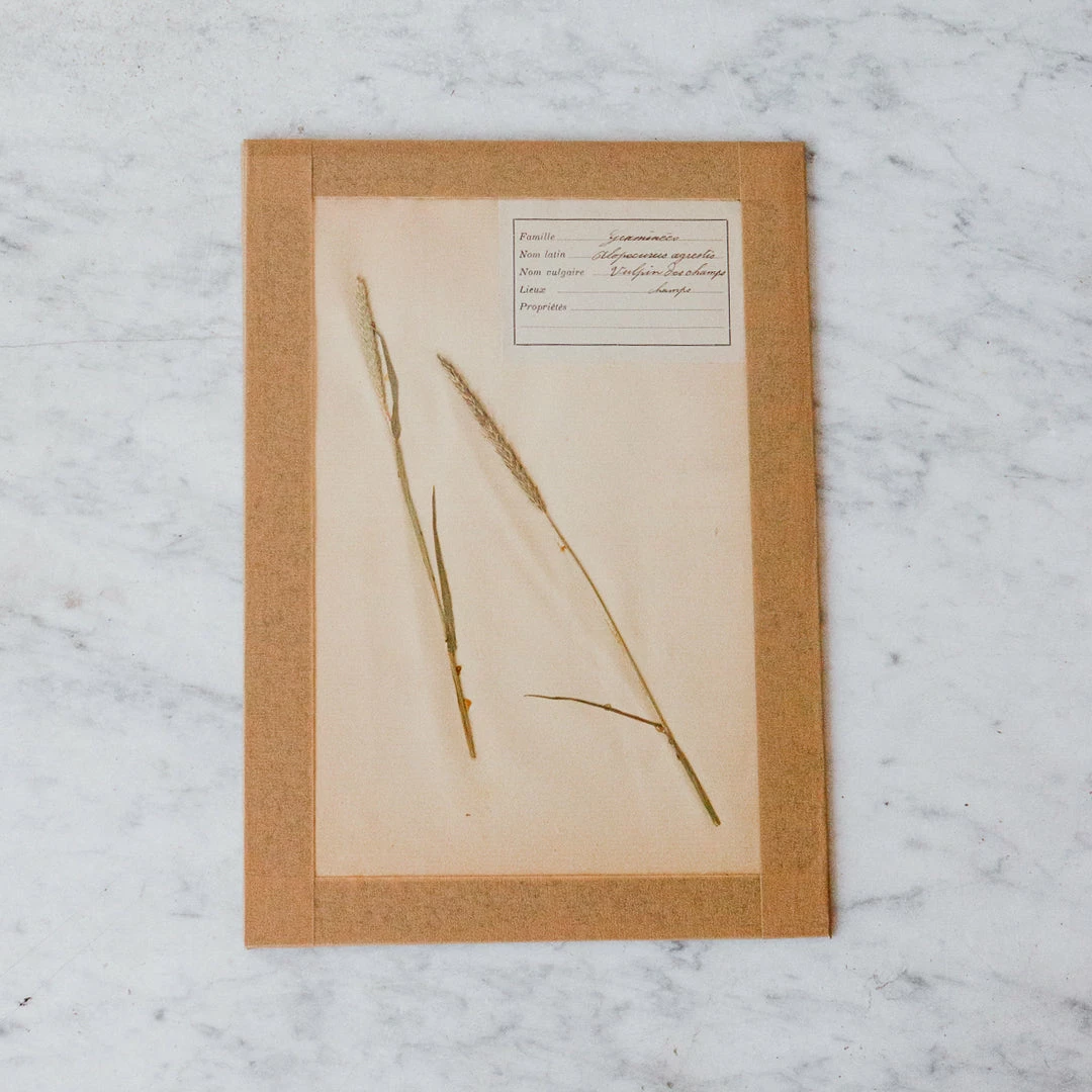 Each of these pressed botanicals was once a page in a French botanist’s journal. We collected them from an agricultural school in Haute-Loire. Each has a dried specimen and hand script written in French language.