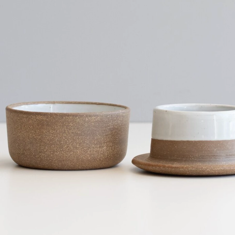 The French use this clever vessel in place of a classic butter dish to keep their butter fresh and spreadable on the counter top.Β Put a bit of water in the bowl, pack your butter into the top, and the water creates a seal that keeps the butter fresh.Β It’s the perfect blend of form and function.Β