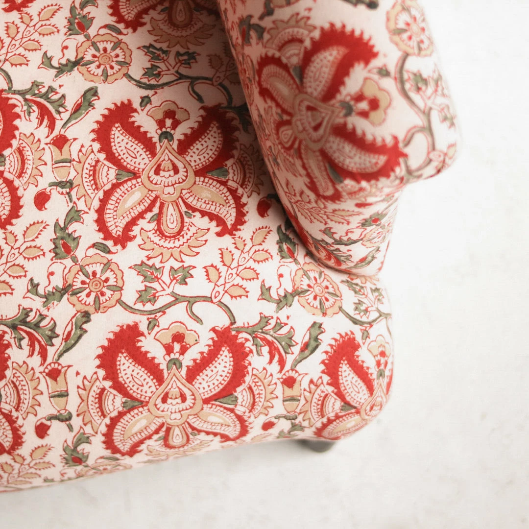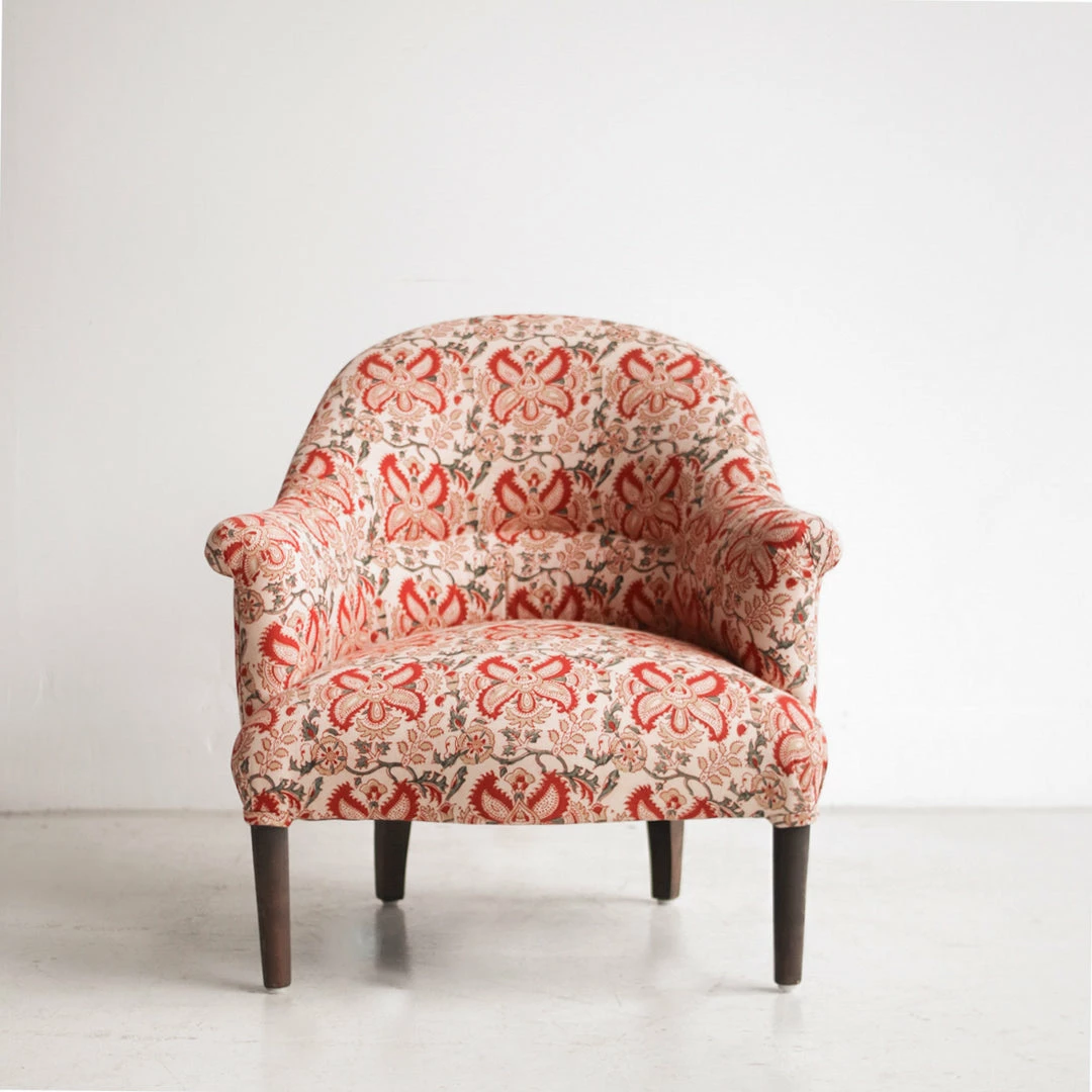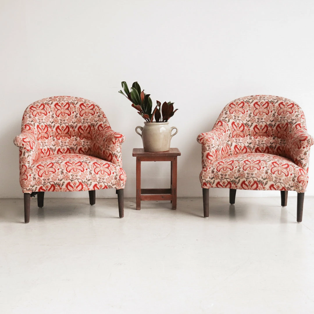We found this cute set of twins in a flea market in Chartres.ย They’ve been carefully restored and re-upholstered in organic cotton, hand printed block print fabric.ย We love the intricate pattern of the block print.ย ย