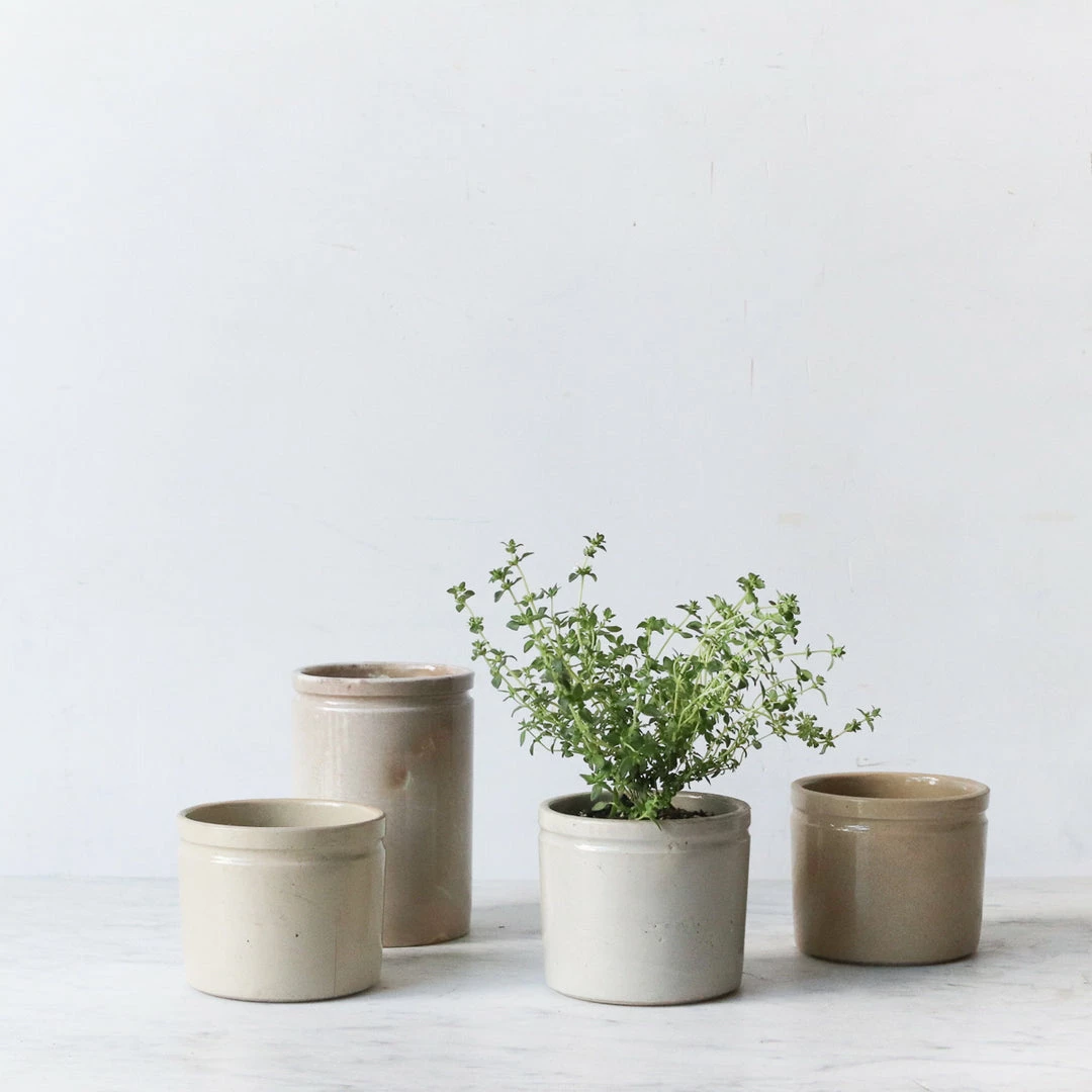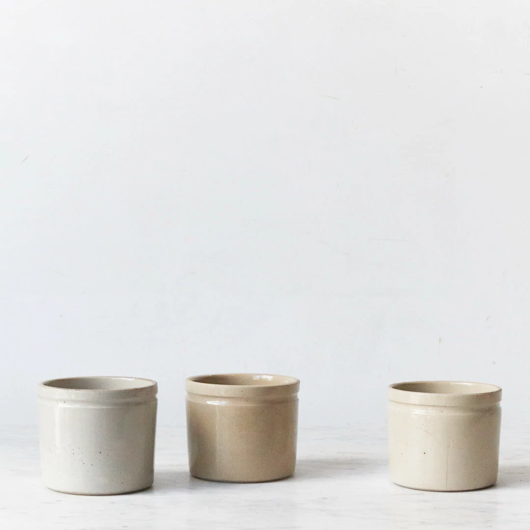 These lovely confiture crocks were once used for storing jam in a French kitchen. Now we think they’re lovely little cachepots for your herbs, or cellars for salt in your kitchen.