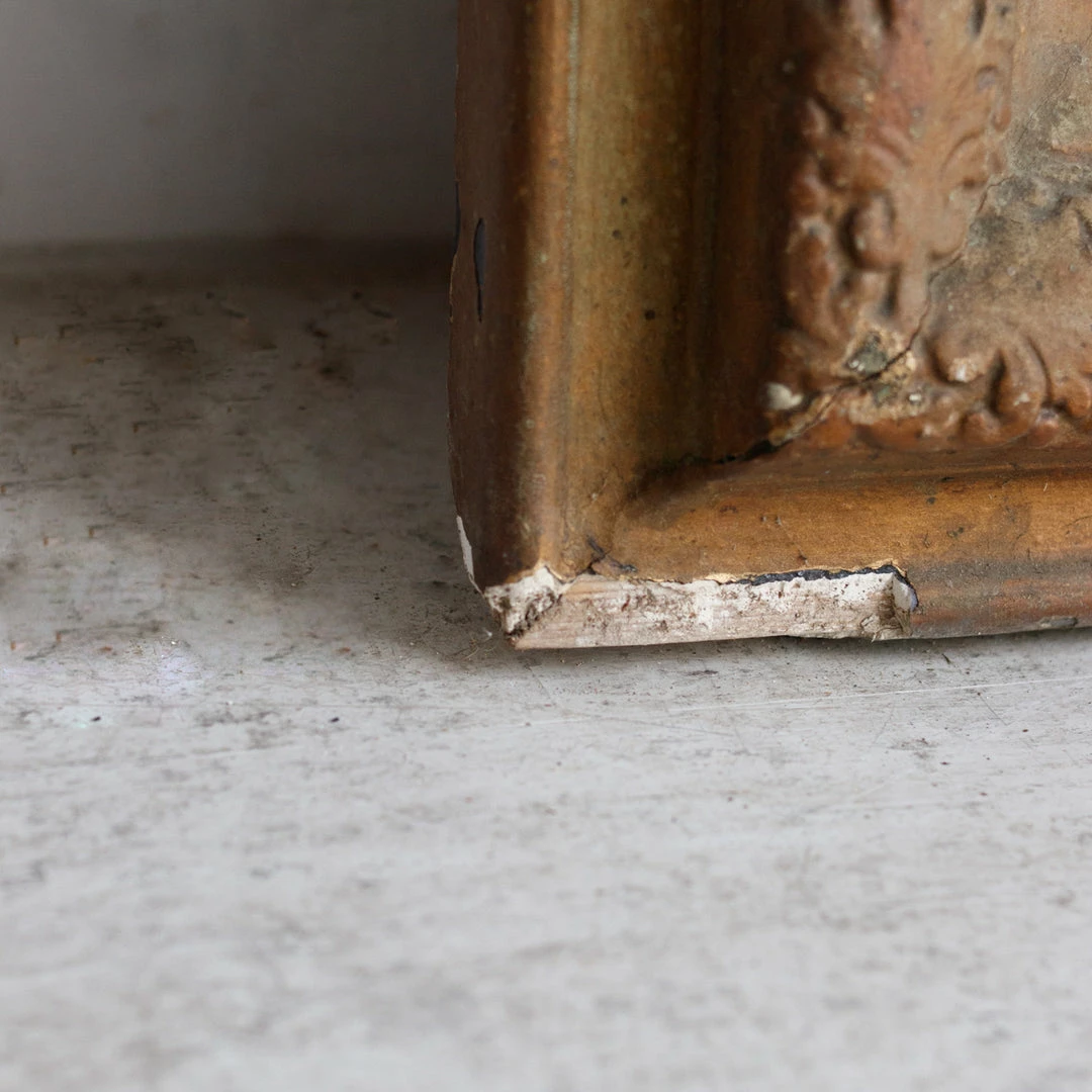 - Smooth wood and plaster frame, gilded and waxed with soft decorative detail